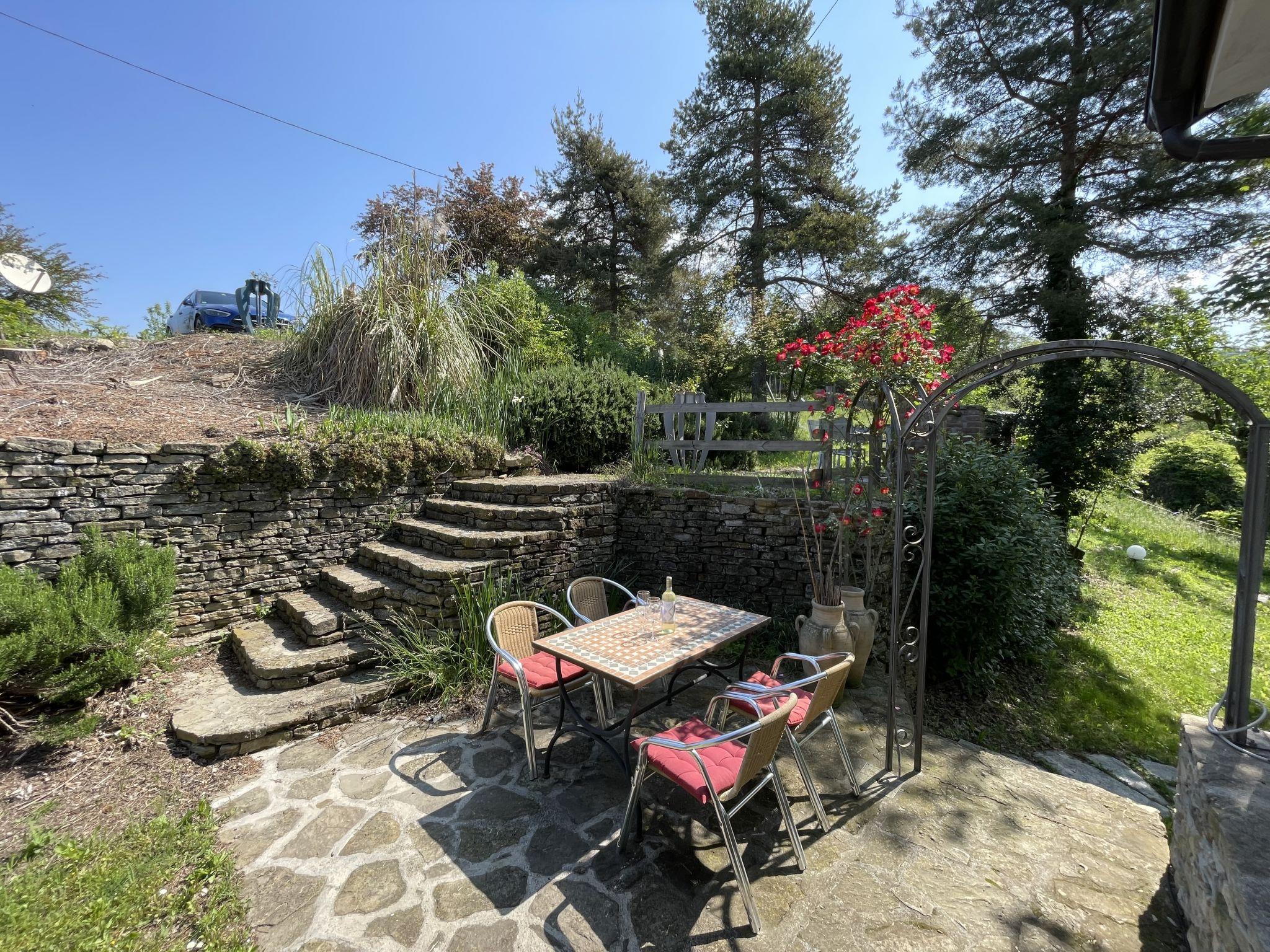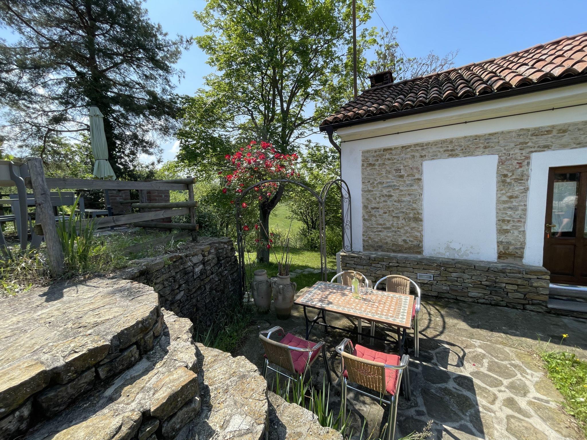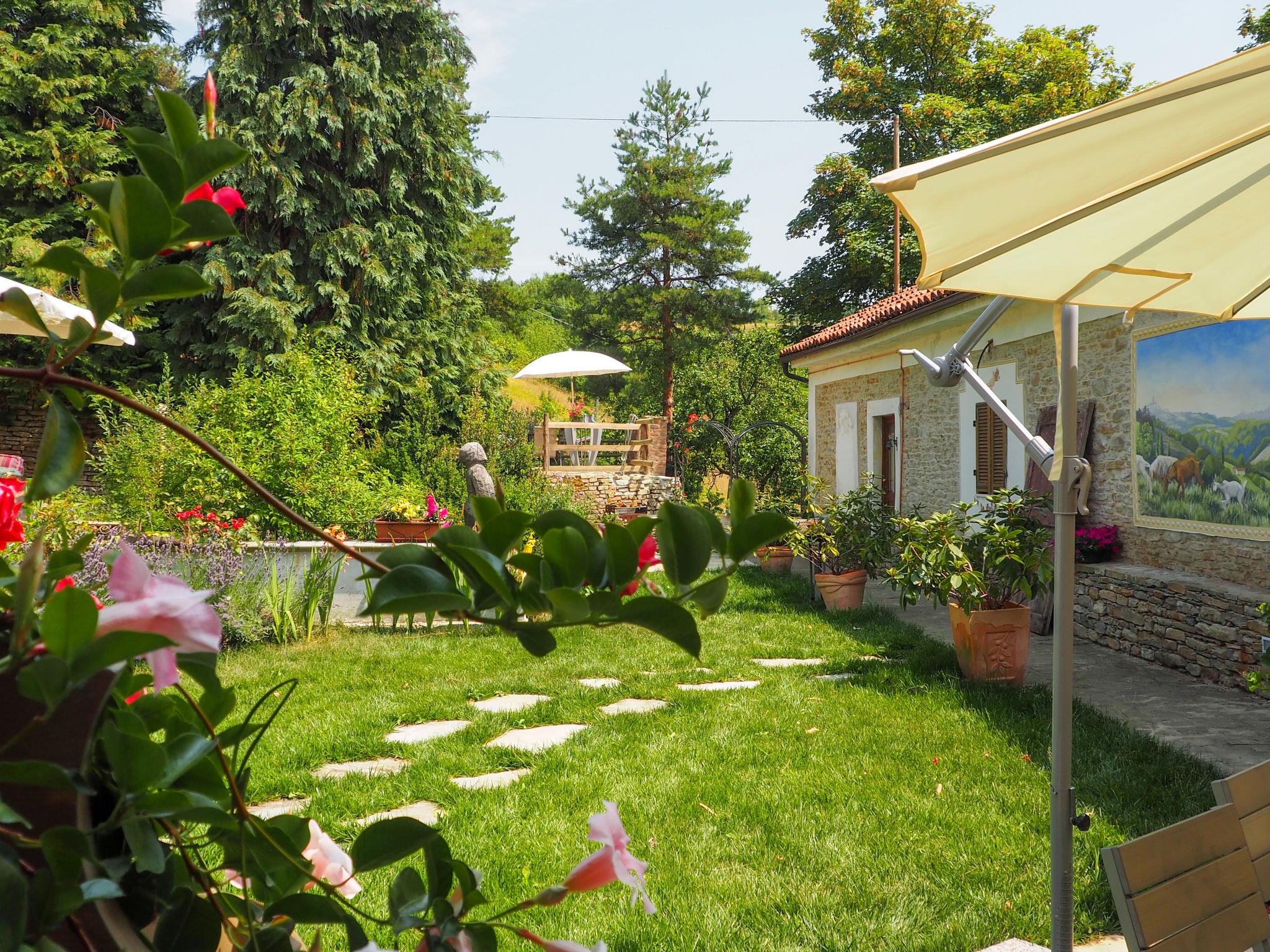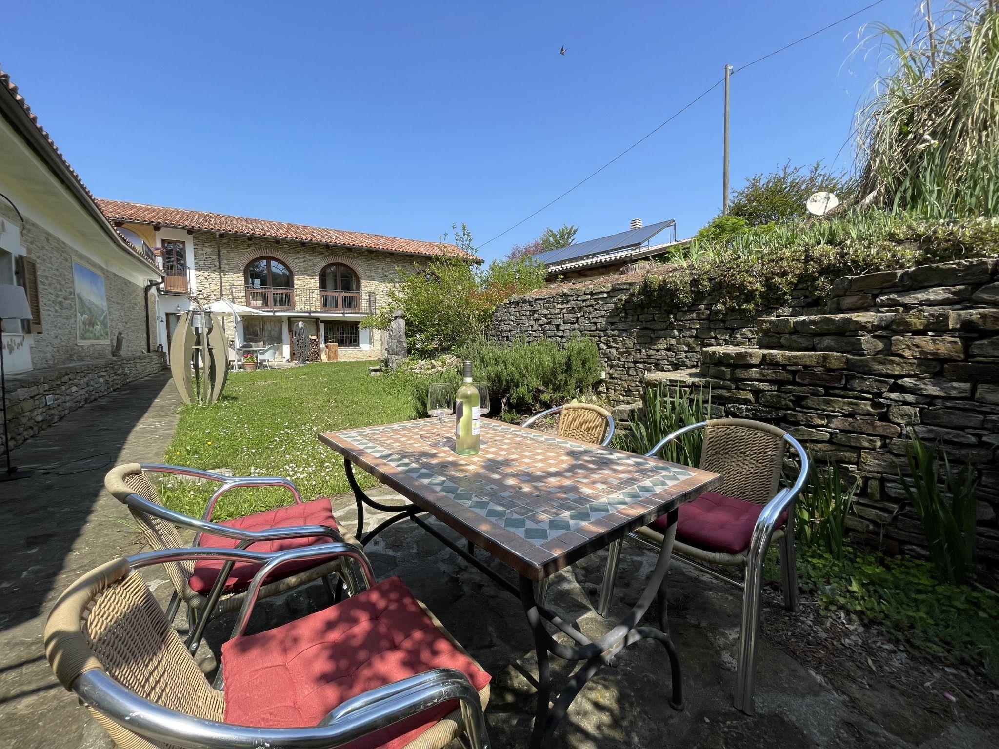 House "Casa Vacanza Cascina Lovera", 650 m a.s.l., surrounded by meadows, fields and vineyards. 4 apartments in the property. 3 km from the centre of Murazzano, 10 km from the centre of Dogliani, 20 km from the centre of Barolo, in a secluded position on a slope, 56 km from the sea. For shared use: property 15'000 m2, terraced garden (not fenced) with lawn and plants, natural garden, swimming pool (8 x 4 m, depth 140 cm, seasonal availability: 01.May. - 03.Oct.). Outdoor shower, terrace, garden furniture, planted inner courtyard pool maintenance by the owner/gardener. In the house: table football. Parking at the house on the premises. E-charging station. Shop 3 km, supermarket 10 km, bus stop 200 m, railway station "Bra" 34 km. Please note: the owner lives on the same property.