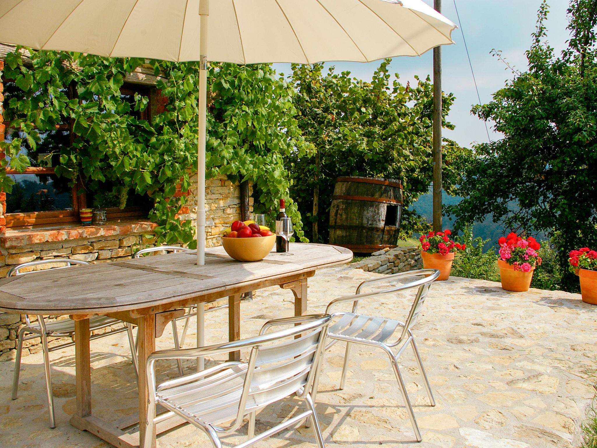 House "Casa Vacanza Cascina Lovera", 650 m a.s.l., surrounded by meadows, fields and vineyards. 4 apartments in the property. 3 km from the centre of Murazzano, 10 km from the centre of Dogliani, 20 km from the centre of Barolo, in a secluded position on a slope, 56 km from the sea. For shared use: property 15'000 m2, terraced garden (not fenced) with lawn and plants, natural garden, swimming pool (8 x 4 m, depth 140 cm, seasonal availability: 01.May. - 03.Oct.). Outdoor shower, terrace, garden furniture, planted inner courtyard pool maintenance by the owner/gardener. In the house: table football. Parking at the house on the premises. E-charging station. Shop 3 km, supermarket 10 km, bus stop 200 m, railway station "Bra" 34 km. Please note: the owner lives on the same property.