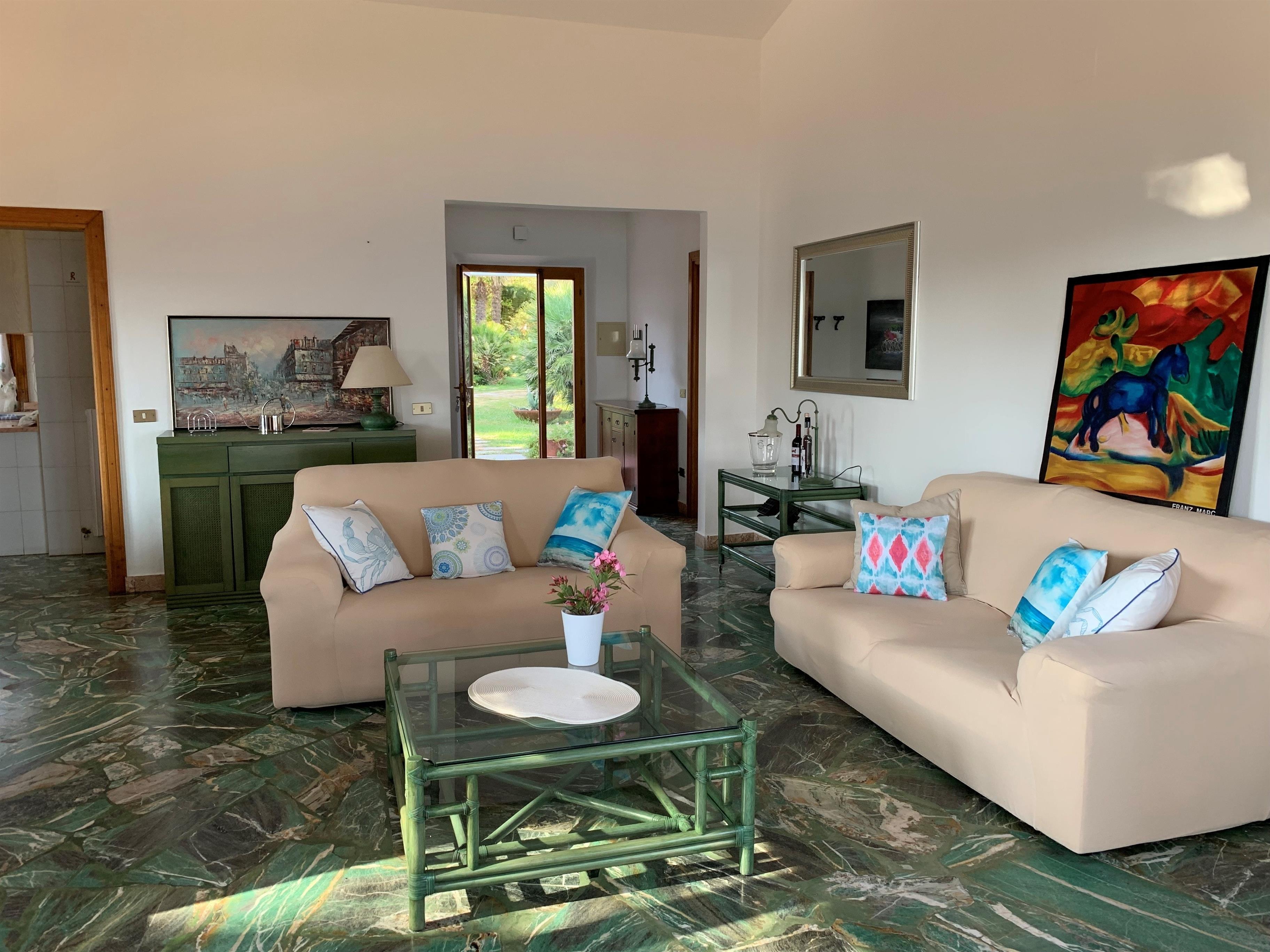Die Einliegerwohnung mit getrenntem Zugang lädt zur Außenterrasse mit Markise, einer Außendusche und einer Außenküche/Grill. Der Wohnbereich hat die Küche integriert und ist neben einem runden Esstisch auch mit einem Schlafsofa ausgestattet. Das Appartamento verfügt über ein getrenntes Badezimmer und zwei Schlafzimmer mit Doppelbetten.