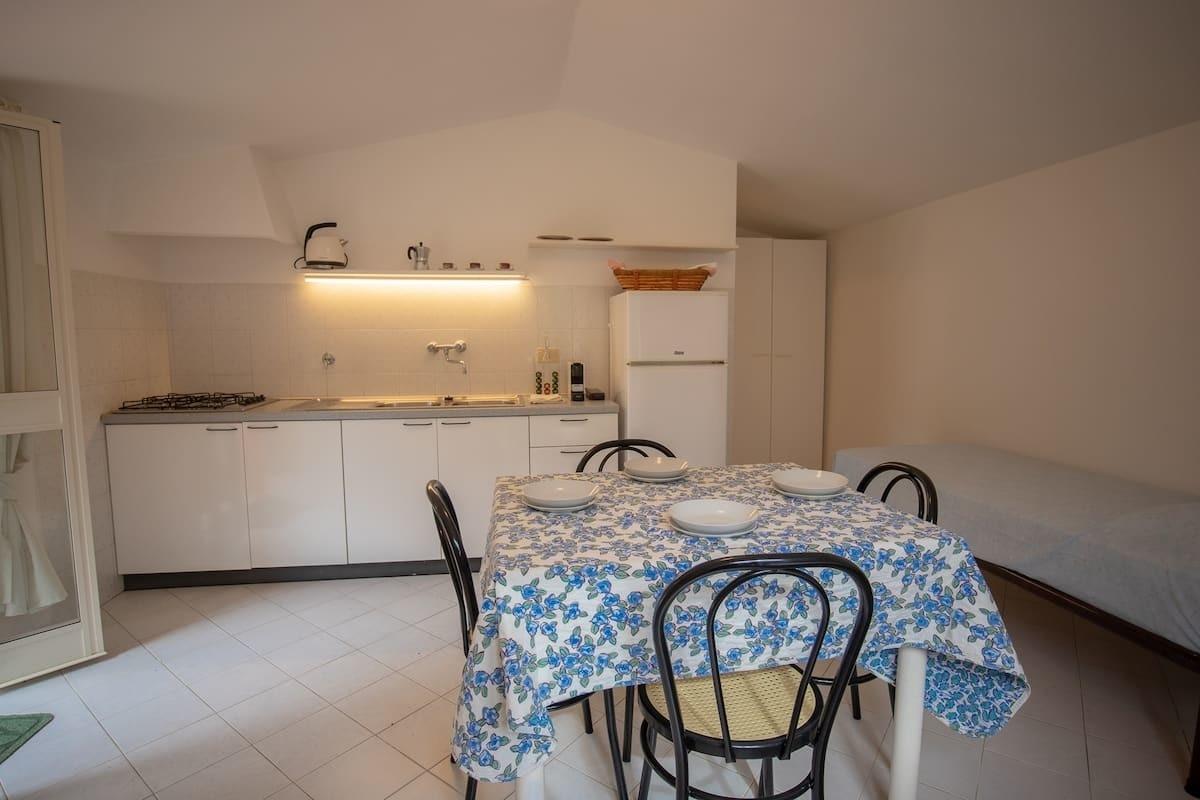 Das von viel Grün umgebene Monolocale bietet Privatsphäre, lädt zur großzügigen Außenterrasse/Pergola. Der Wohnbereich hat die Küche integriert und ist mit 2 Betten ausgestattet. Getrenntes Badezimmer. Ideal für Paare, ggfs mit Haustier.