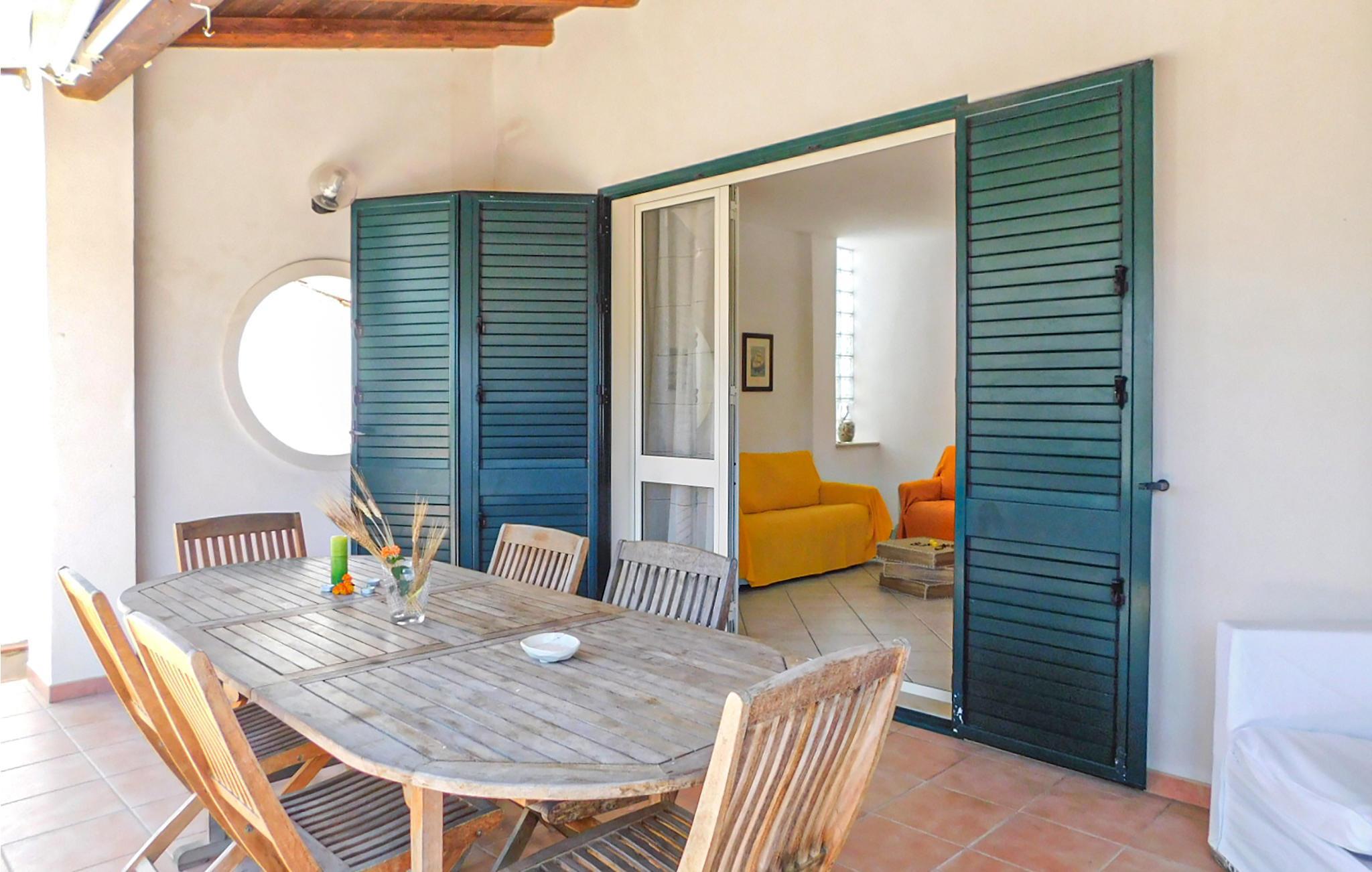 På verandaen kan I slappe af og nyde vejret udendørs, mens I kigger ned til havet.