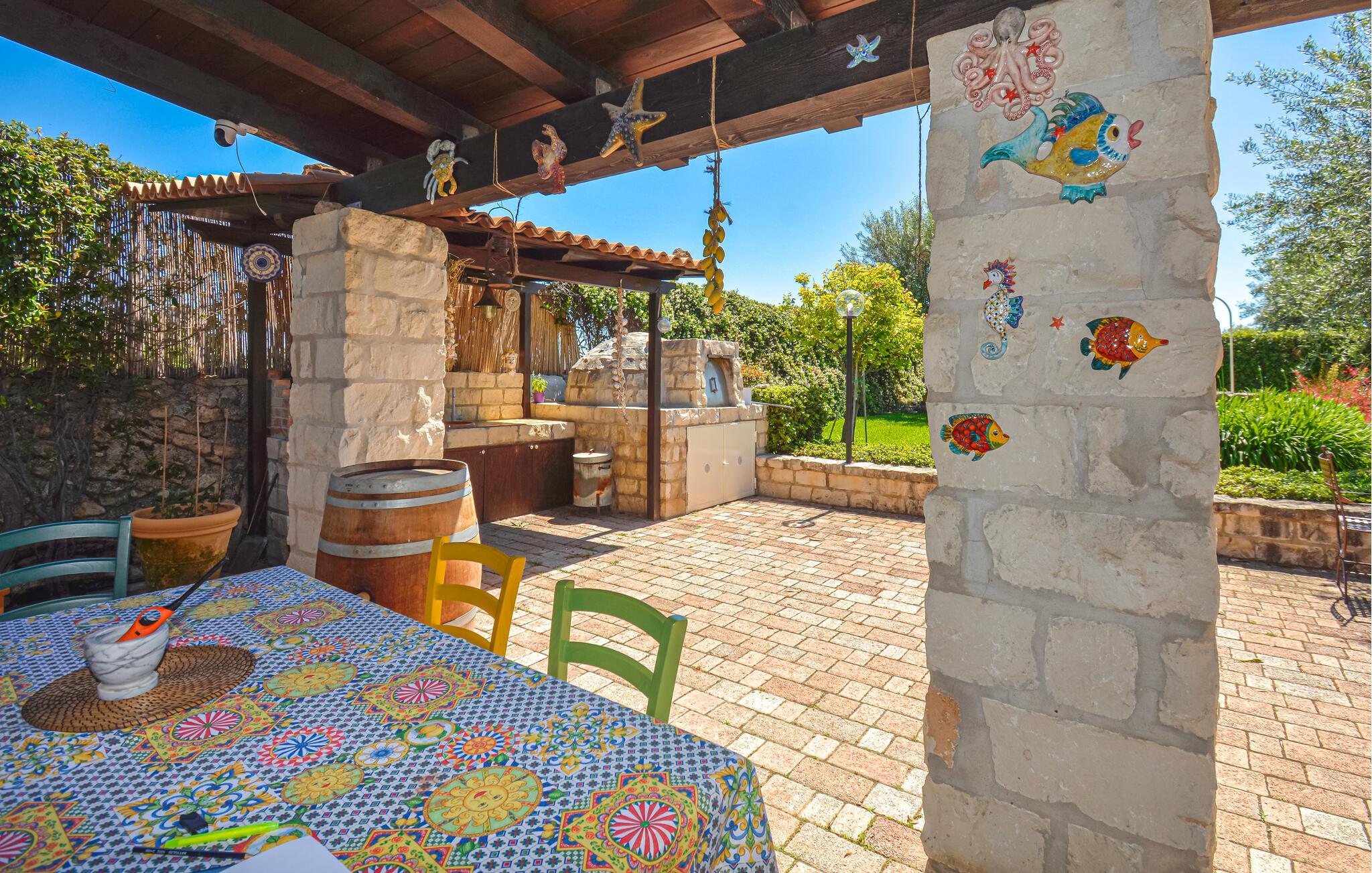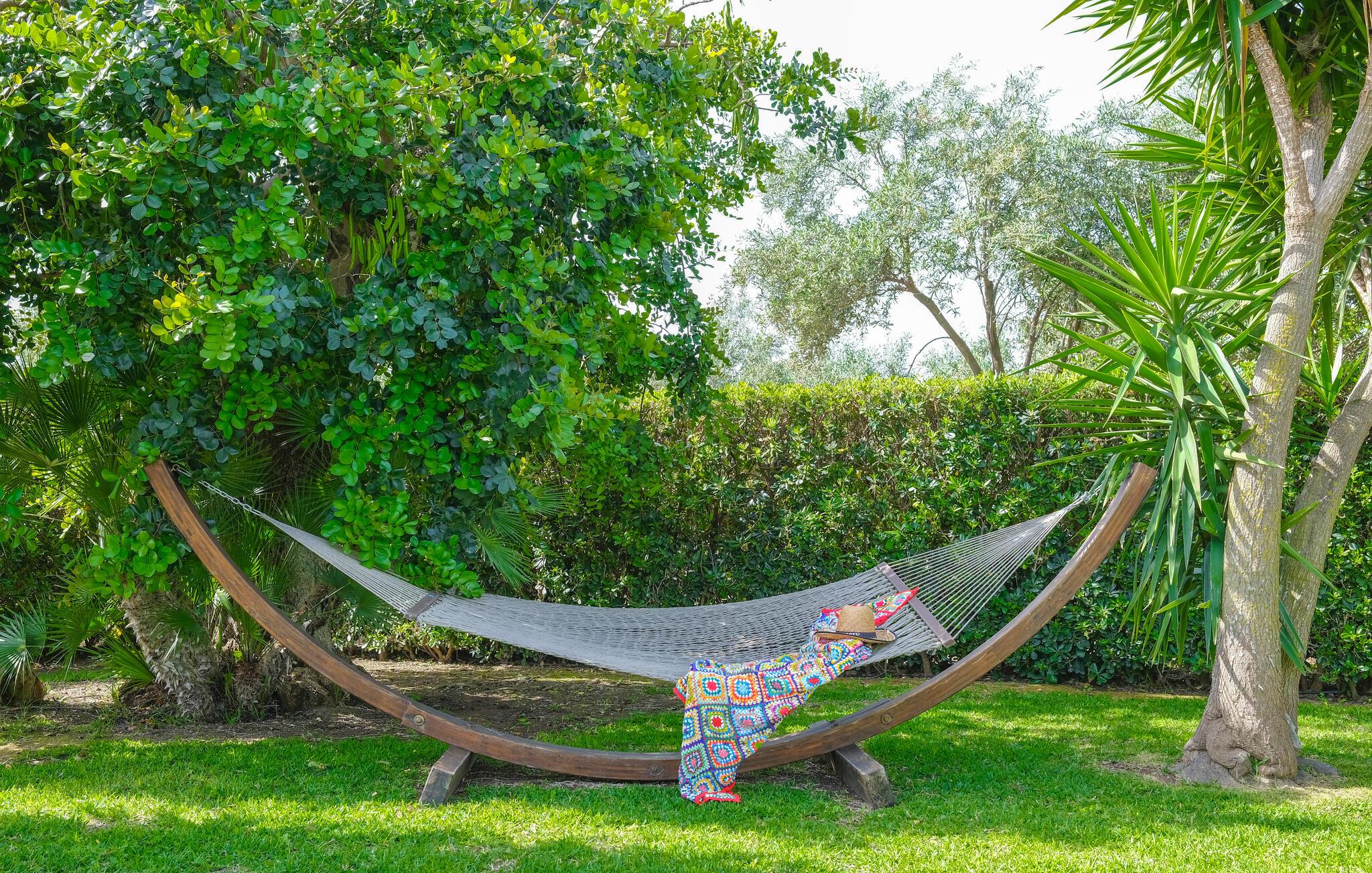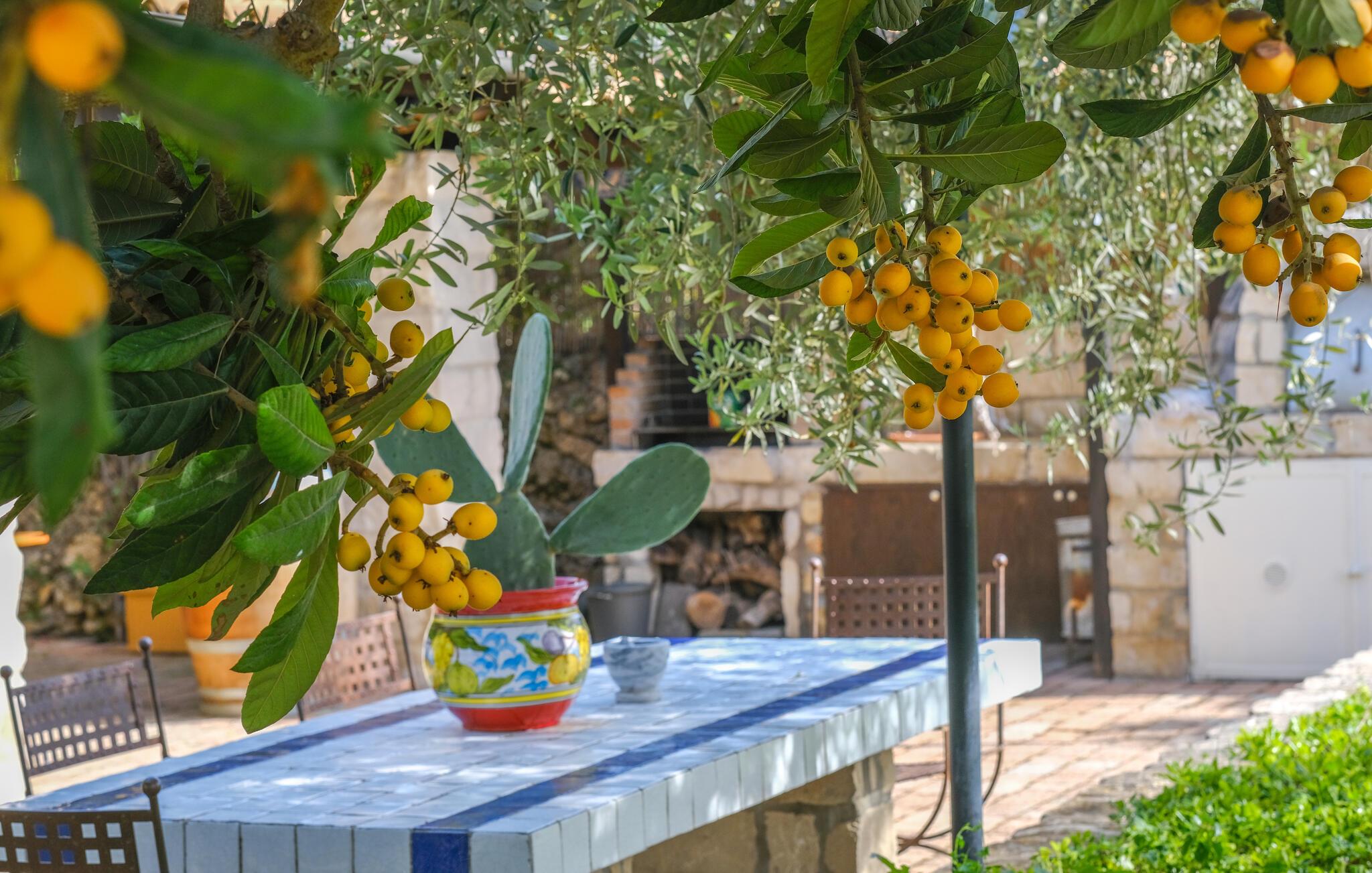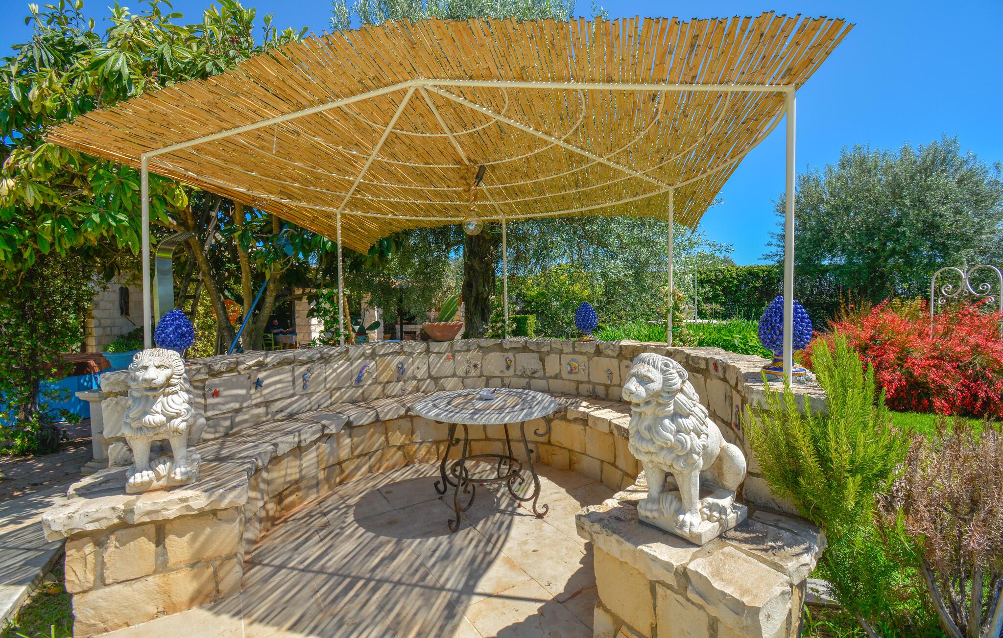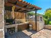 Dette charmerende feriehus tilbyder ideelle betingelser for en afslappende udendørsferie. Omgivet af en velholdt have med middelhavsplanter, vil I nyde masser af fred, komfort og privatliv. Tilbered jeres måltider i det farverige køkken med håndmalede fliser og traditionelle møbler. Brug den overdækkede terrasse til morgenmad i skyggen eller en hyggelig middag ved det farverigt dækkede bord. Lav mad i udendørskøkkenet med grill og stenovn. Slap af i spabadet eller tag en pause på liggestolen under palmerne. Den store swimmingpool er havens midtpunkt og giver forfriskning på varme dage. Læn jer tilbage med en bog i hængekøjen eller nyd udsigten fra det halvcirkelformede siddeområde under markisen.
