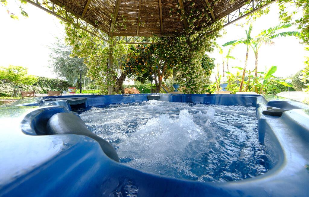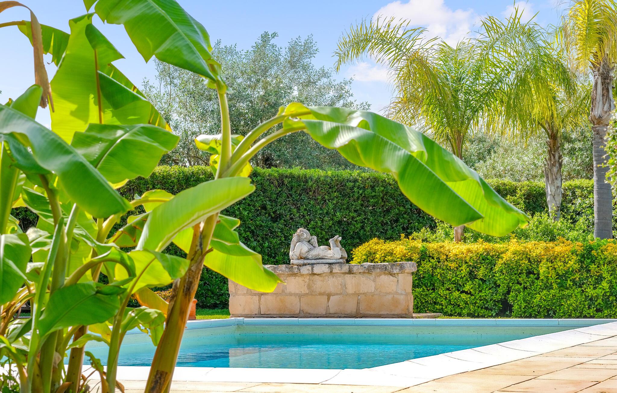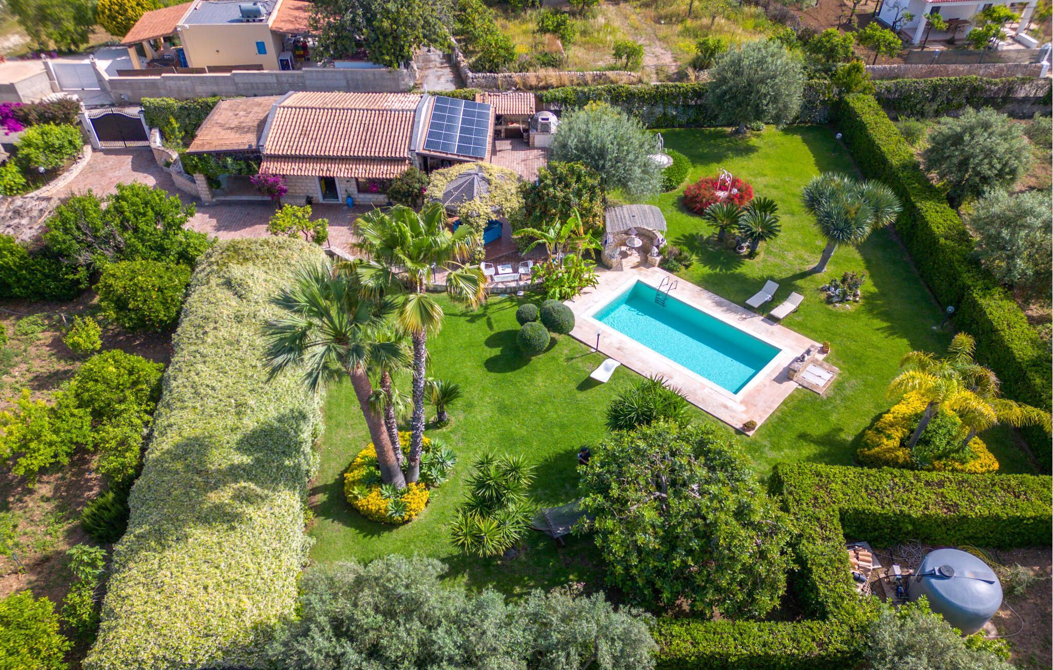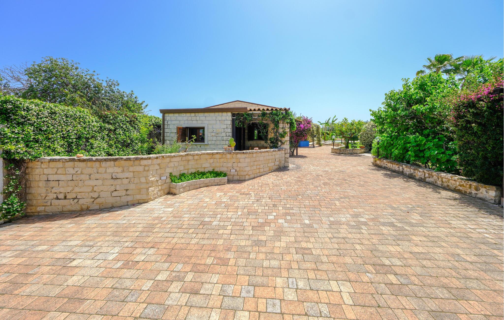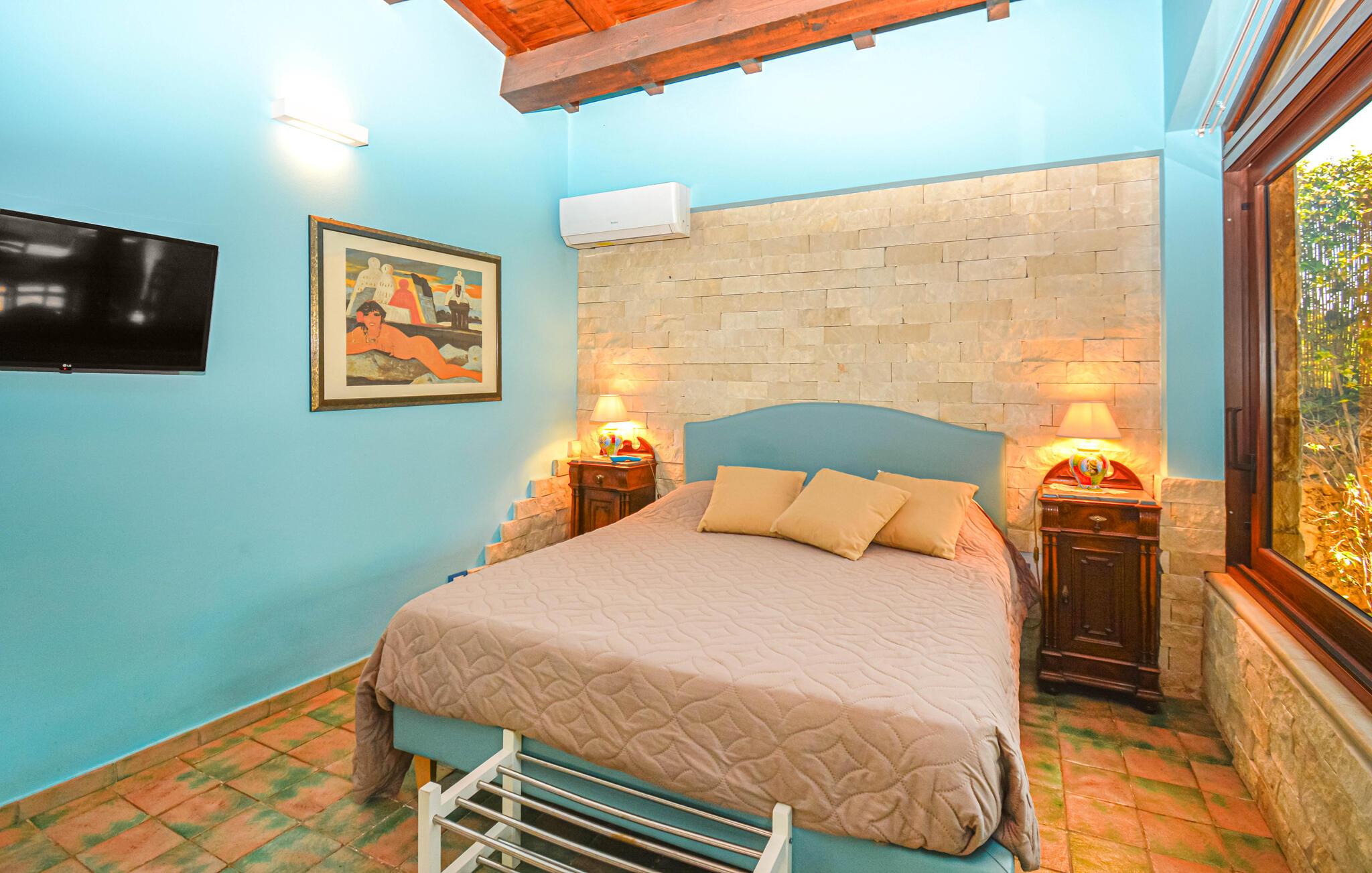 Dette charmerende feriehus tilbyder ideelle betingelser for en afslappende udendørsferie. Omgivet af en velholdt have med middelhavsplanter, vil I nyde masser af fred, komfort og privatliv. Tilbered jeres måltider i det farverige køkken med håndmalede fliser og traditionelle møbler. Brug den overdækkede terrasse til morgenmad i skyggen eller en hyggelig middag ved det farverigt dækkede bord. Lav mad i udendørskøkkenet med grill og stenovn. Slap af i spabadet eller tag en pause på liggestolen under palmerne. Den store swimmingpool er havens midtpunkt og giver forfriskning på varme dage. Læn jer tilbage med en bog i hængekøjen eller nyd udsigten fra det halvcirkelformede siddeområde under markisen.