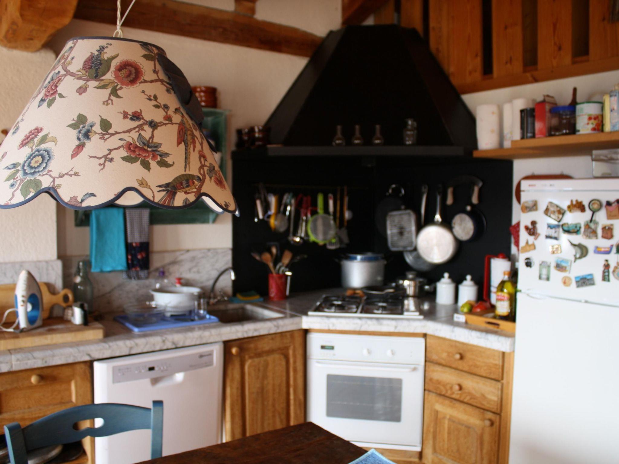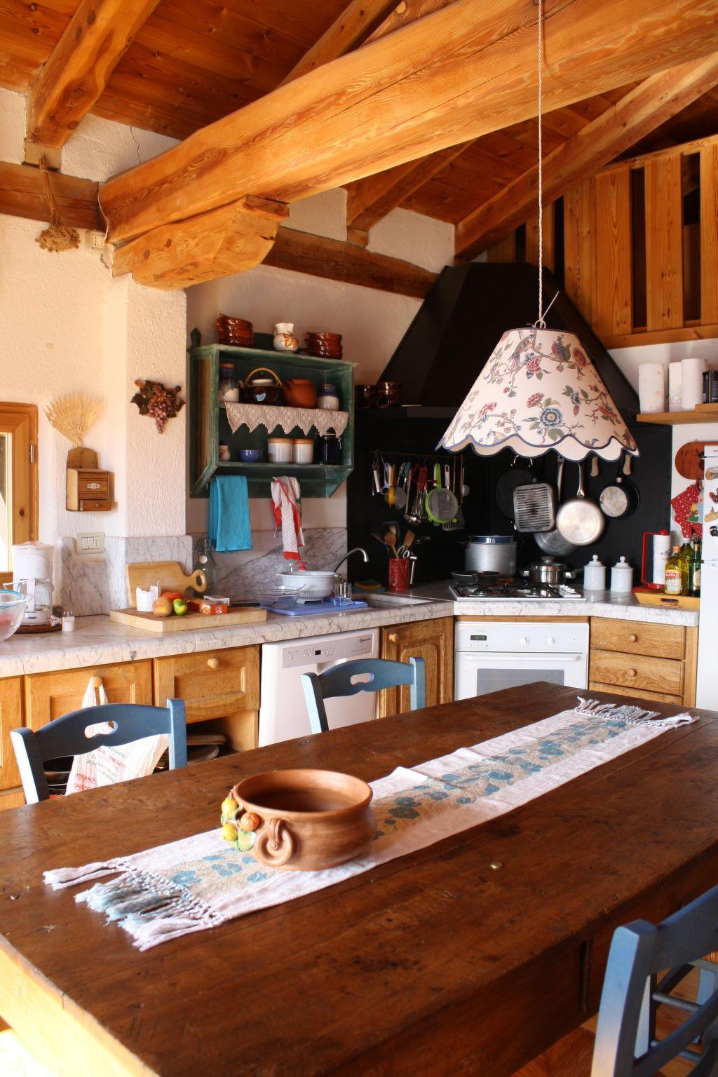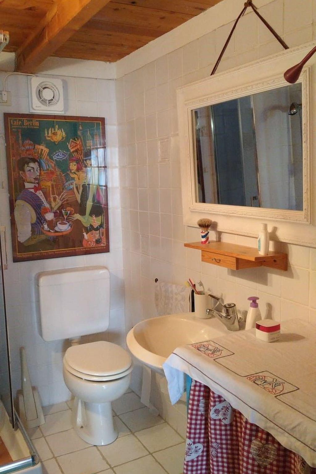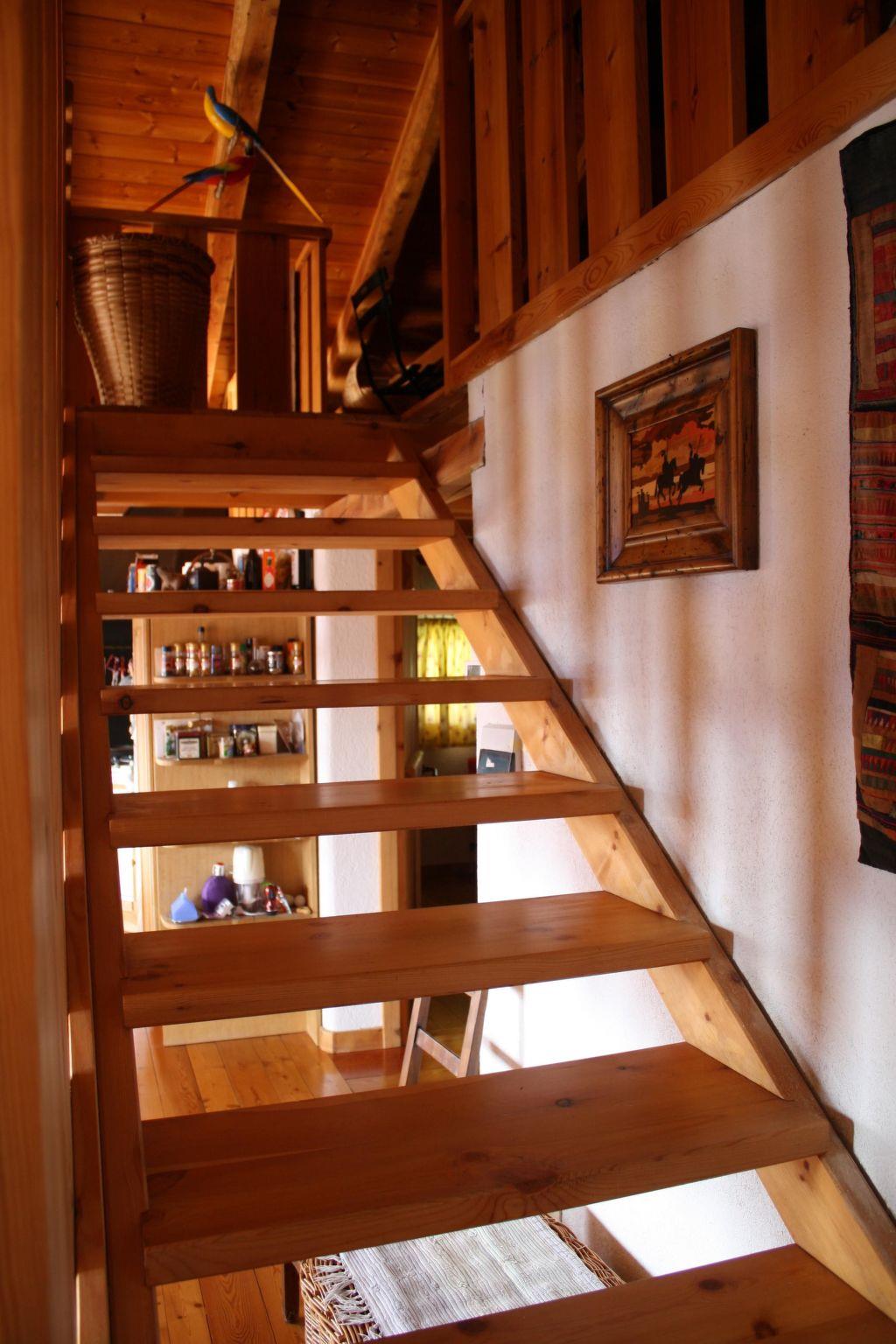 This house, however, was only built in 1993, but in traditional style and with local materials. The flat is on two levels. On the ground floor there is a large kitchen and living room, a bathroom with shower and two bedrooms with two single beds and a bunk bed. The room with the bunk bed is not available as a bedroom, but is nevertheless available to guests. It has a wardrobe and a cupboard with bed linen and towels. On the upper floor is an attic room with a French double bed (140 x 190 cm). One of the bedrooms also houses some personal belongings of the owners, who also use the house in their spare time. Of course, only when it is not rented out. Therefore, the flat contains books and personal belongings and is tastefully furnished with a washing machine, oven and dishwasher, gas heating, colour TV, stereo system, furniture, carpets, sheets, blankets and towels. In addition to the existing gas heating, there is also a pellet stove (full sacks are already in the house; the cost per sack is indicated under 'Firewood'). Of course, there are also cupboards for storing your personal belongings.