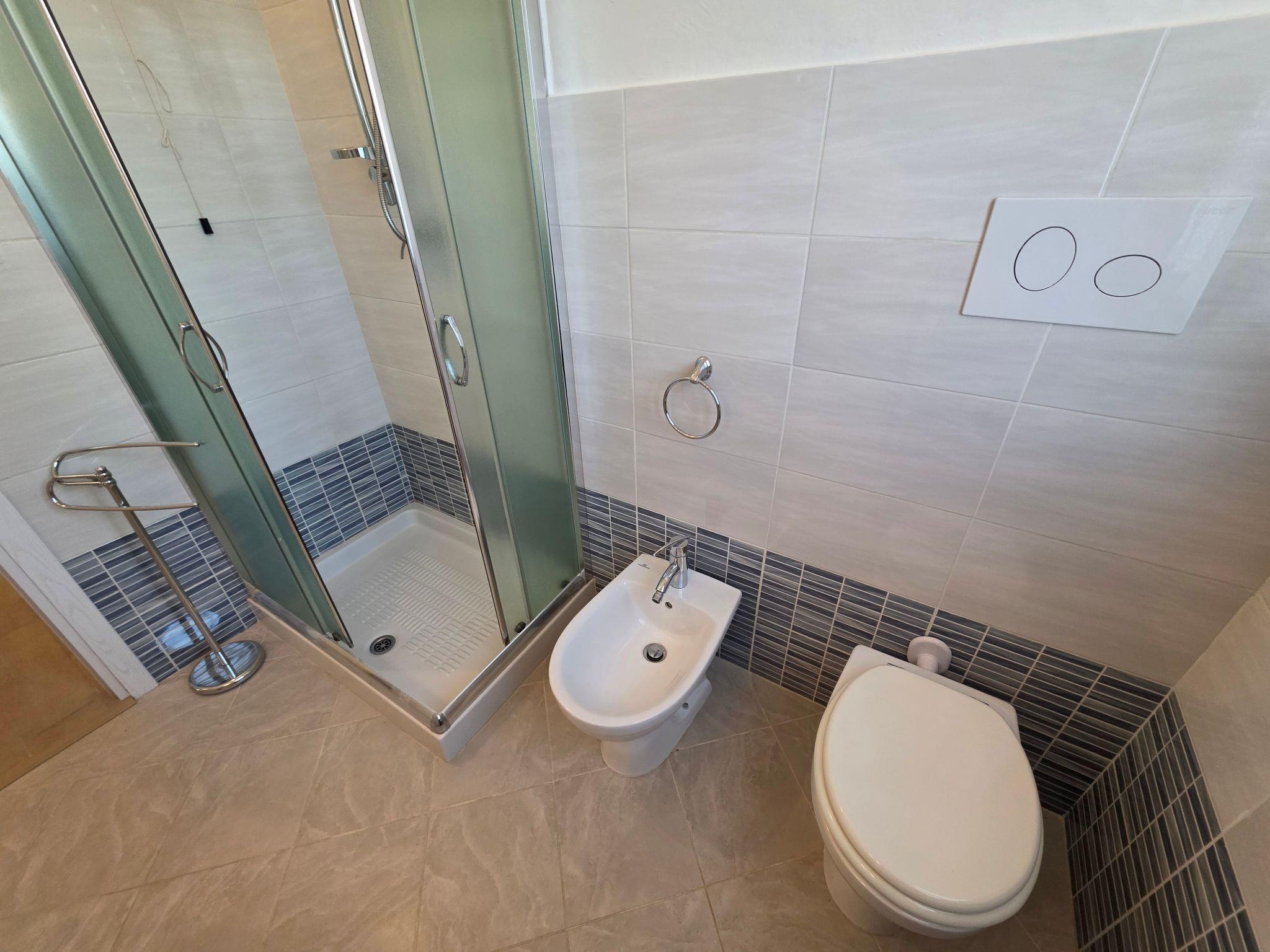 The modern bathroom is equipped with a shower, bidet and hairdryer.