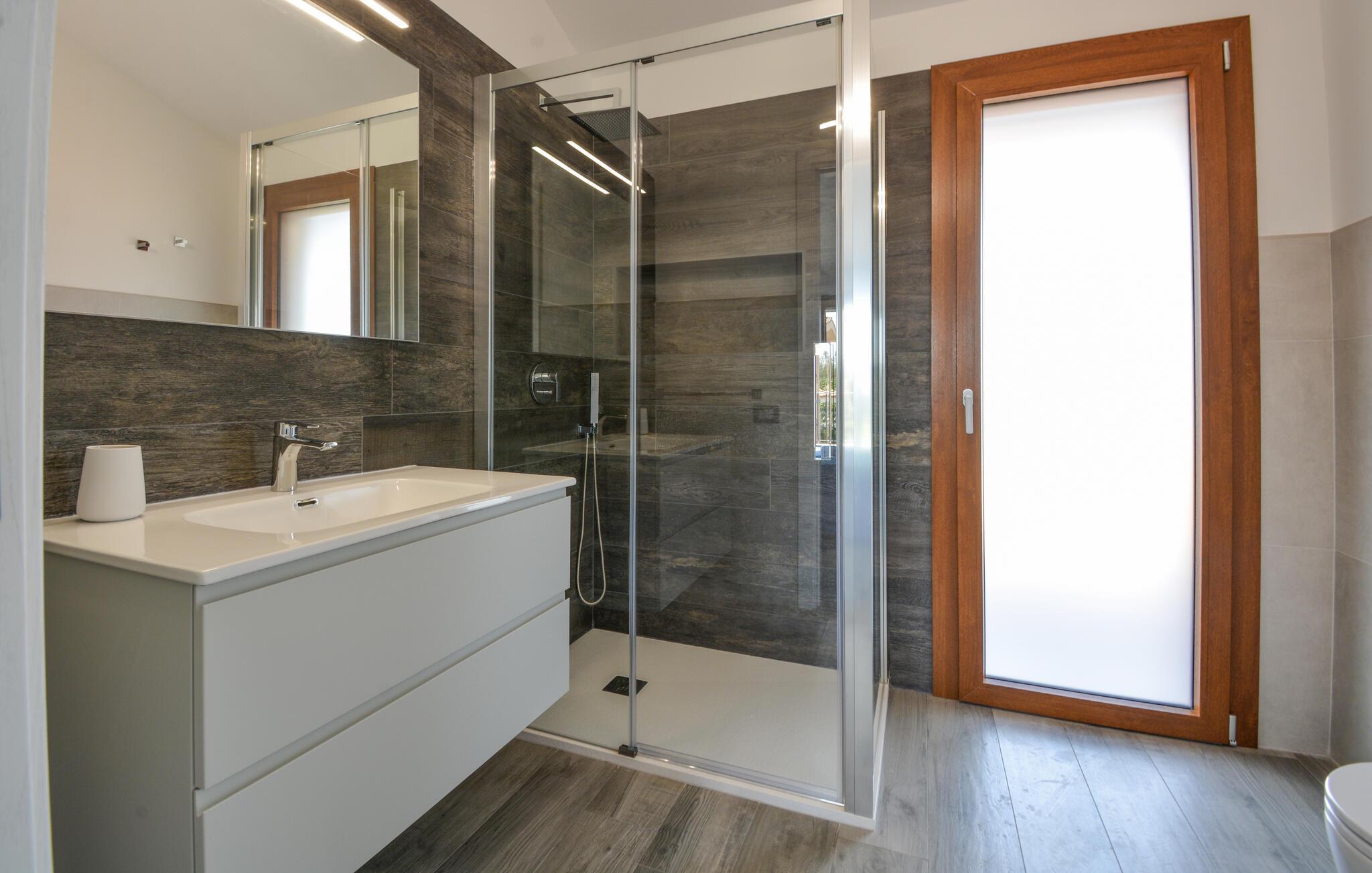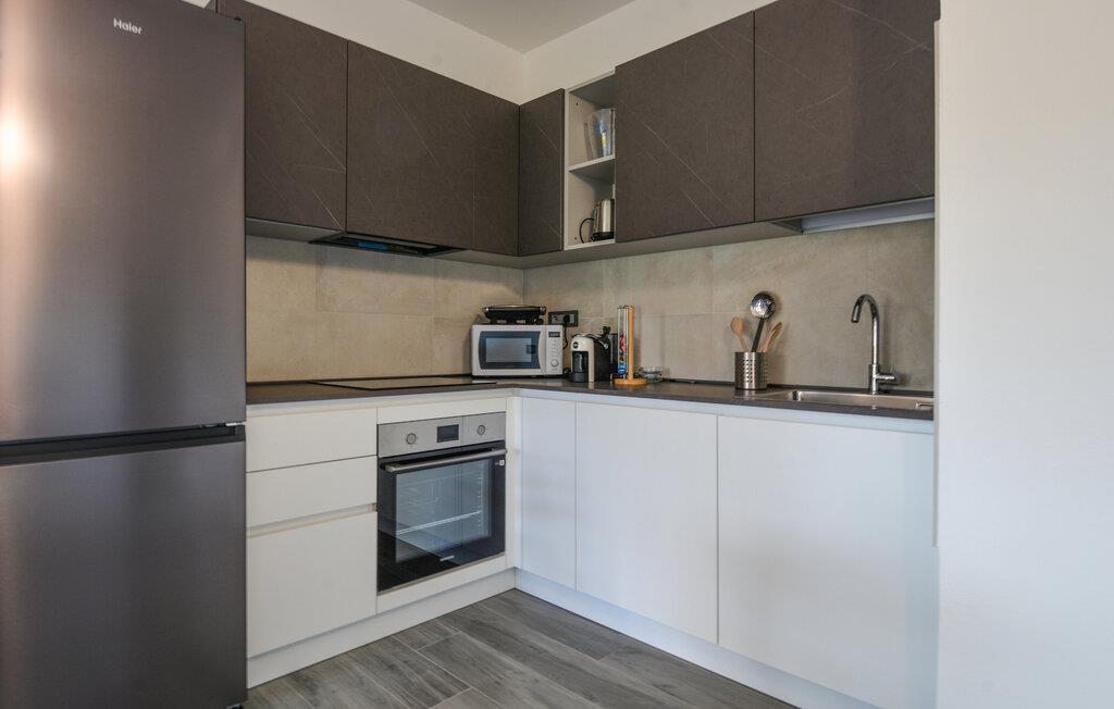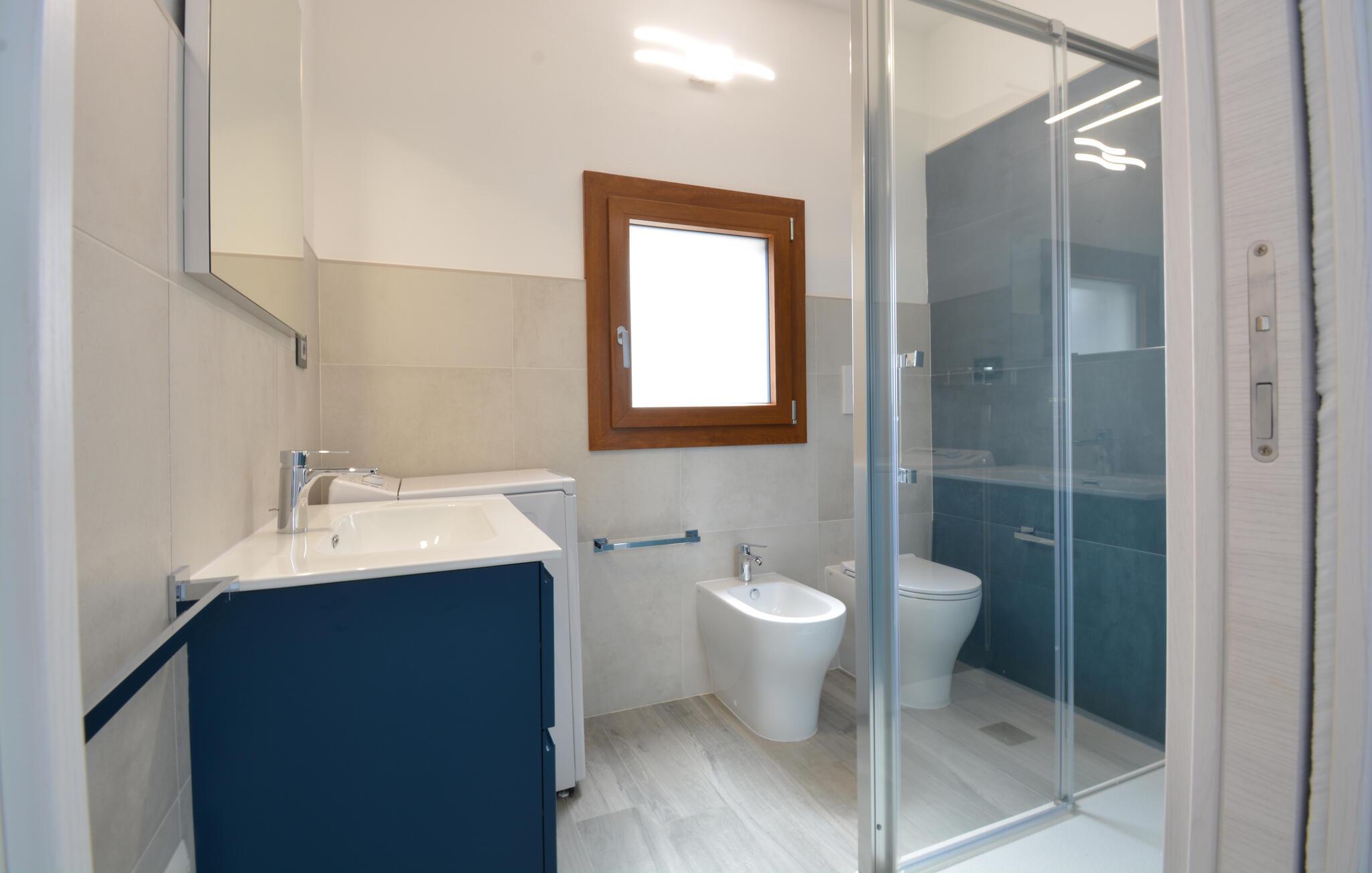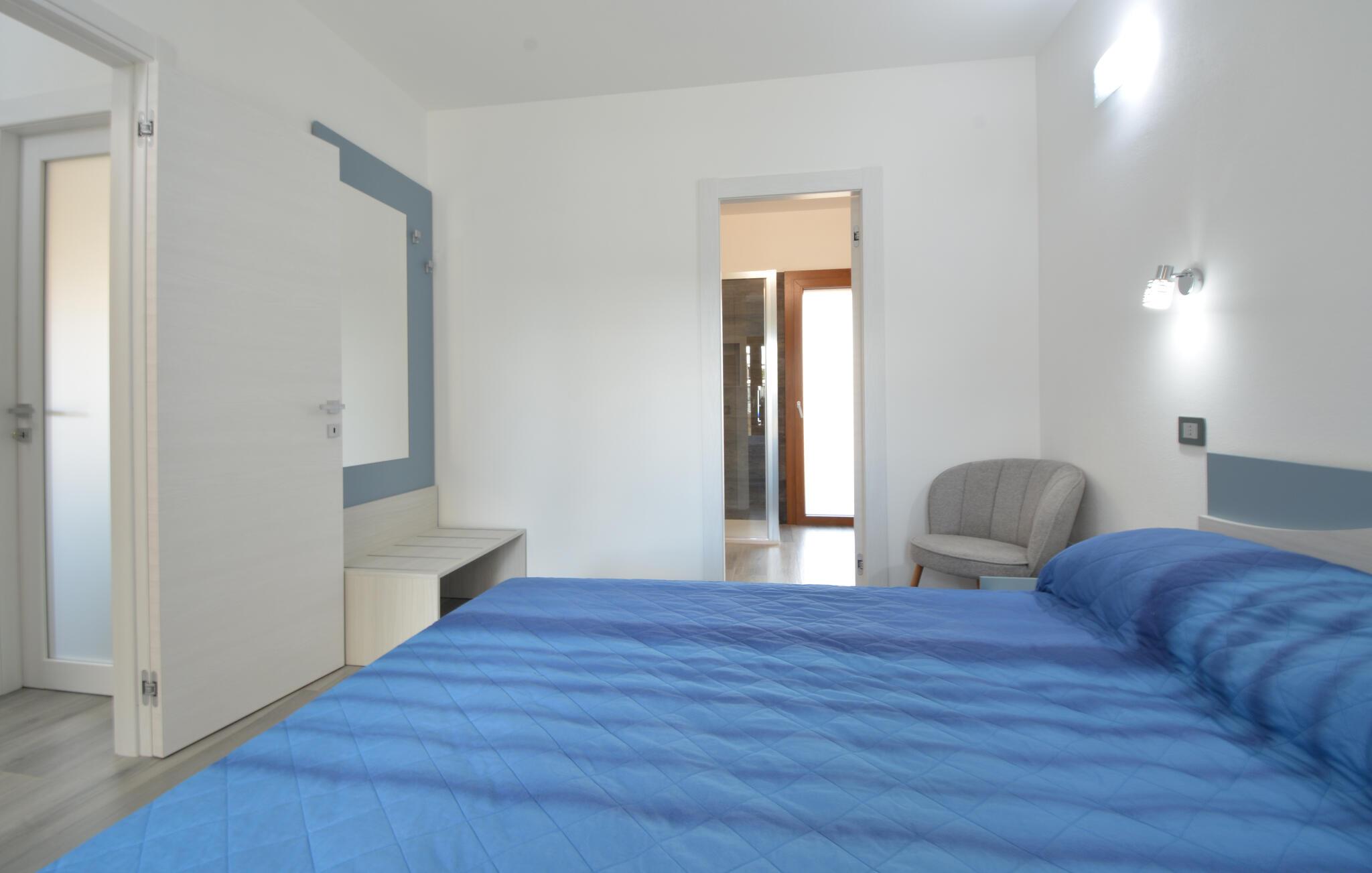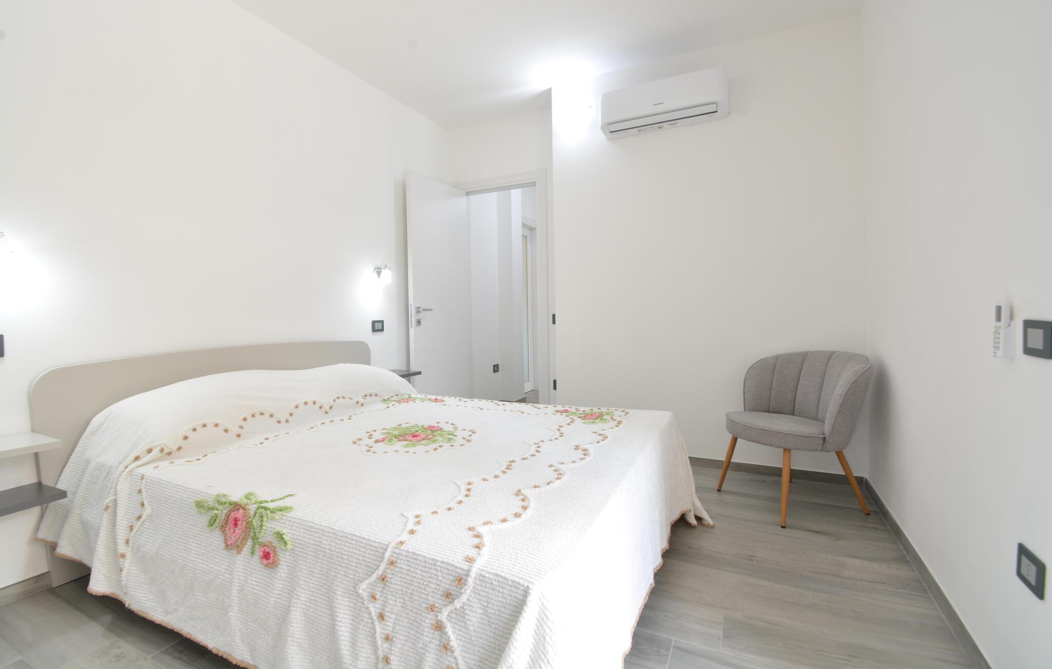 Velkommen til denne komfortabelt indrettede ferielejlighed, hvor I sammen med dem, I holder af, kan koble af fra hverdagen og udforske alt det, Sardinien har at byde på. Tilbered middelhavsretter i det åbne køkken med friske råvarer fra markedet, tag plads ved det indbydende spisebord, og nyd den behagelige brise gennem rummene under en afslappende middagspause på den komfortable sofa.