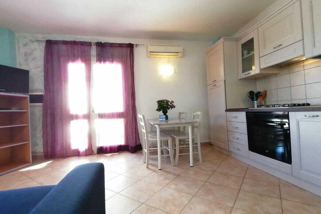Toværelses ferielejlighed, 38 m², stueetage med en 30 m² haveveranda med udsigt over en olivenlund og bjerge. Del af en bolig med andre lejligheder. Beskrivelse: Et soveværelse med dobbeltseng, badeværelse (bruser/toilet). Stue/køkken med en dobbelt sovesofa. Faciliteter: Aircondition, fuldt udstyret køkken, køleskab, fryser, gaskomfur, ovn, smagfuldt møblerede værelser, grill. Parkering i gården eller i parkeringskælderen. Håndklæder og sengelinned inkluderet, slutrengøring inkluderet. Den 70 m² store swimmingpool med komfortable liggestole er åben fra juli til september.
