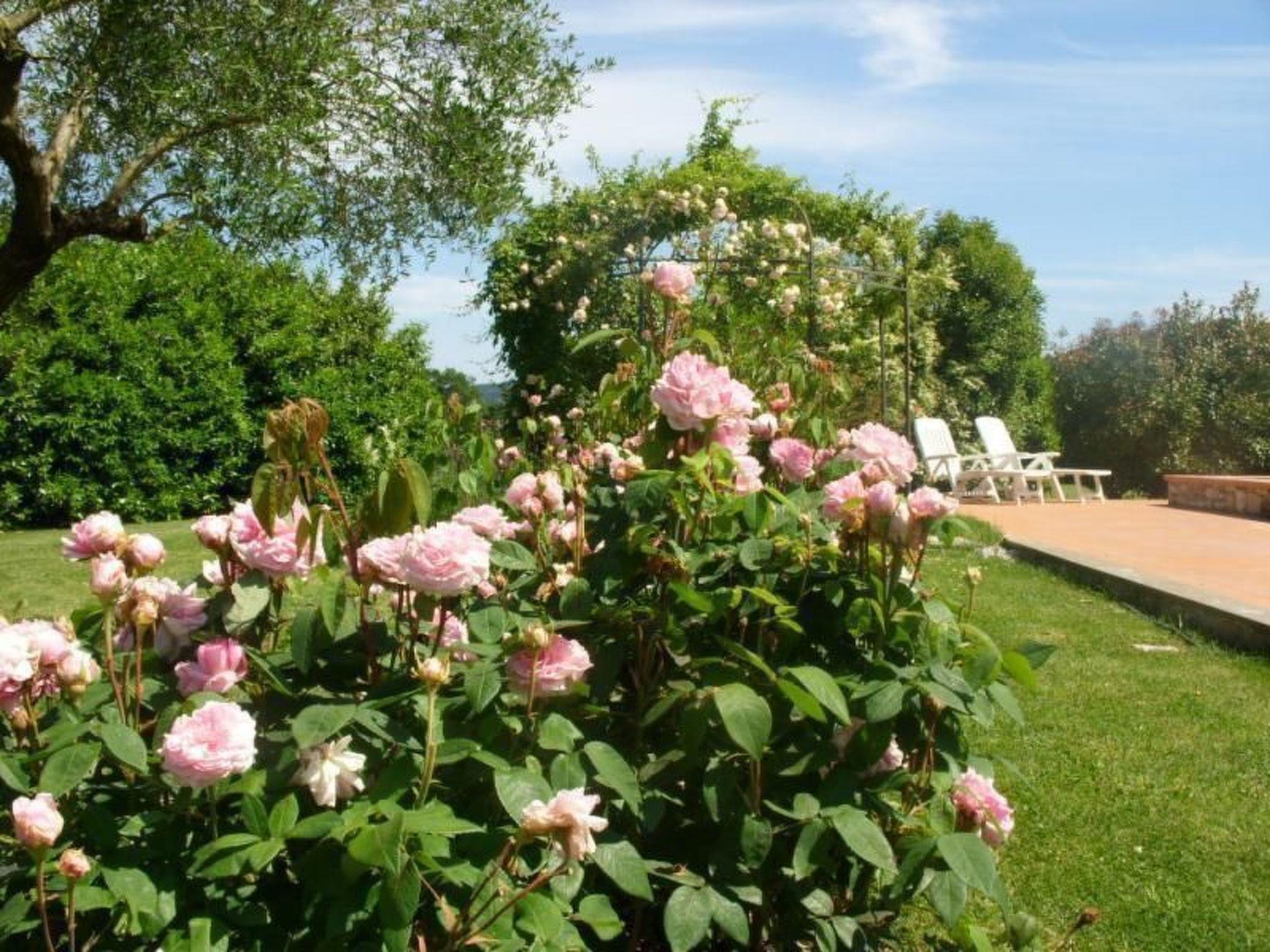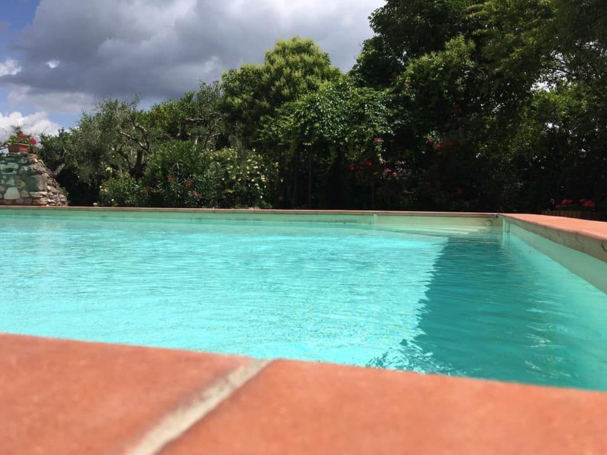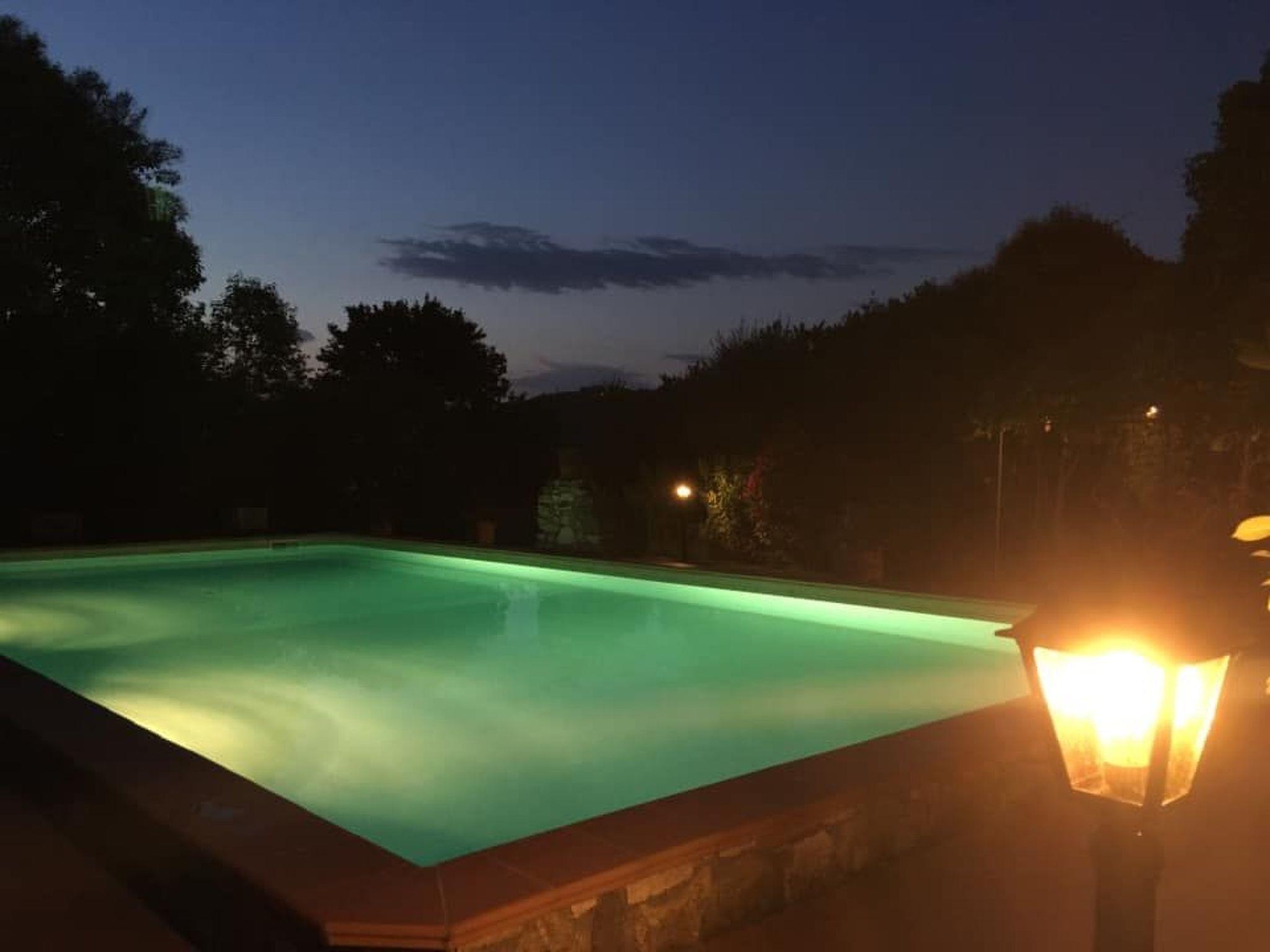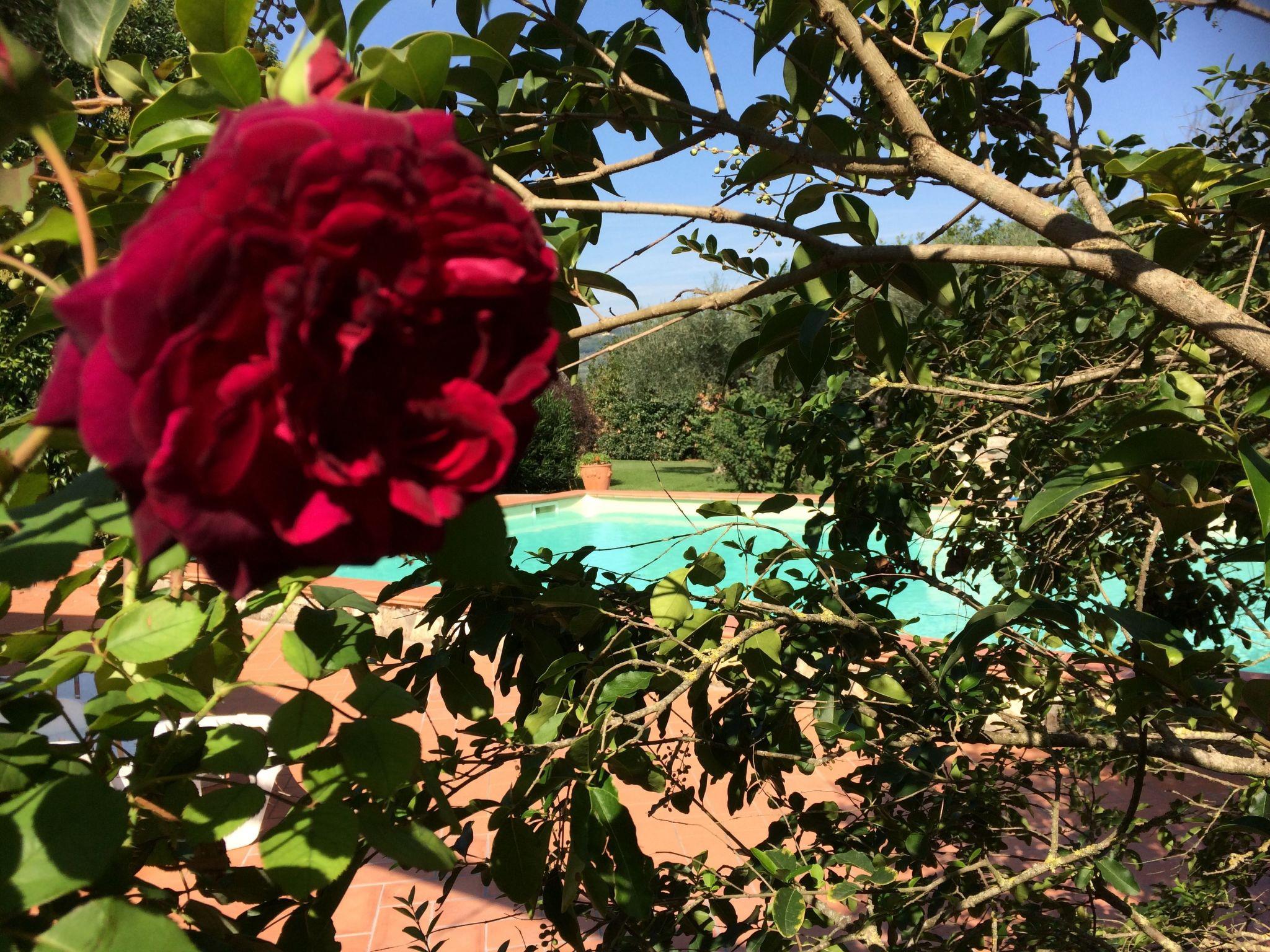 The 6x12 m swimming pool is for the exclusive use of guests, with a solarium of over 100 square metres furnished with deckchairs and table and chairs, and a large gazebo covered with flowering plants. Two beautiful century-old oak trees provide shade and create a very relaxing environment. Many English roses, perfumed plants, embellish the garden, which is personally tended by the owners. The property is surrounded by nature, with views of the hills of oak and olive trees.