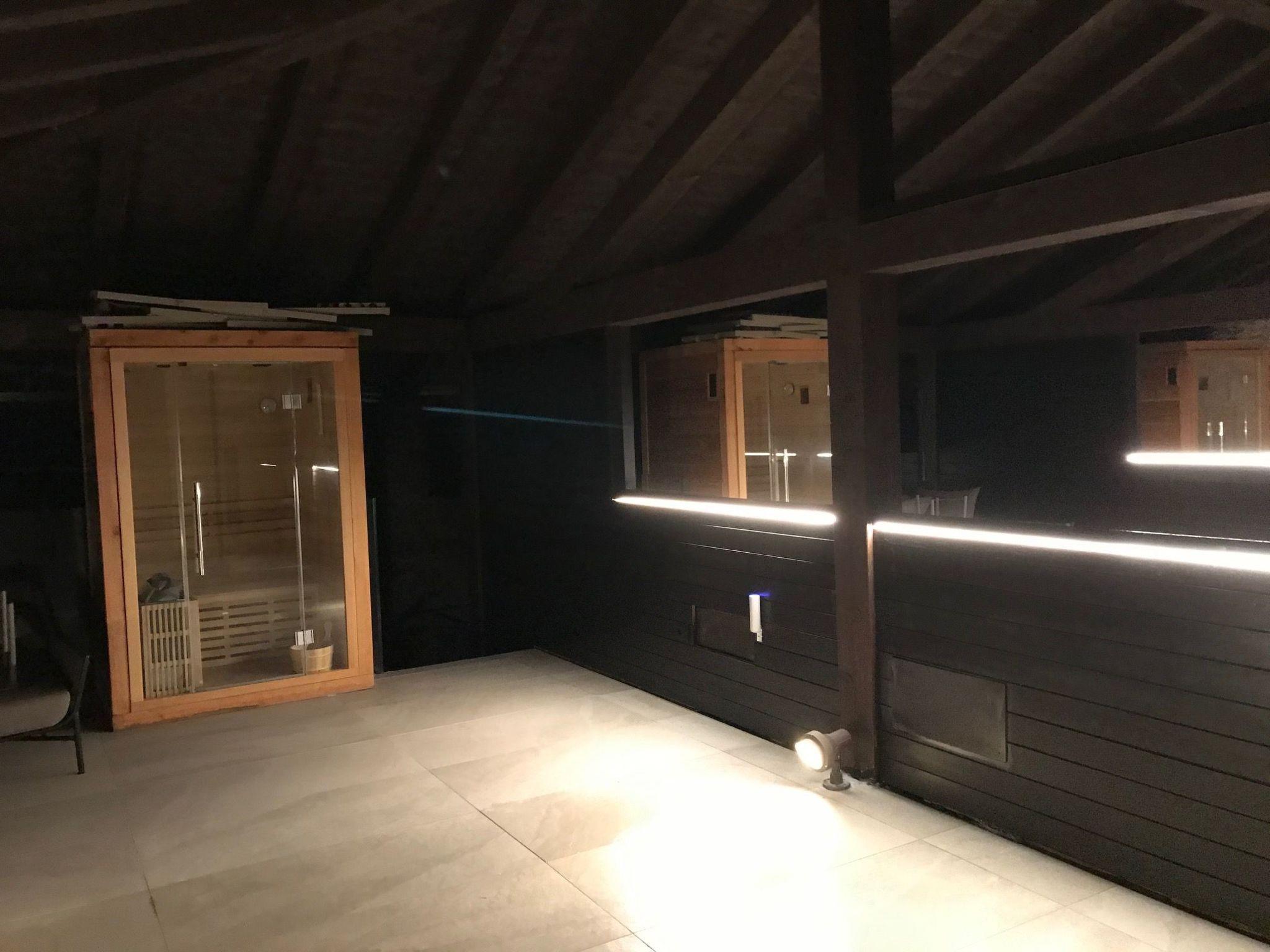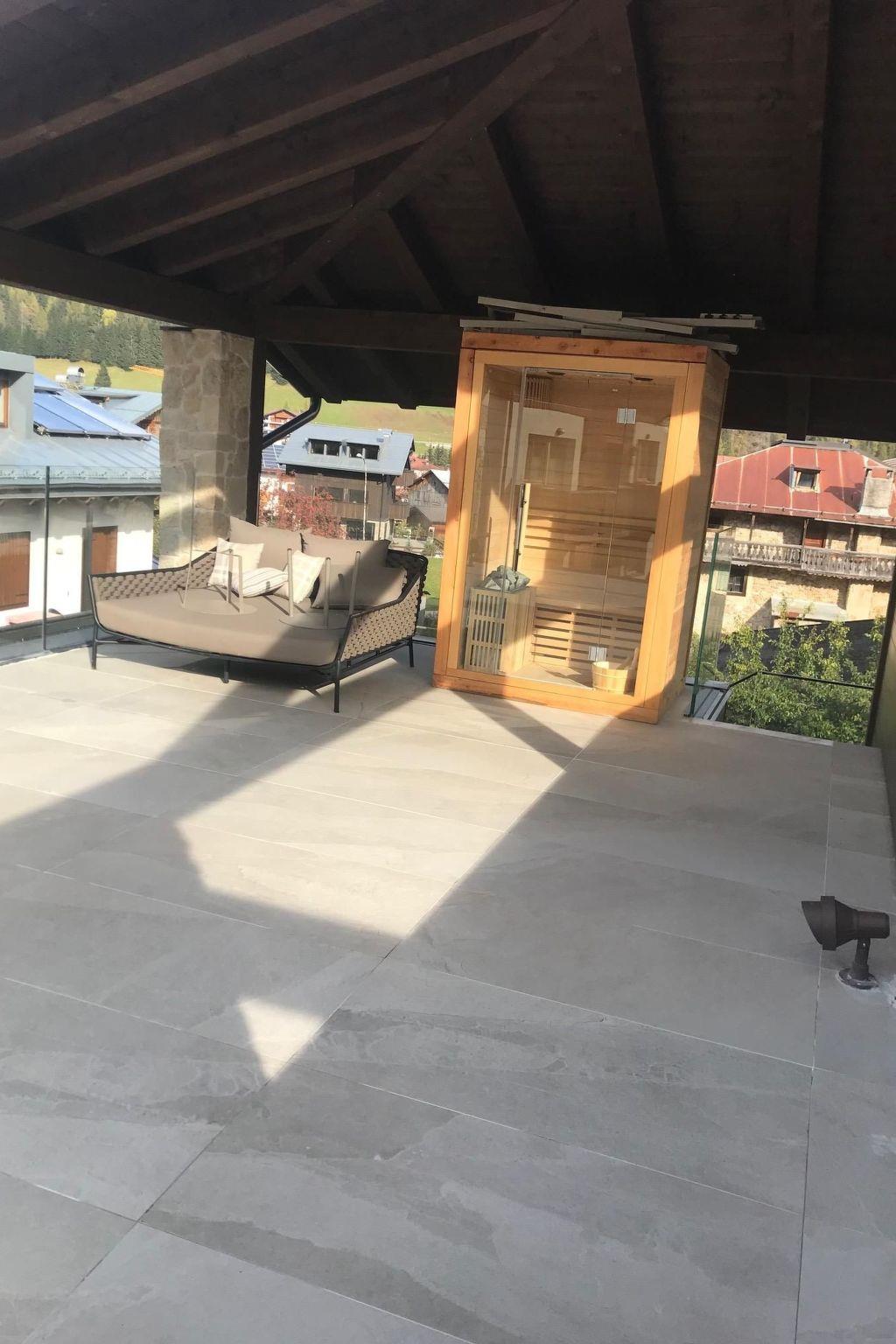 The flat has a covered terrace with sauna and garden furniture. The terrace offers a magnificent view of the Dolomites.