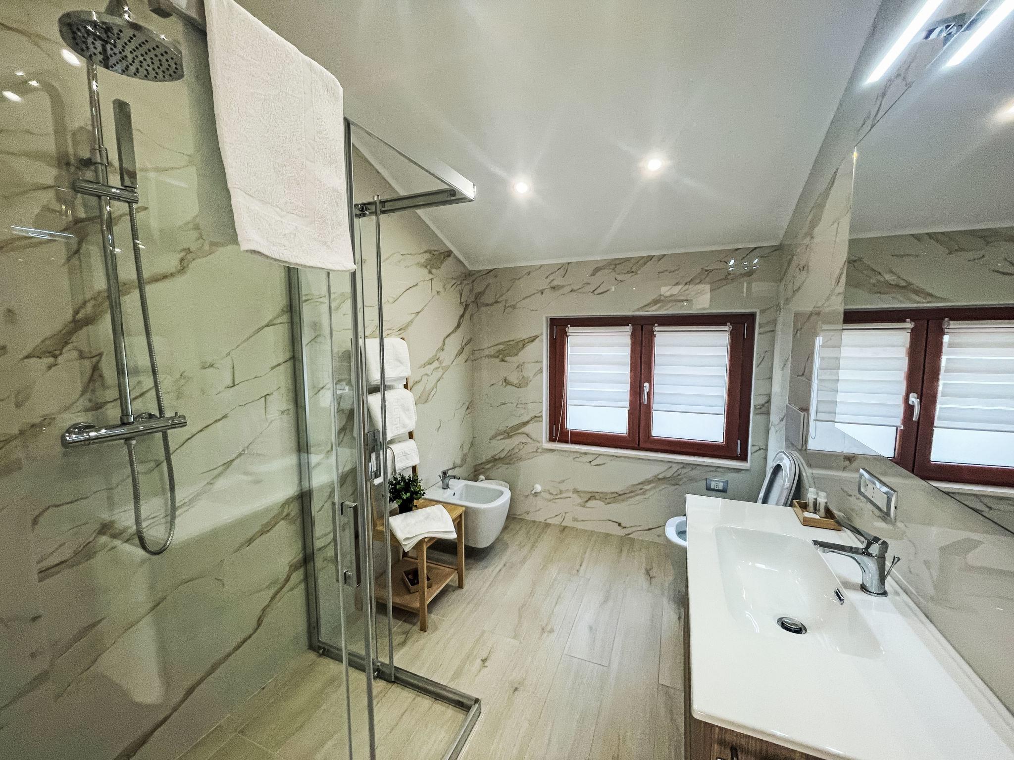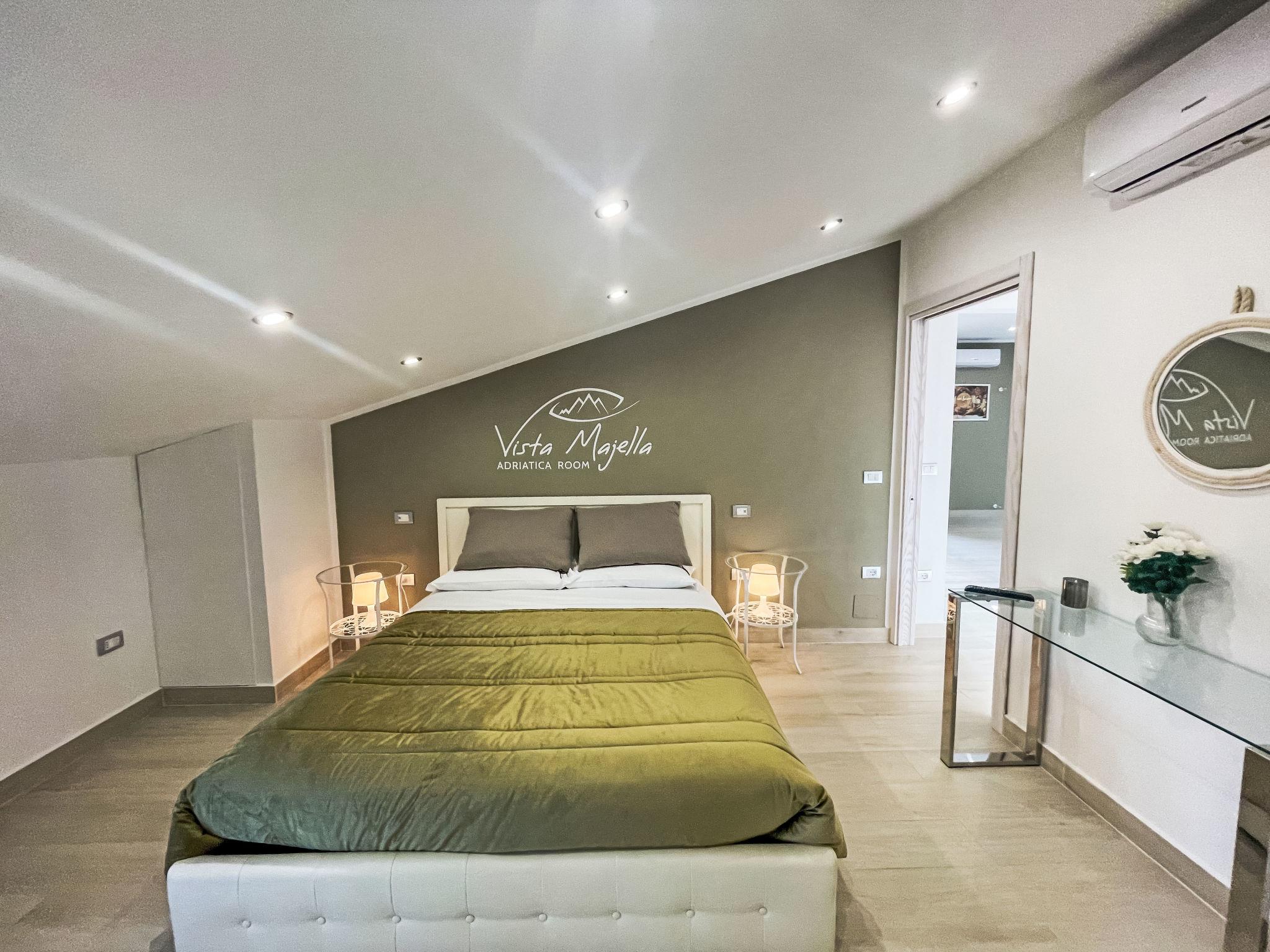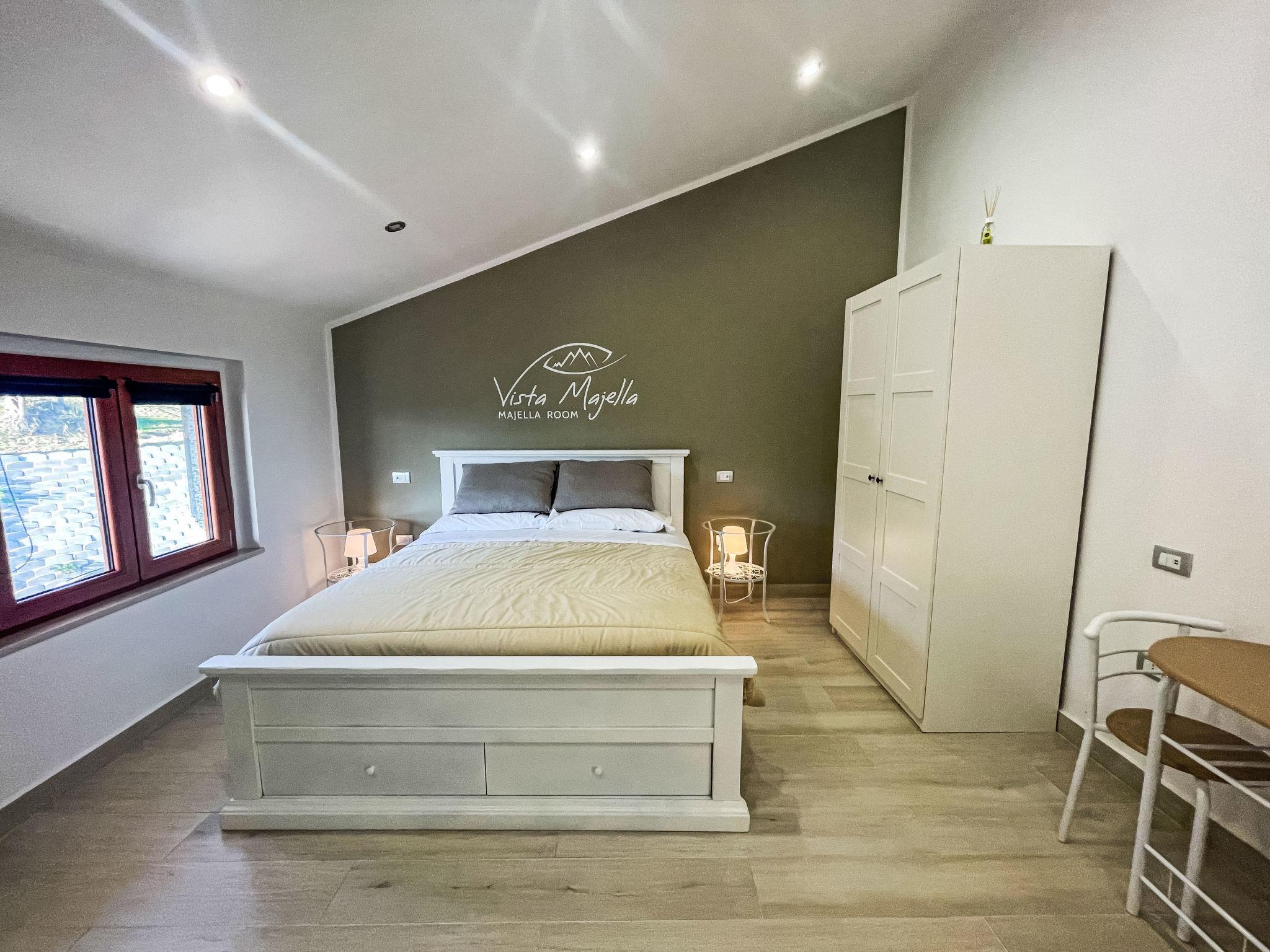 "Vista Majella", 3-room apartment 110 m2, on the top floor. Modern and stylish furnishings: top floor: (exterior staircase) living/sleeping room with 1 double sofabed and TV. Exit to the terrace. 2 double bedrooms, each room with shower/WC. Open kitchen (oven, dishwasher, Gas stove, 5 gas rings, toaster, kettle, freezer, electric coffee machine). Exit to the terrace. Heating, air-conditioning. Heating available only from 15.10. to 15.04. Natural stone floors. Large terrace 30 m2, south facing position and west facing position. Terrace furniture, deck chairs (4). Very beautiful panoramic view of the mountains and the countryside. Facilities: washing machine, baby cot for up to 2 year olds. Internet (WiFi, free). Please note: 1 small pet/ dog allowed. Private entrance. IT069059C20X533W8G