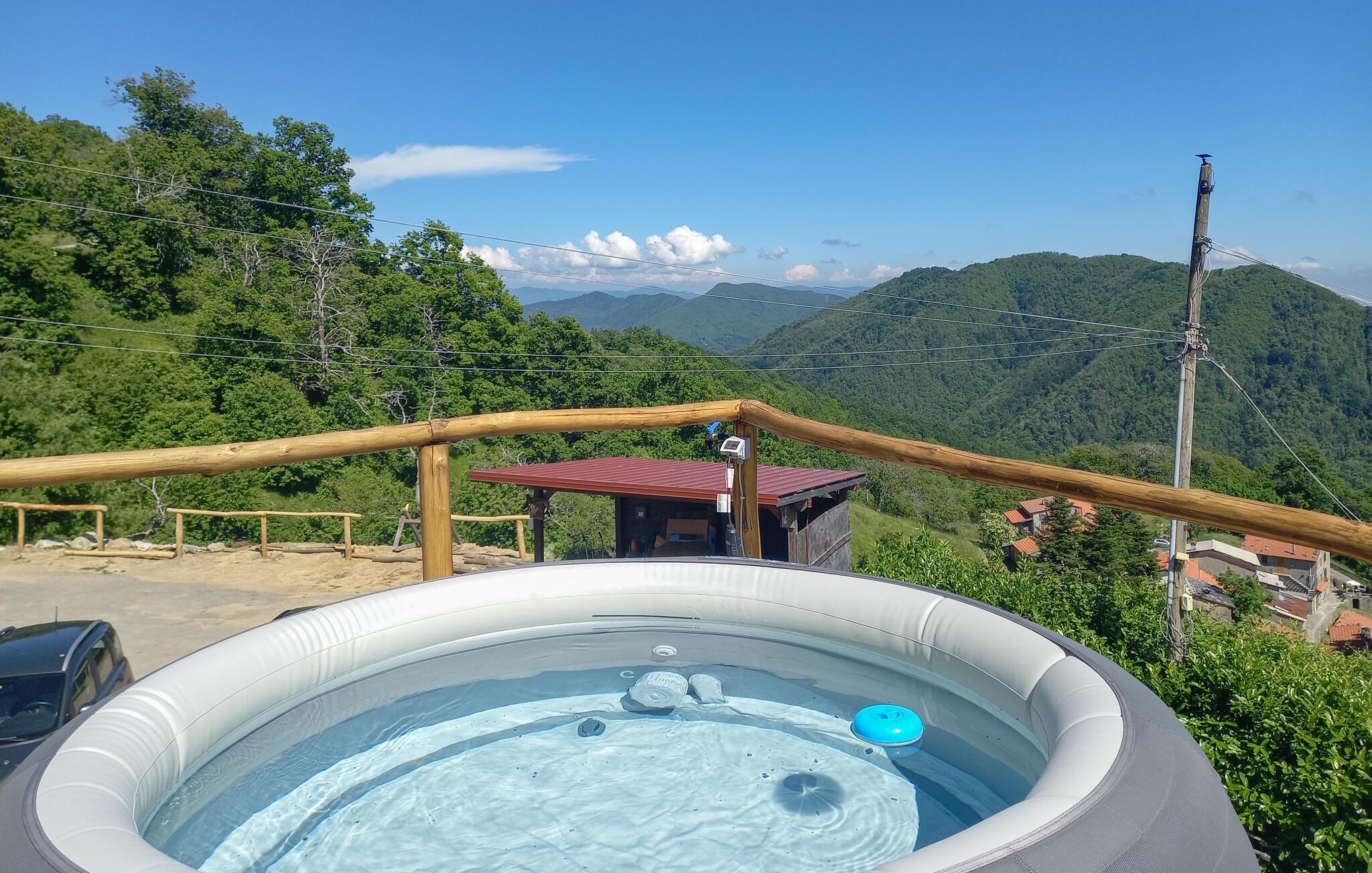 Det absolutte højdepunkt ved jeres feriehus er udeområdet. Tag plads i de komfortable hyggekroge og lad blikket vandre over det imponerende bjerglandskab. I mellemtiden kan børnene more sig i soppebassinet.