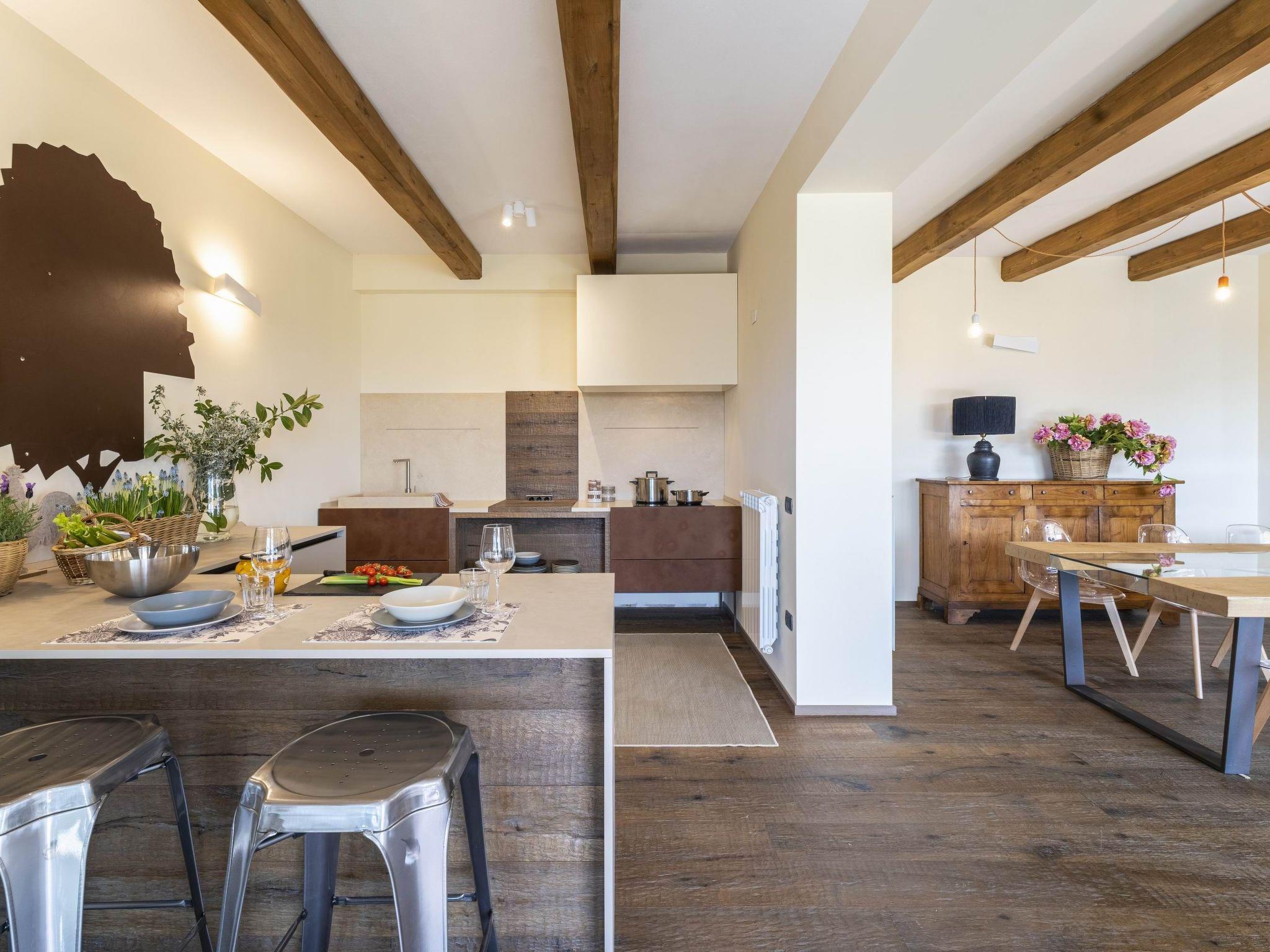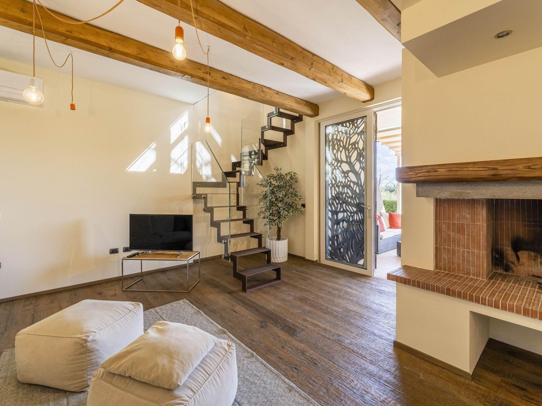 The other large veranda on the basement floor, which can be opened electronically, leads to one of the entrances to the house, where there is a large living room with a living area (fireplace, Smart TV), worktop, dining area with a table seating 10 and a large kitchenette (induction hob, oven, fridge with freezer, dishwasher, microwave, toaster, moka). A staircase leads to the upper floor where there is a hallway and a bedroom with a double bed (bed 160 x 200 cm) and private bathroom with shower, as well as access to the covered terrace with barbecue, wood-burning oven and another covered terrace with panoramic views.