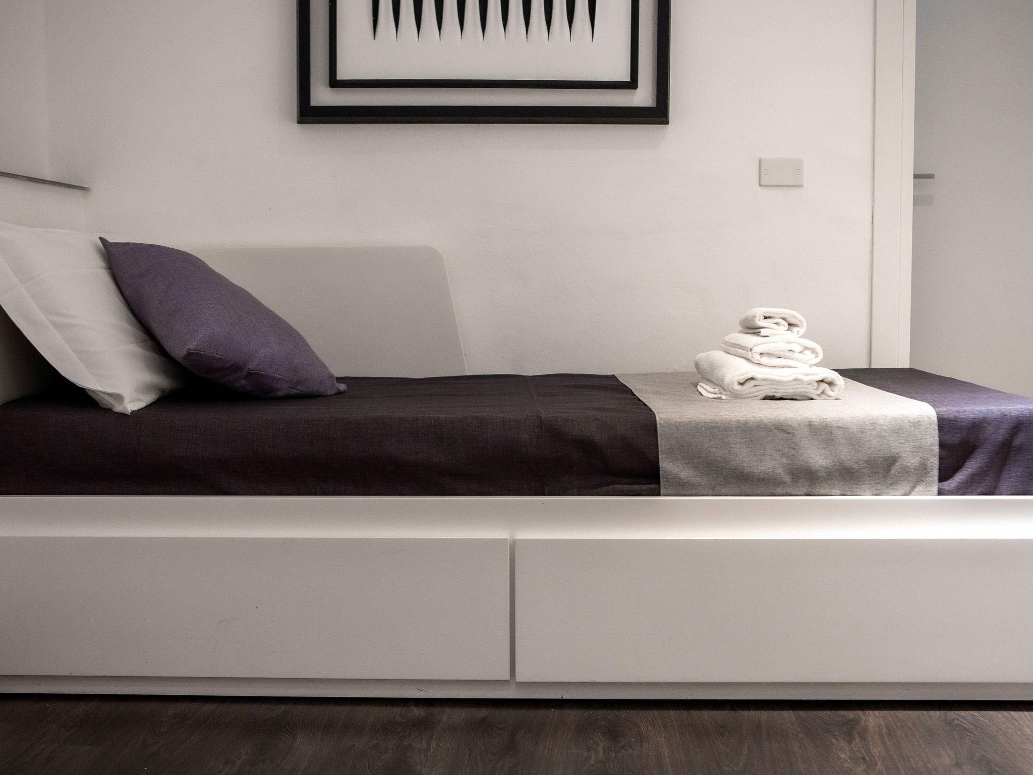 The flat is divided into two floors. It is a reserved flat, soundproofed and just renovated and fully furnished. On the upper floor there is a bedroom with a large double bed, a single bed which becomes a double if necessary, wardrobe, bedside tables, chest of drawers and desk with table lamp. Also on the upper floor is the large bathroom On the ground floor is the living area, where there is a double sofa bed. Also on the ground floor is the kitchen and the second bathroom. The whole flat is air-conditioned. We have also thought about your moments of refreshment after long walks to discover the city and have equipped the flat with a Smart TV. The flat is equipped with free Wi-Fi. Max extra beds: 2 Max cots: 2 The flat is equipped with a safe (free).