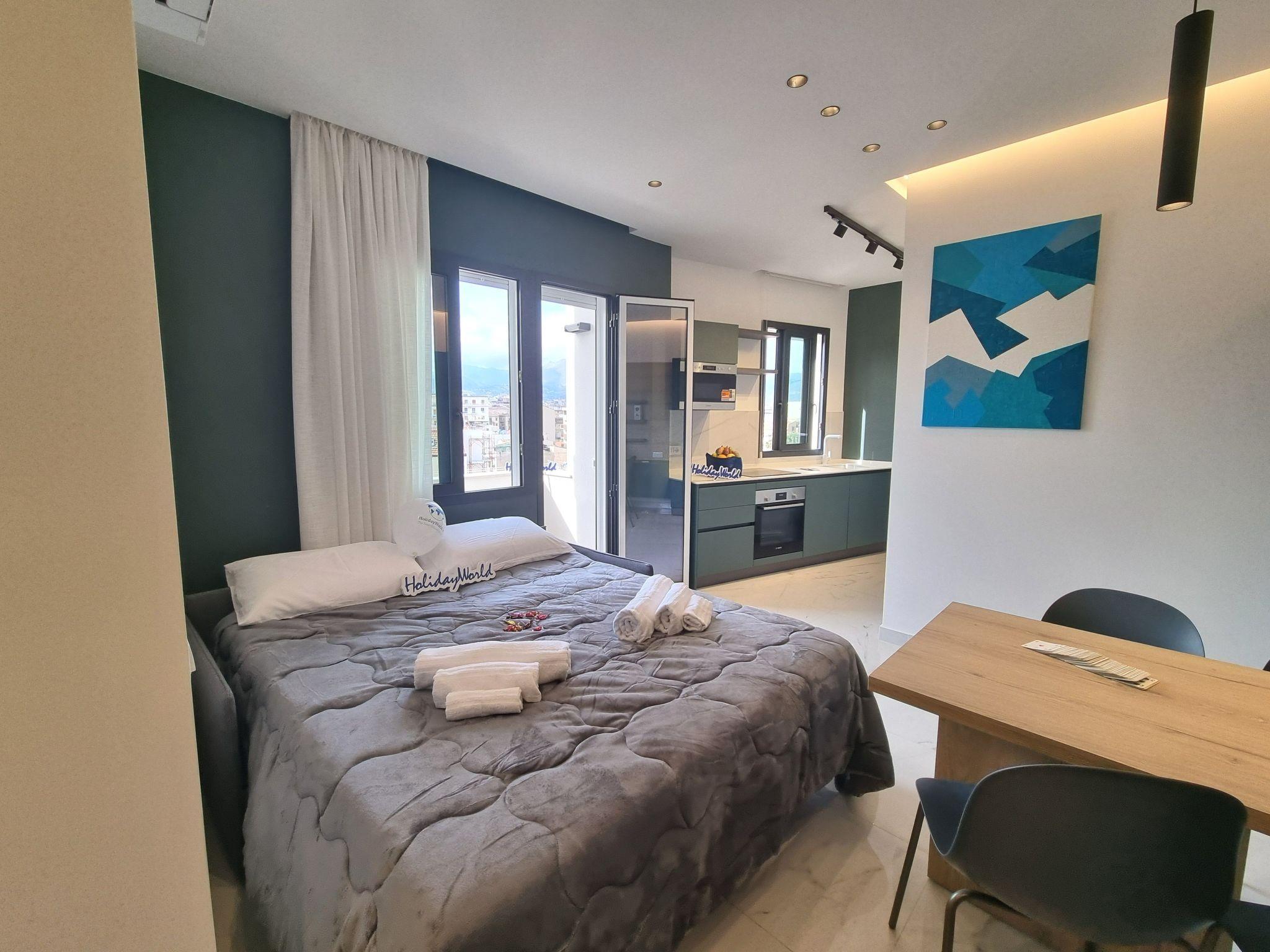 MaXelA Penthouse Green is a magnificent flat recently renovated, located in the centre of Palermo(PA). This wonderful apartment consists of a large open space with living area and sofa bed, dining area and equipped kitchenette. The area is very bright thanks to the large windows in the flat and access to the balcony. The accommodation has a bathroom with shower and bidet while the sleeping area consists of a large bedroom with a double bed. Equipped with every comfort such as air conditioning and Wi-Fi, this flat is the perfect starting point for visiting Palermo and the surrounding areas in comfort. Access to the flat is through a hallway, which connects the apartment with the one next door (MaXelA Penthouse Grey), allowing them to be rented together on request to enjoy moments of joy and conviviality with large families or groups of friends.
