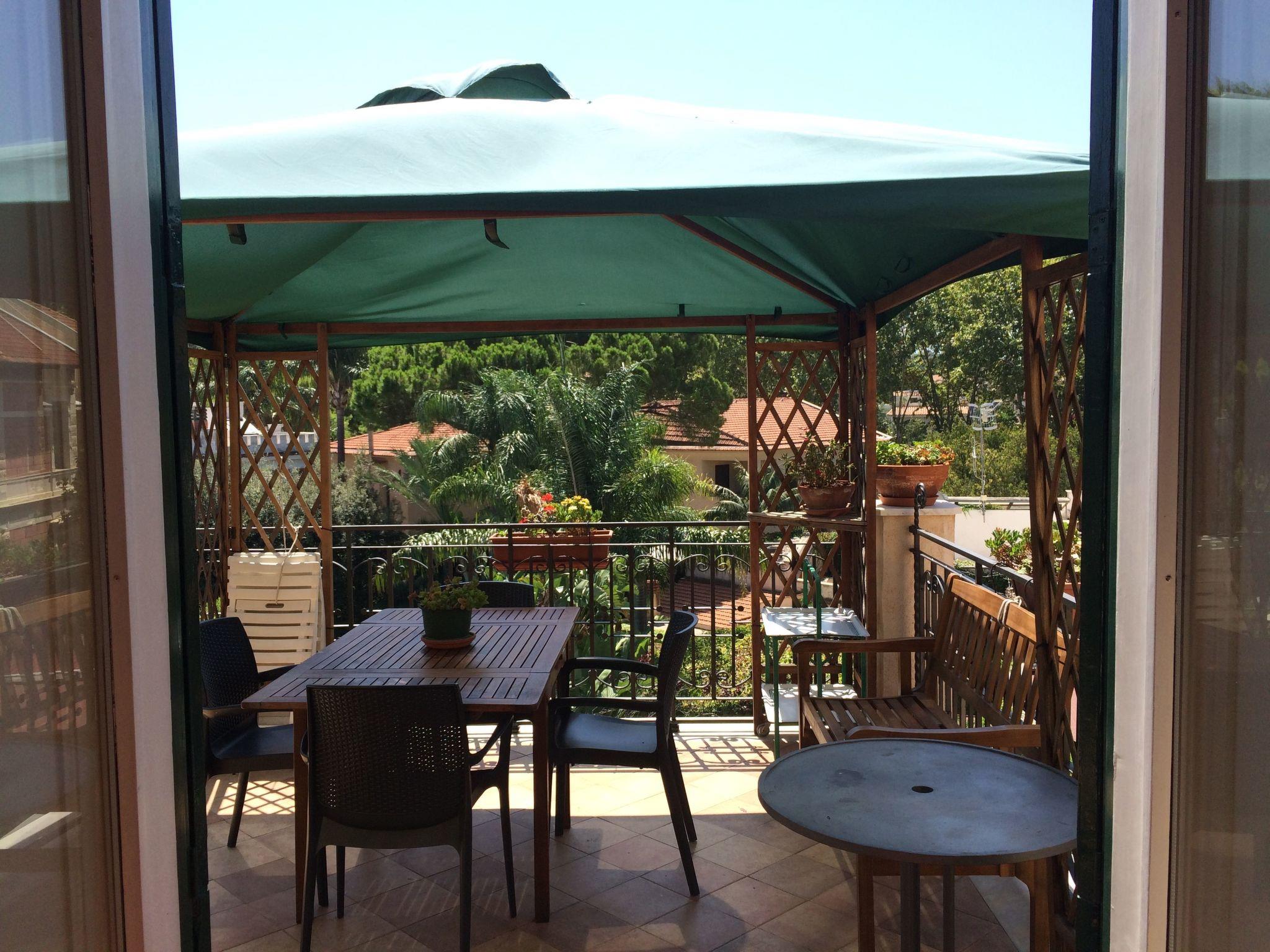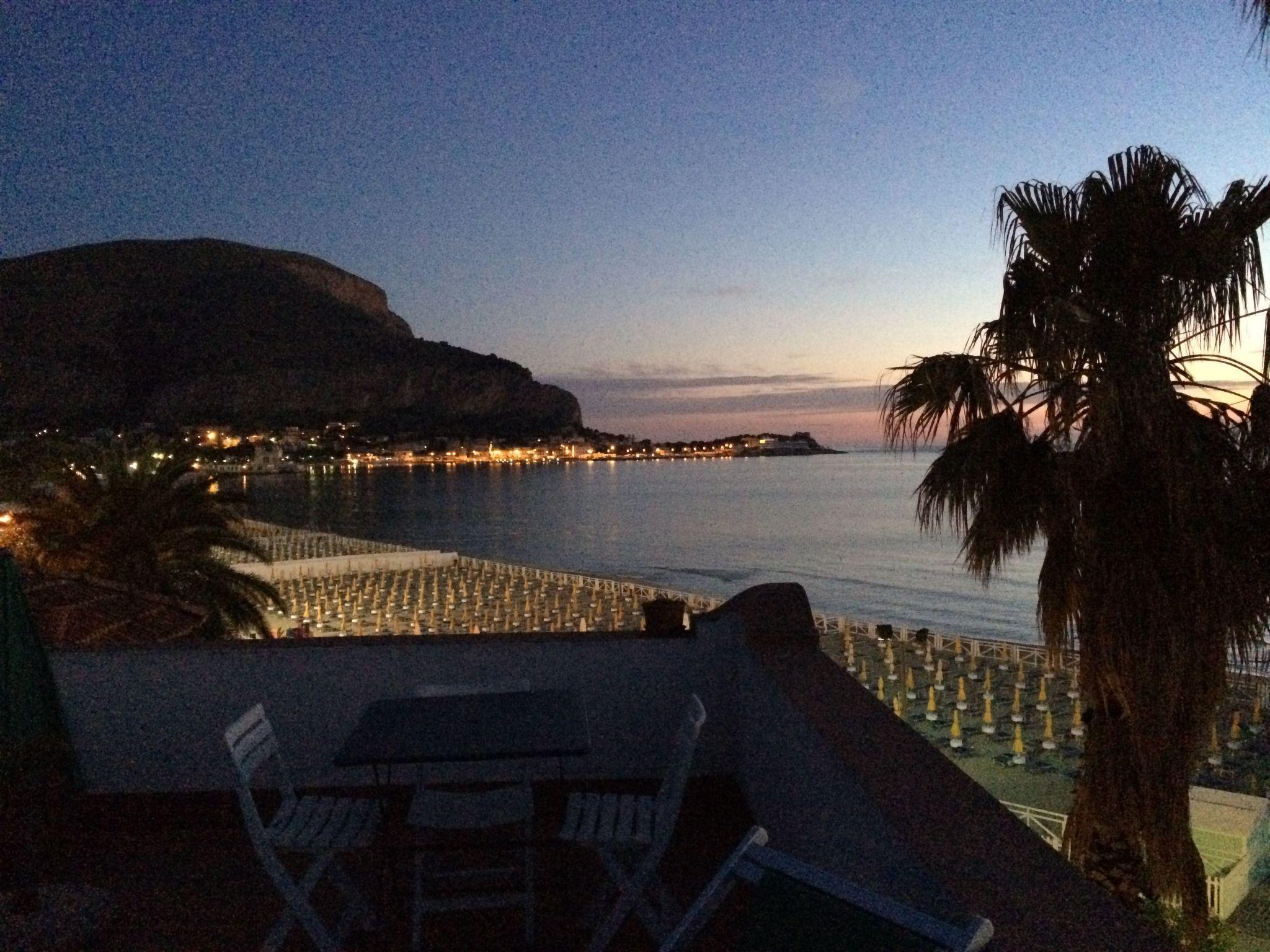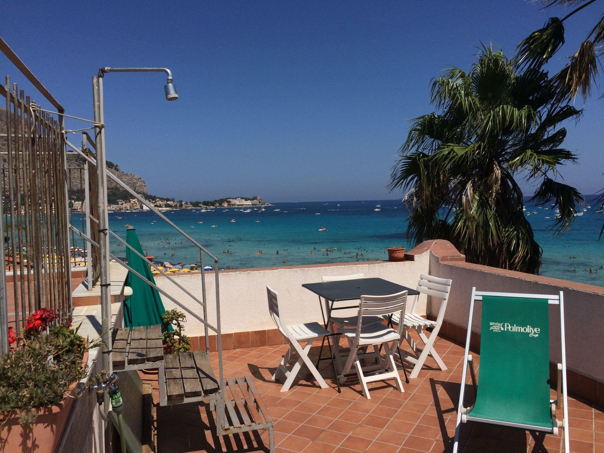From the dining room you have access to the first level terrace with gazebo, outdoor dining table, bench, armchairs, recliner, outdoor chairs, barbacue, From this terrace you have access, via a rather steep iron staircase, to the second terrace with a wonderful view over the entire gulf of Mondello, shower, deckchairs, outdoor table, sunshade.