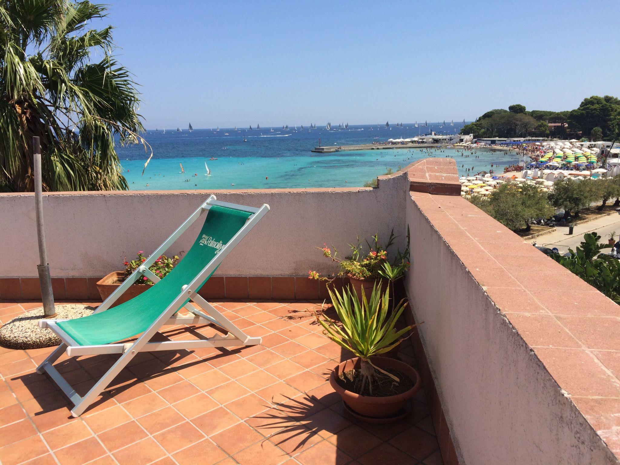 From here again, via three comfortable steps, you access a further third large terrace with deckchairs and sunshade, with a 360-degree view of the gulf and the mountains behind. Considering that the sea is 30 metres away, this is a unique and unforgettable location.
