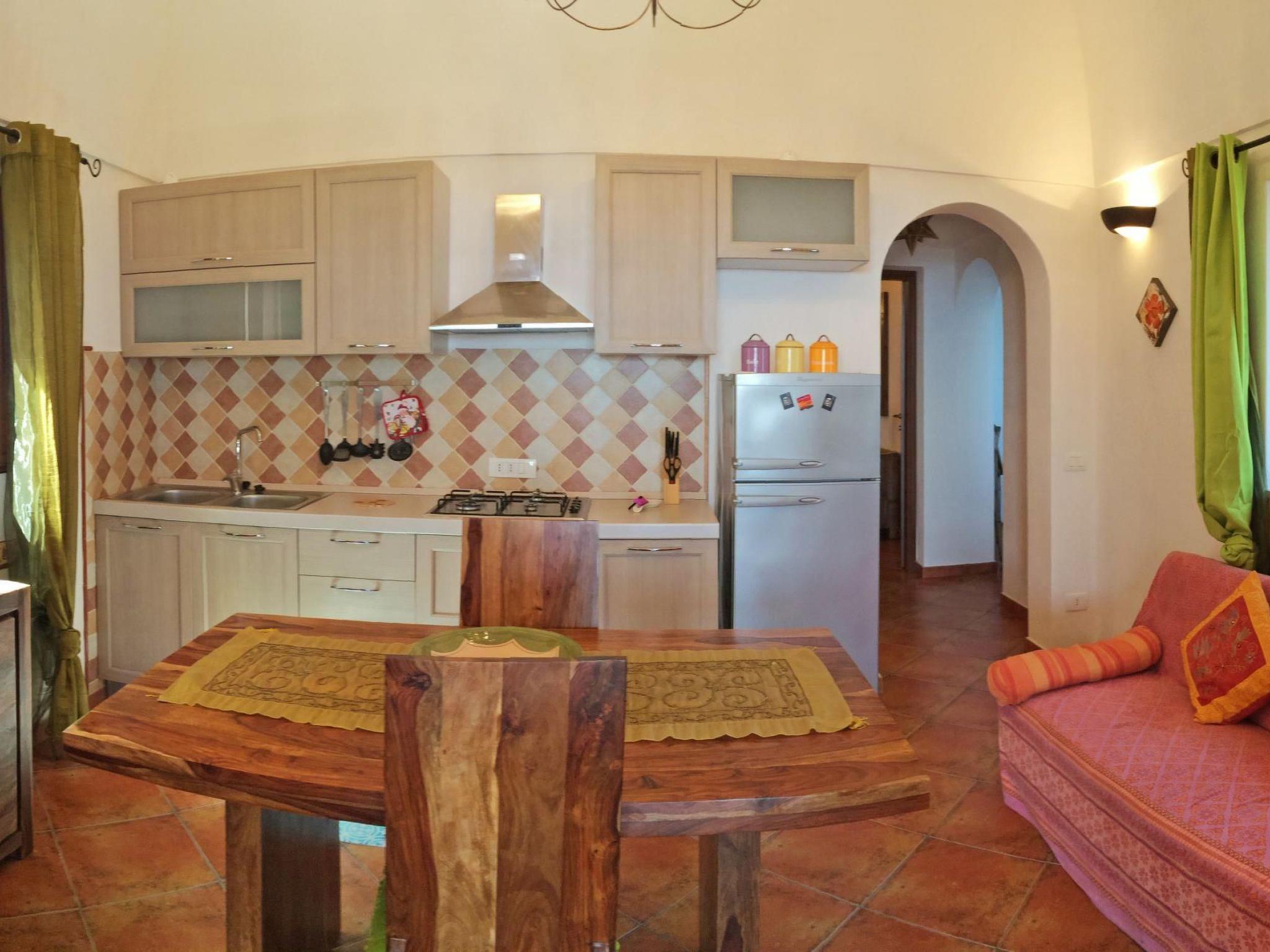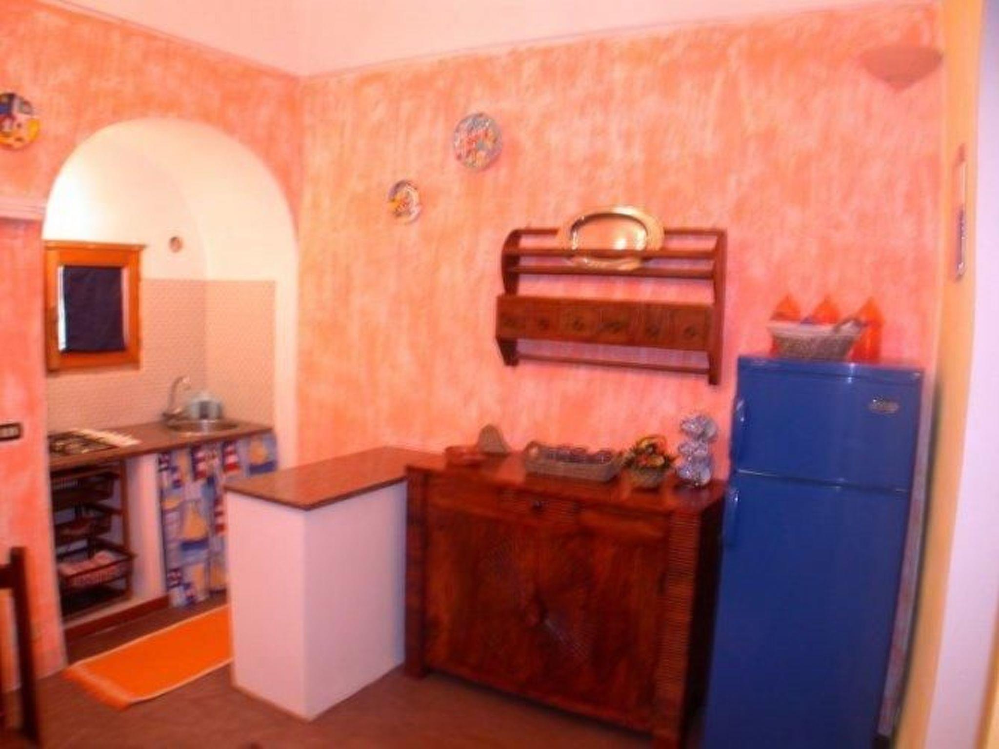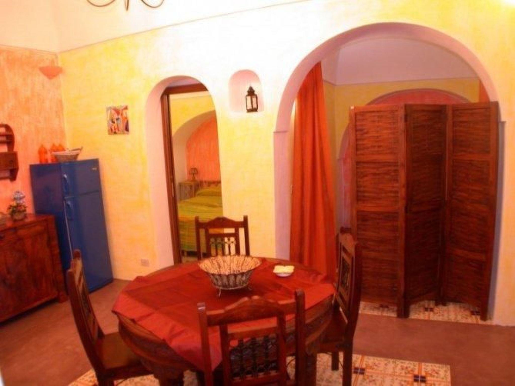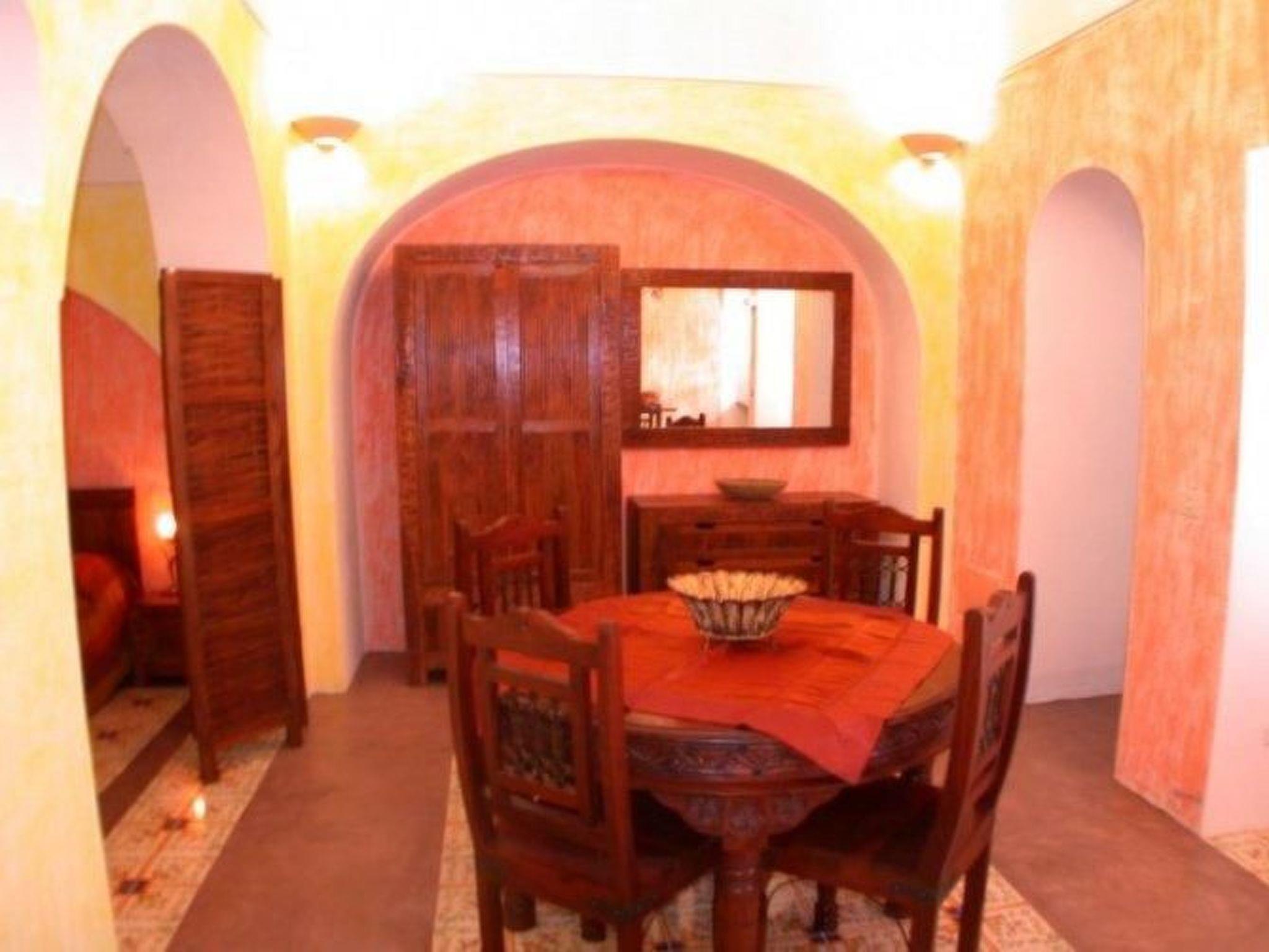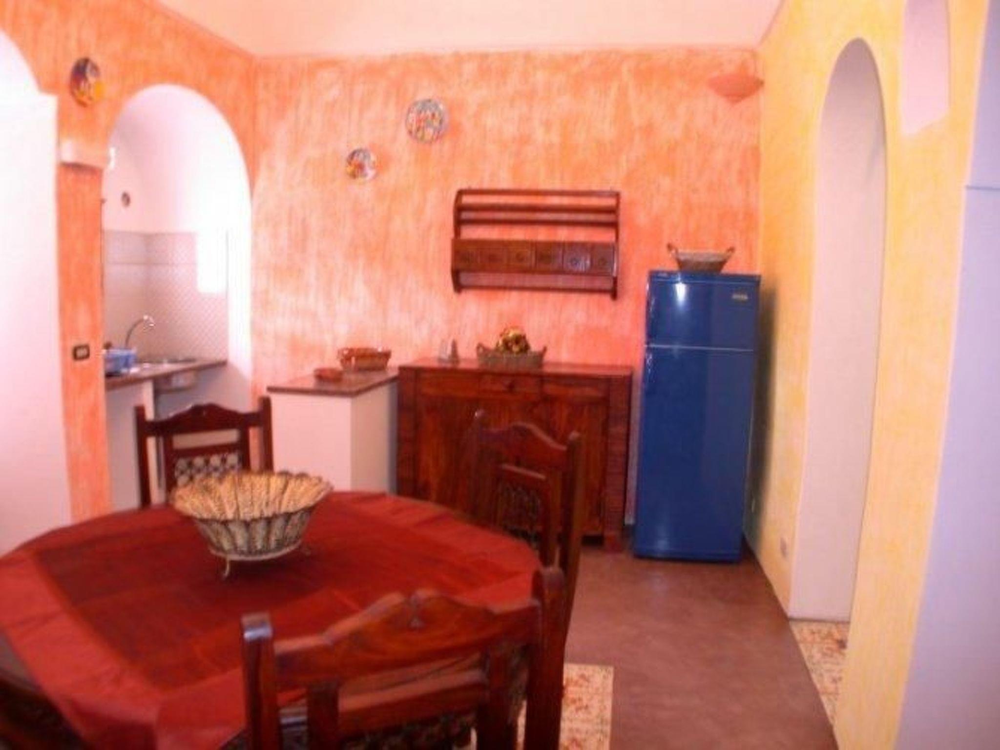 The structure reflects the structural characteristics of the old Dammusi construction. A sleeping area with a double bed and a bedroom with two single beds adjacent to the living room are quite typical. If necessary, the two single beds can also be joined to form a double bed. The living room is equipped with a kitchenette and dining table. Of course there is also a bathroom with shower. The furnishings are simple and functional.