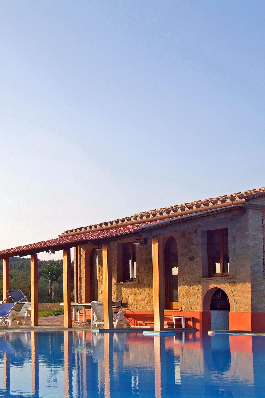 Agriturismo, 2 storeys. 7 houses in the residence. 9 apartments in the residence. 5 km from the centre of Peccioli, 15 km from the centre of Lajatico, in a quiet position on top of a hill, 50 km from the sea. For shared use: property 5 ha with trees, meadow, swimming pool (16 x 8 m, depth 140 cm, seasonal availability: 24.Apr. - 02.Oct.). Shower/WC in the pool area, outdoor shower, tennis (extra), garden furniture, children's playground. In the house: table tennis, table football, washing machine (for shared use, extra). 900 m long motor access (via unmade road). Roofed, parking on the premises. Shop 2.5 km, supermarket 5 km, bus stop 1 km, natural swimming pond 10 km. Riding stable 5 km, walking paths from the house 2 km. Nearby attractions: Volterra 30 km, Pisa 50 km. Hiking paths: Mountain Bike Le Serre 8 km, Bosco di Ortaglia 8 km. Local sale of farm products.