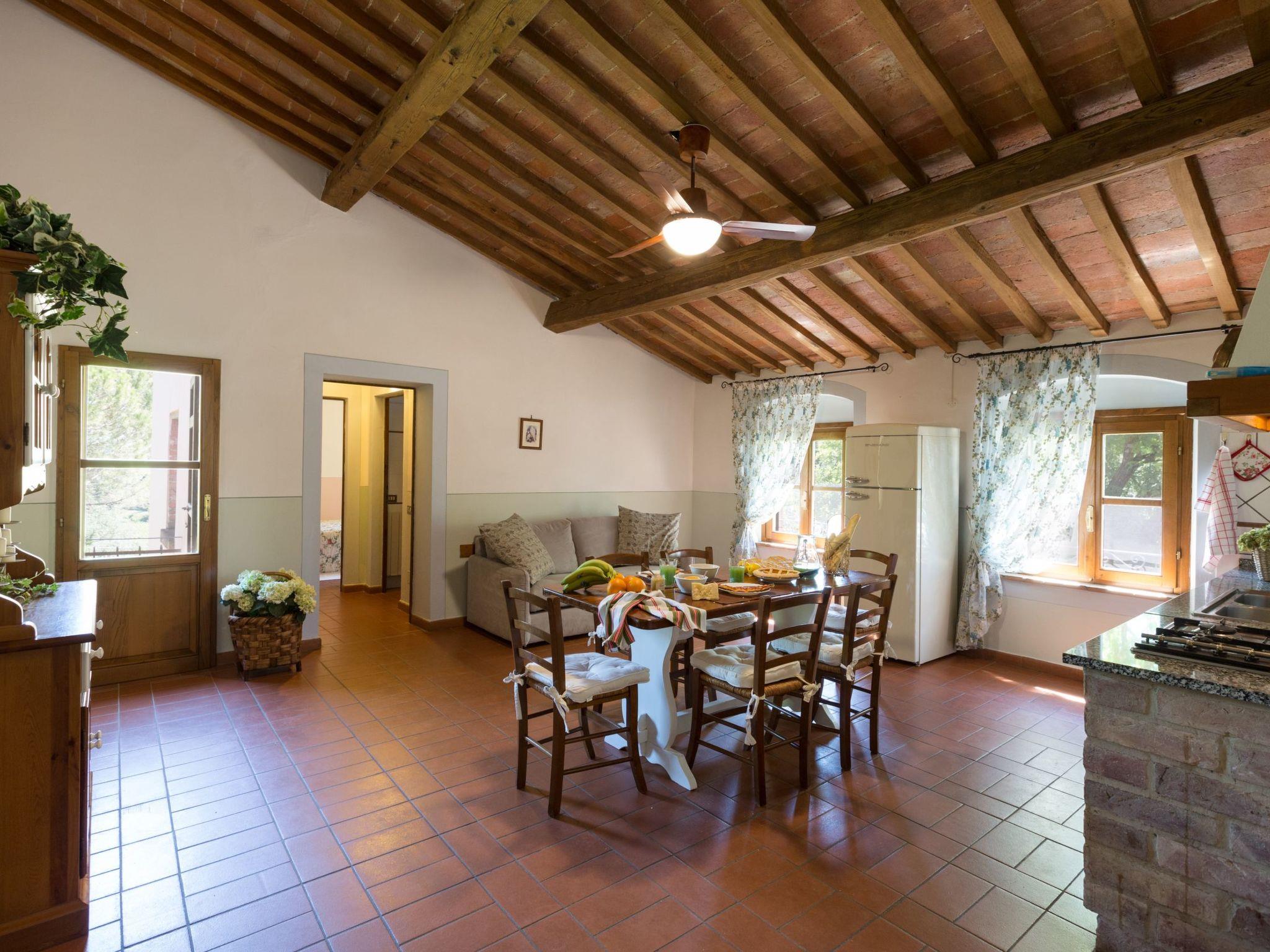 The typical Tuscan farmhouse is situated in a very beautiful and quiet location. It is situated on a hill and is surrounded by vineyards and olive groves, which turn the landscape into a colourful and wonderful spectacle in every season. Thanks to its central location, this property is an ideal starting point for excursions to Florence (80 km), Pisa (50 km), Lucca (70 km), Volterra (20 km) or San Gimignano (30 km).