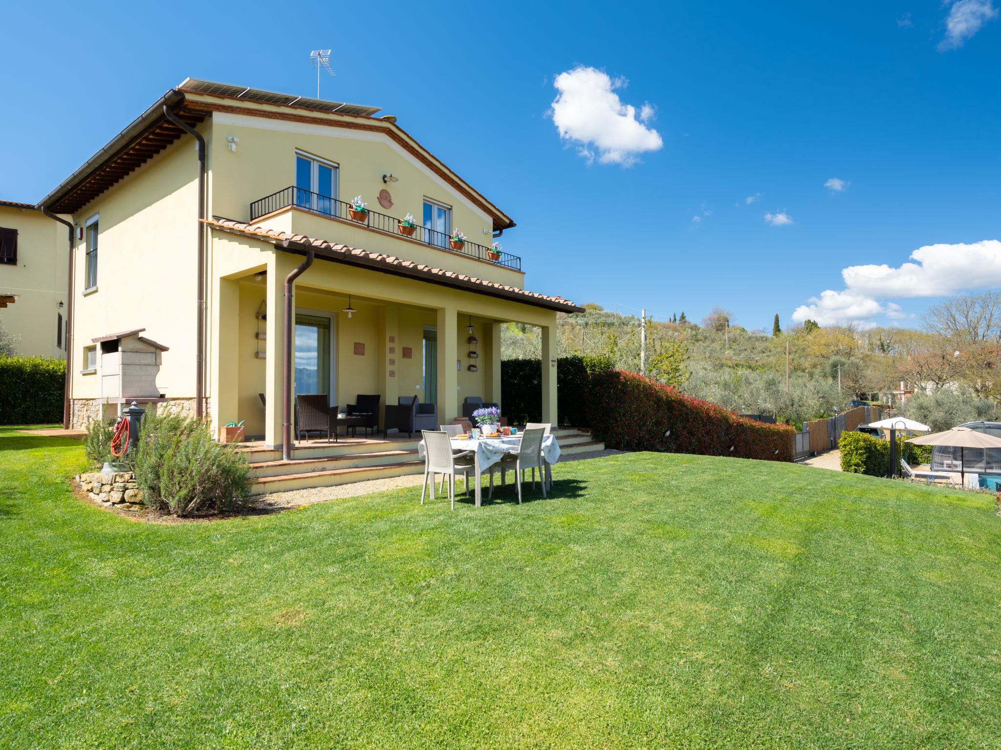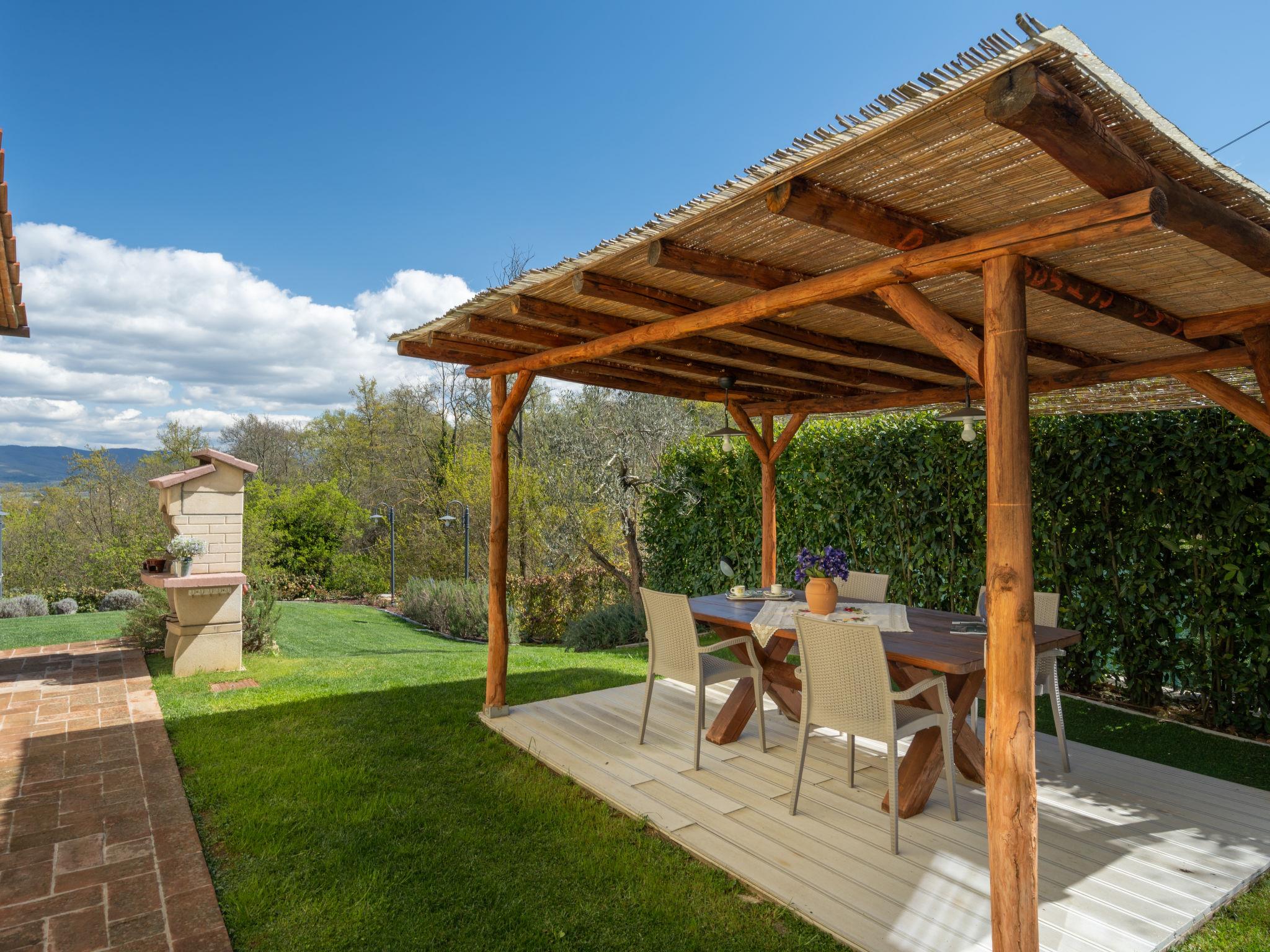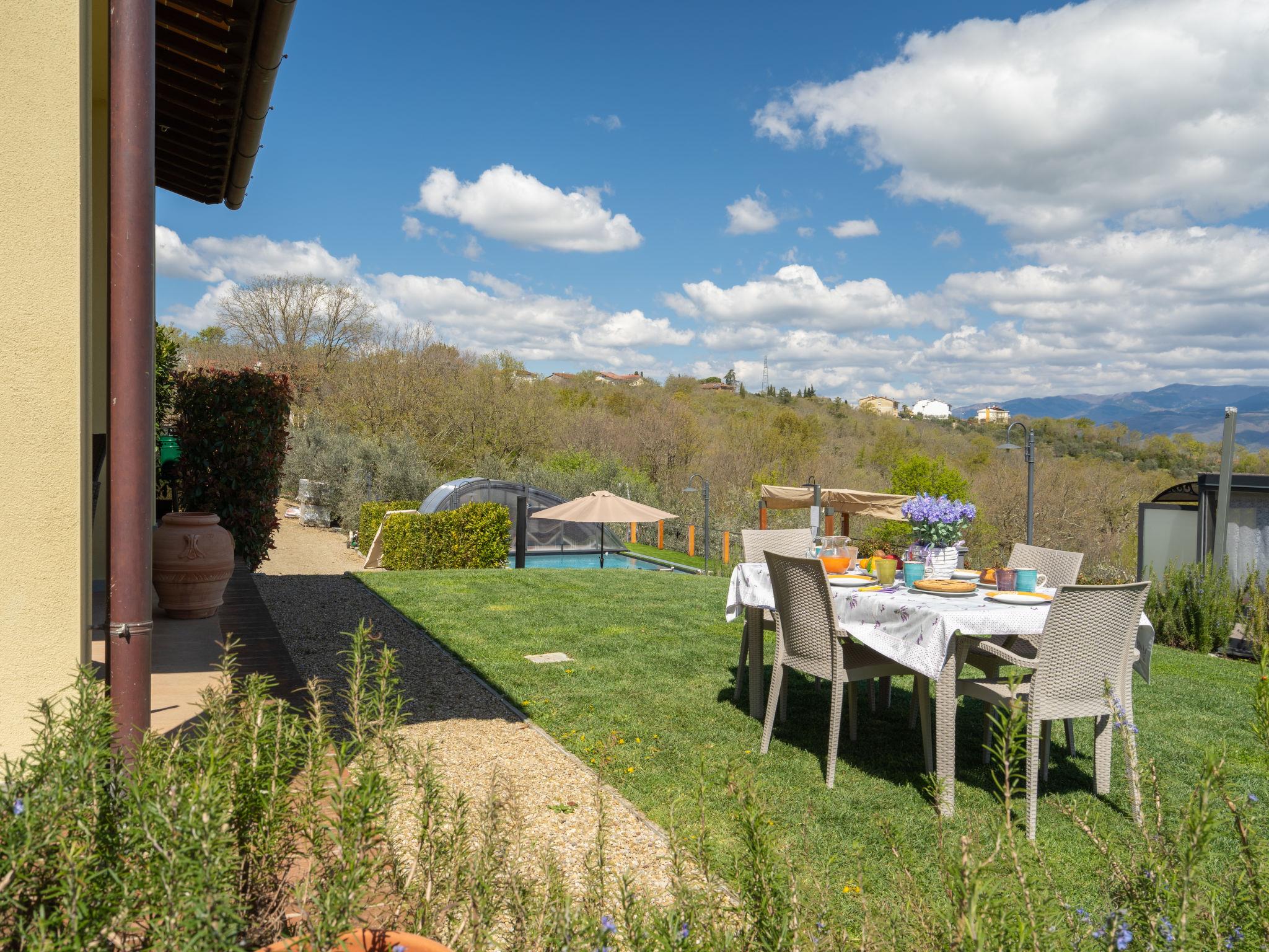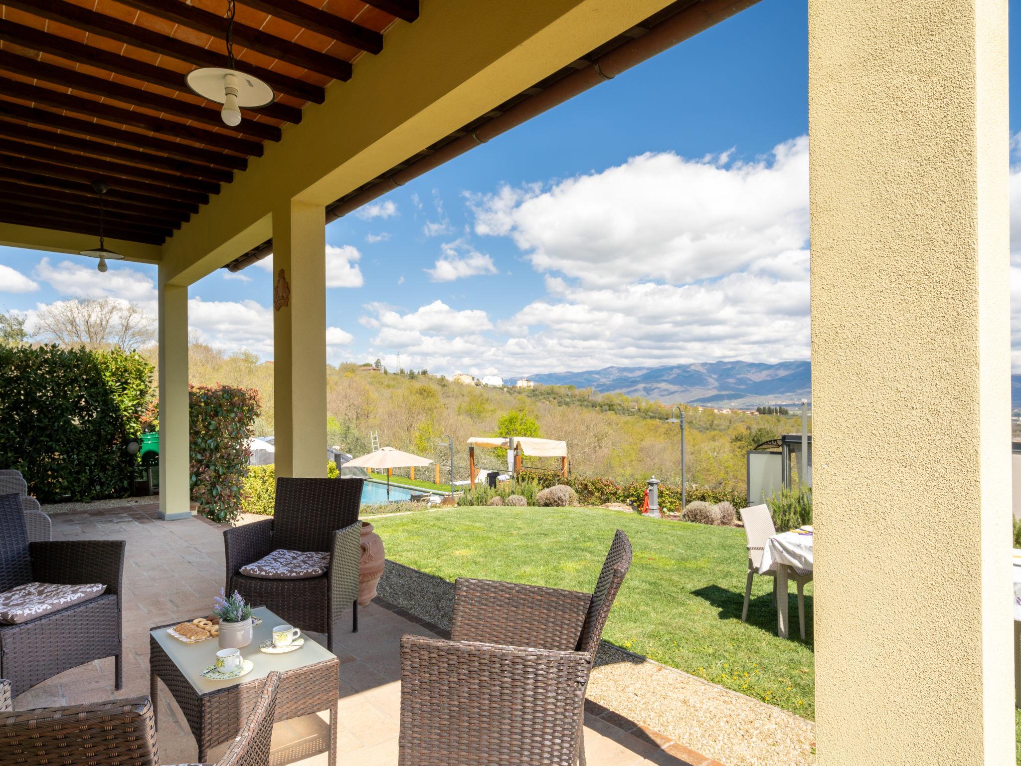 Comfortable single-family house "Pianelli". 1 km from the centre of Pergine Valdarno, 15 km from the centre of Arezzo, 40 km from the centre of Siena, on a slope, in the countryside. Private: property 1'500 m2 (fenced), terraced garden lawn and wildlife garden, swimming pool heated (8 x 4 m, seasonal availability: 10.Apr. - 25.Oct., extra). Outdoor shower, pergola, terrace, garden furniture, barbecue, pool maintenance by the owner/gardener. In the house: sauna (extra). Hot tub (extra). Burglar alarm system. 500 m long motor access (via unmade road). Parking (for 2 cars) on the premises. E-charging station. Supermarket 1 km, bus stop 1 km. Nearby attractions: Arezzo 20 km, Firenze 65 km, Monte San Savino 29 km, Cortona 48 km, Castiglion Fiorentino 37 km. Guarded residence.