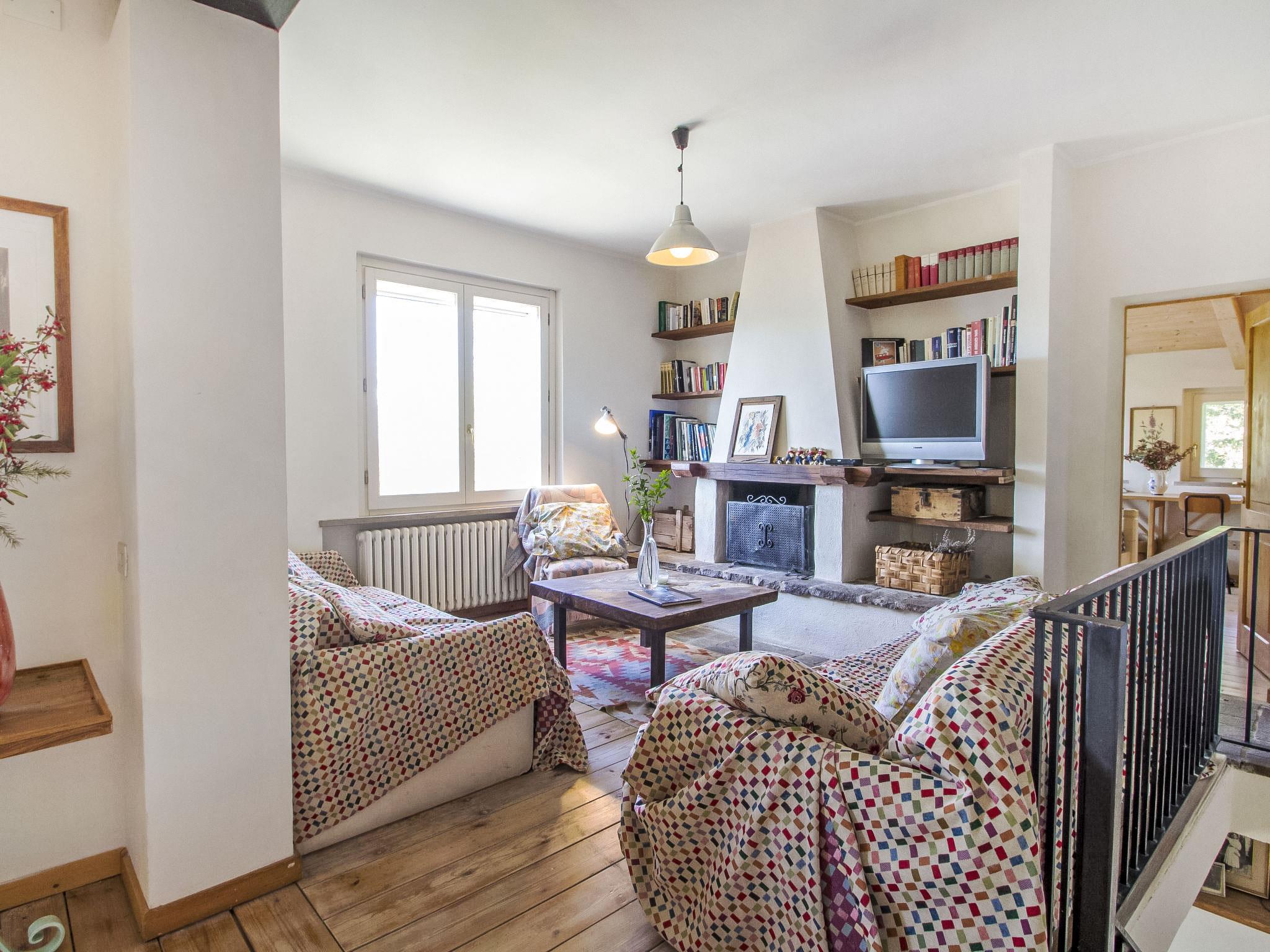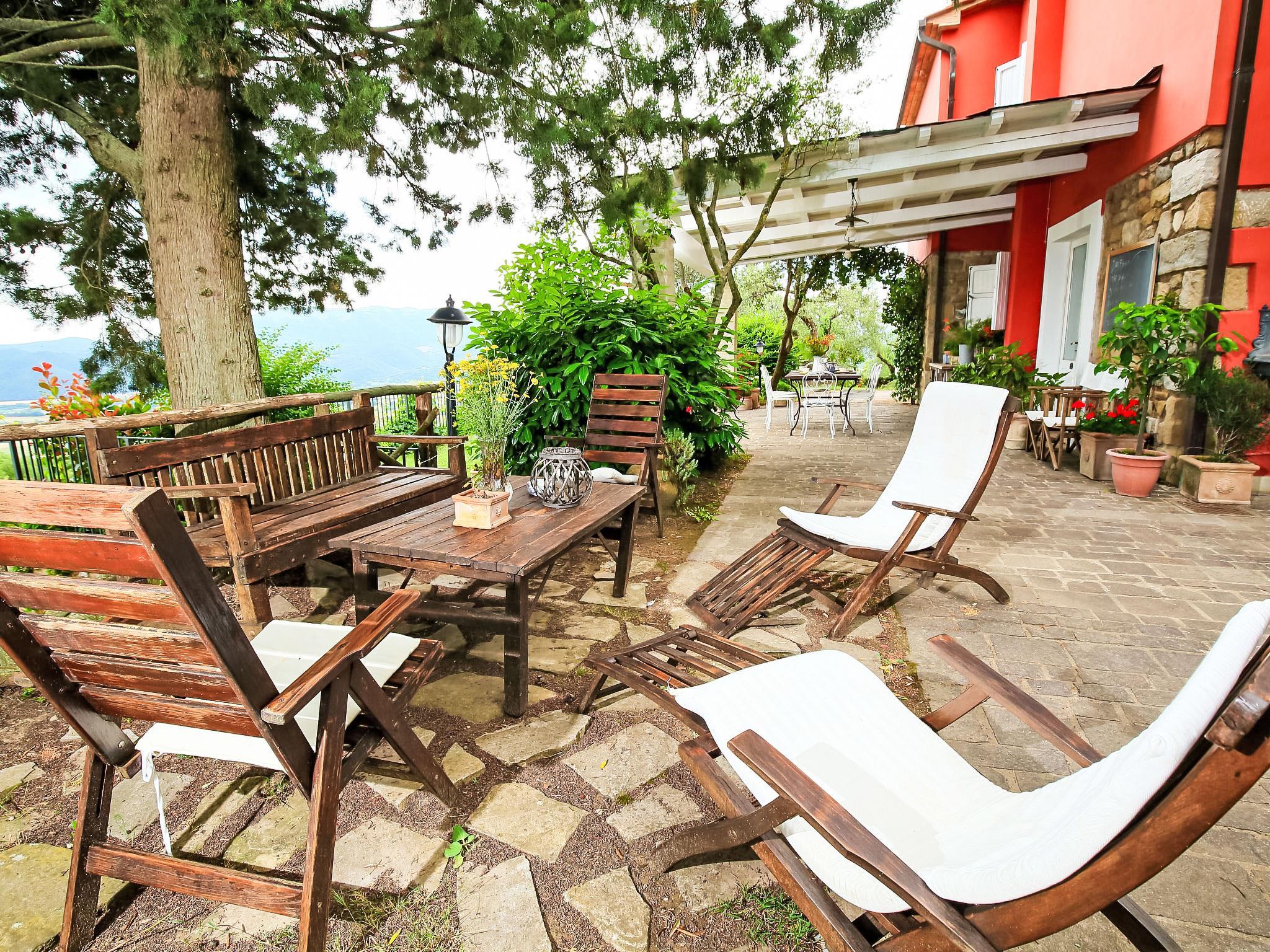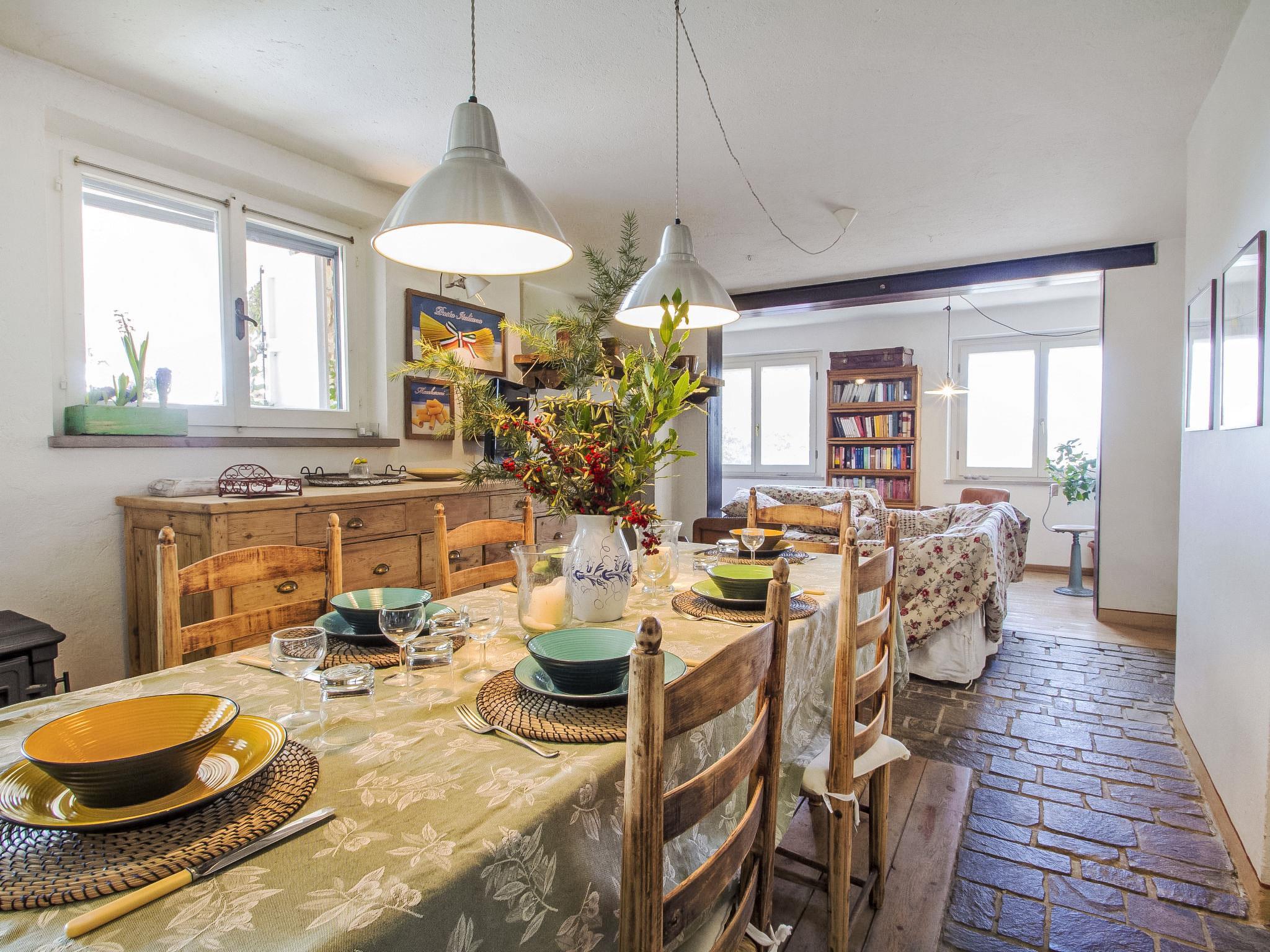 " Paradiso", 7-room villa 300 m2 on 2 levels, on the ground floor. Very beautiful and tasteful furnishings: entrance hall with tiled stove. Exit to the garden. Large living/dining room with open-hearth fireplace, TV, flat screen and heating stove. Exit to the garden. Living/sleeping room with 1 x 2 bunk beds, 1 double bed, kitchen corner, bath/bidet/WC, heating stove and air conditioning. Exit to the garden. Kitchen-/living room (5 hot plates, oven, dishwasher, microwave, freezer) with open-hearth fireplace, dining table and TV (flat screen), wood-burning stove. Exit to the loggia. Shower/bidet/WC. Upper floor: large living/dining room with open-hearth fireplace, TV and flat screen. 1 double bedroom with shower/bidet/WC, TV, flat screen and air conditioning. Exit to the garden. 1 double bedroom with Dressing room. 1 room with 2 beds, TV, flat screen and air conditioning. Exit to the garden. Bath/bidet/WC, hydro massage bath. Wood heating, solar energy heating. Wooden floors, natural stone floors. Panoramic view of the valley. Facilities: washing machine, mosquito net, hair dryer. Internet (WiFi). E-charging station. 1 small pet/ dog allowed. The living room with double bed on the mezzanine, bunk beds, kitchenette and bathroom, is located in the beautiful and welcoming annex situated in the garden just a few metres from the swimming pool. In case the house is booked for six people, the annex will be excluded from the rent. Smart TV available in the main House. When there are less than the maximum number of guests staying at the property, the annex will not be available for use. IT054039C204033329