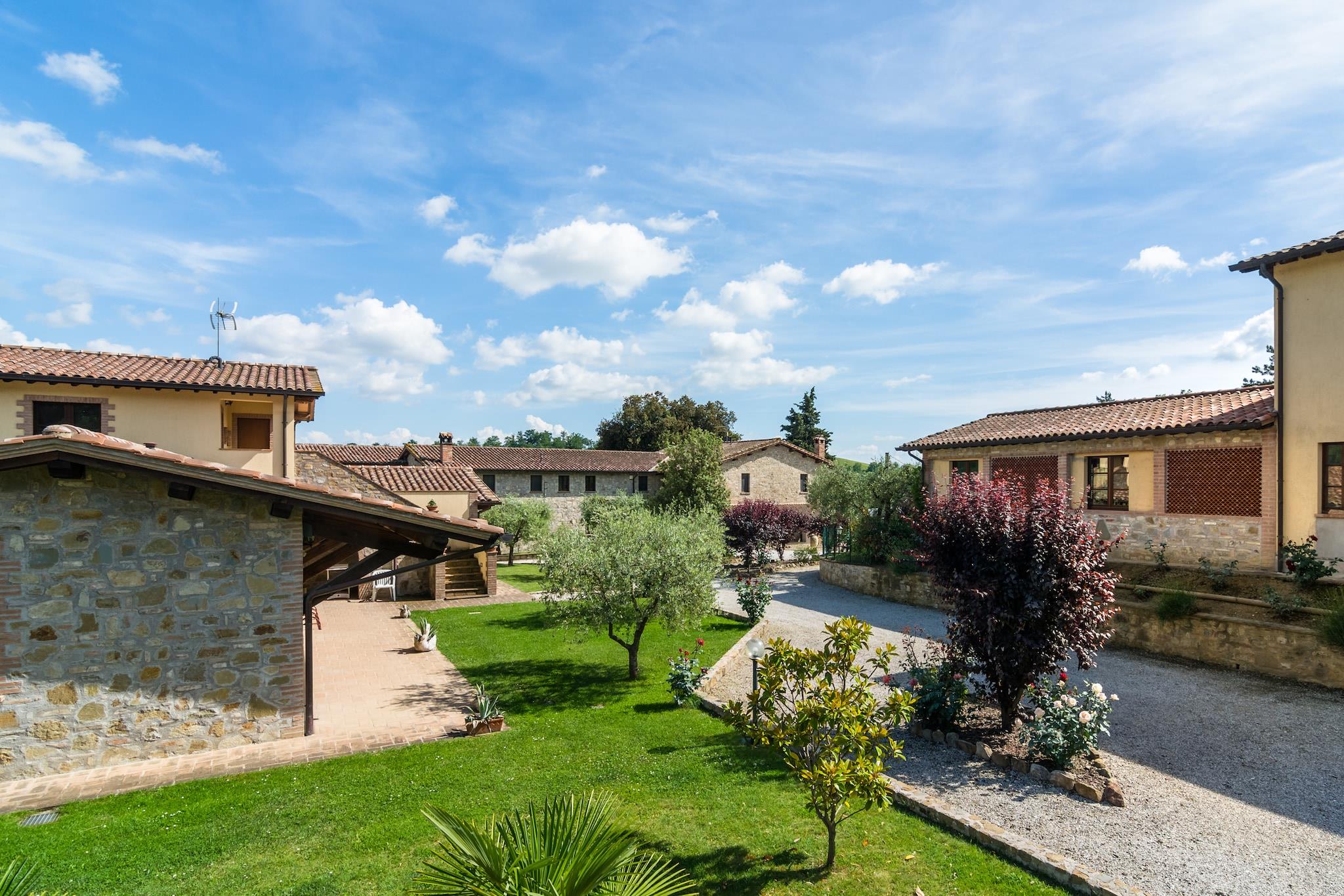 Denne bondegård bestående af 5 lejligheder med aircondition er nedsænket i de grønne umbriske bakker, omgivet af en storslået natur, og tilbyder dem, der vælger det, muligheden for en fredelig ferie, væk fra byens larm og hektiske tempo. i et gammelt stenbondehus fra det 19. århundrede, fuldstændig renoveret med respekt for kanonerne fra den gamle umbriske landlige tradition, med særlig omhu for møblerne, der tilbyder et traditionelt varmt og indbydende miljø. "En ideel mulighed for at spise ude eller nyde et glas vin på behageligt sommeraftener. Ved siden af stuehuset er swimmingpoolen med jacuzzi-hjørne for at finde forfriskning på sommerdagene, for helt at opgive bylivets stress, et wellness-rum med jacuzzi. Dens strategiske placering tillader, hvem ønskede at forene et behageligt afslappende ophold på landet med besøg i de vigtigste og suggestive umbriske kunstbyer: Perugia, Gubbio, Assisi, Spello, Spoleto. I mere end fyrre år har virksomheden været involveret i dyrkning af korn, avl af kvæg og svin, vindyrkning og olivendyrkning, med egen produktion af ekstra jomfru olivenolie, vin og speget kød. Alt dette har for nyligt fået selskab af agriturisme-aktiviteten. Brugen af wellness-området er mod betaling, efter anmodning baseret på tilgængelighed og aftales på stedet (rabatter for børn under 12 år).