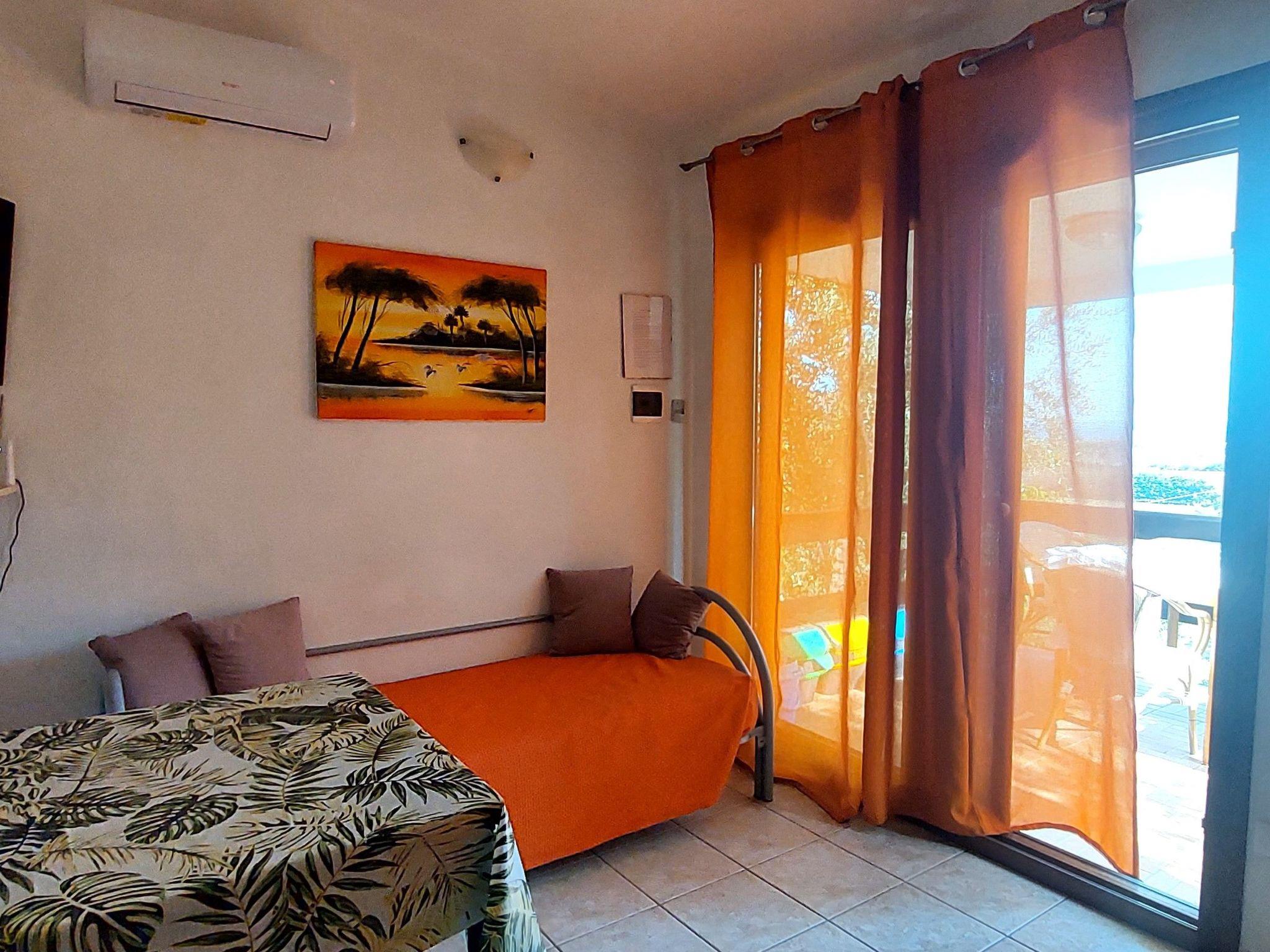 The house is at ground level. It offers a bedroom with double bed. Furthermore there is a kitchenette in the living room as well as a TV. The bathroom has a shower. The washing machine with coin slot is also available.