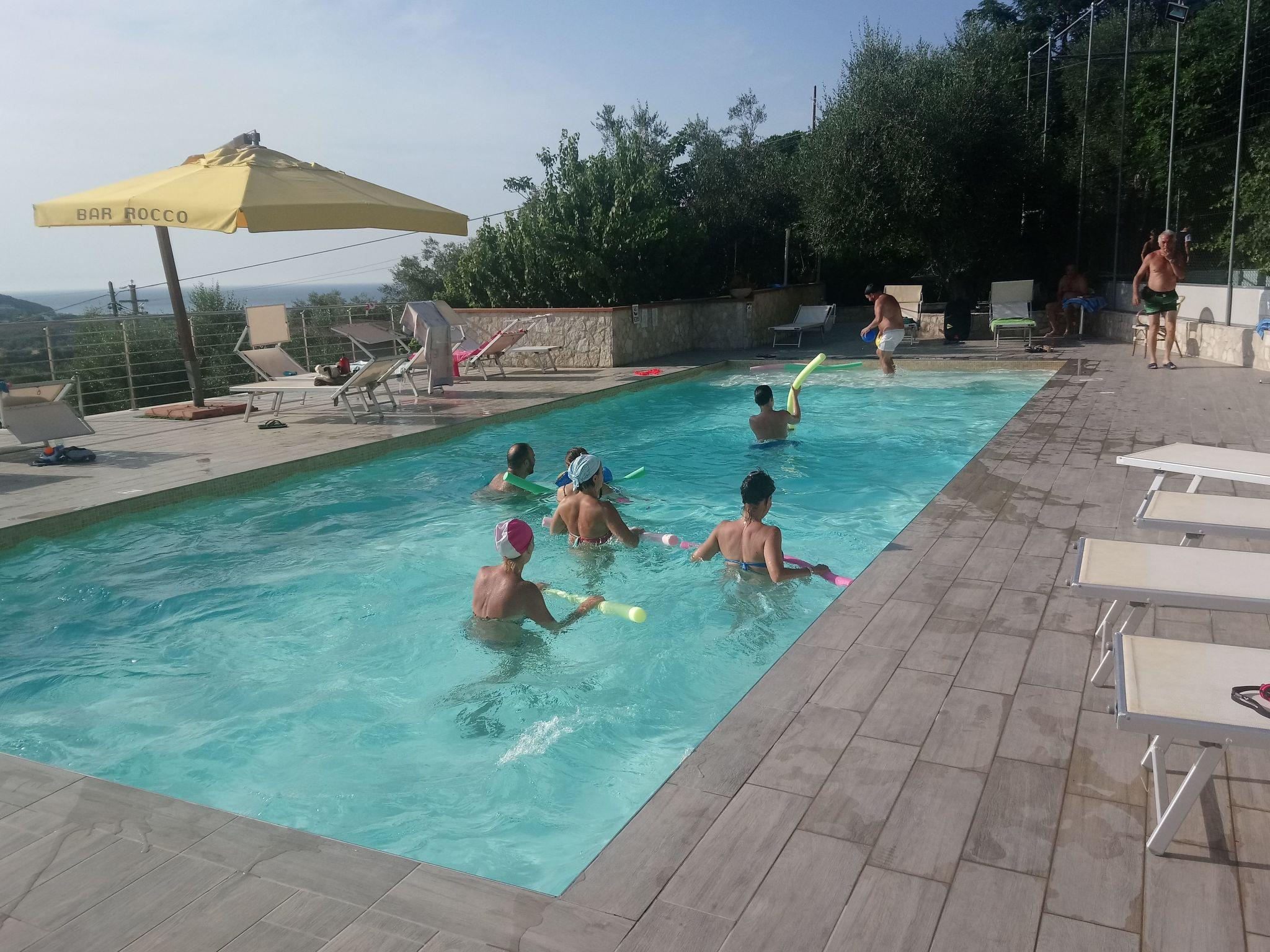 There is a veranda with sea view where one can enjoy a meal. Furthermore you will find a fenced car park, a garden, barbecue, playground and swimming pool for children.