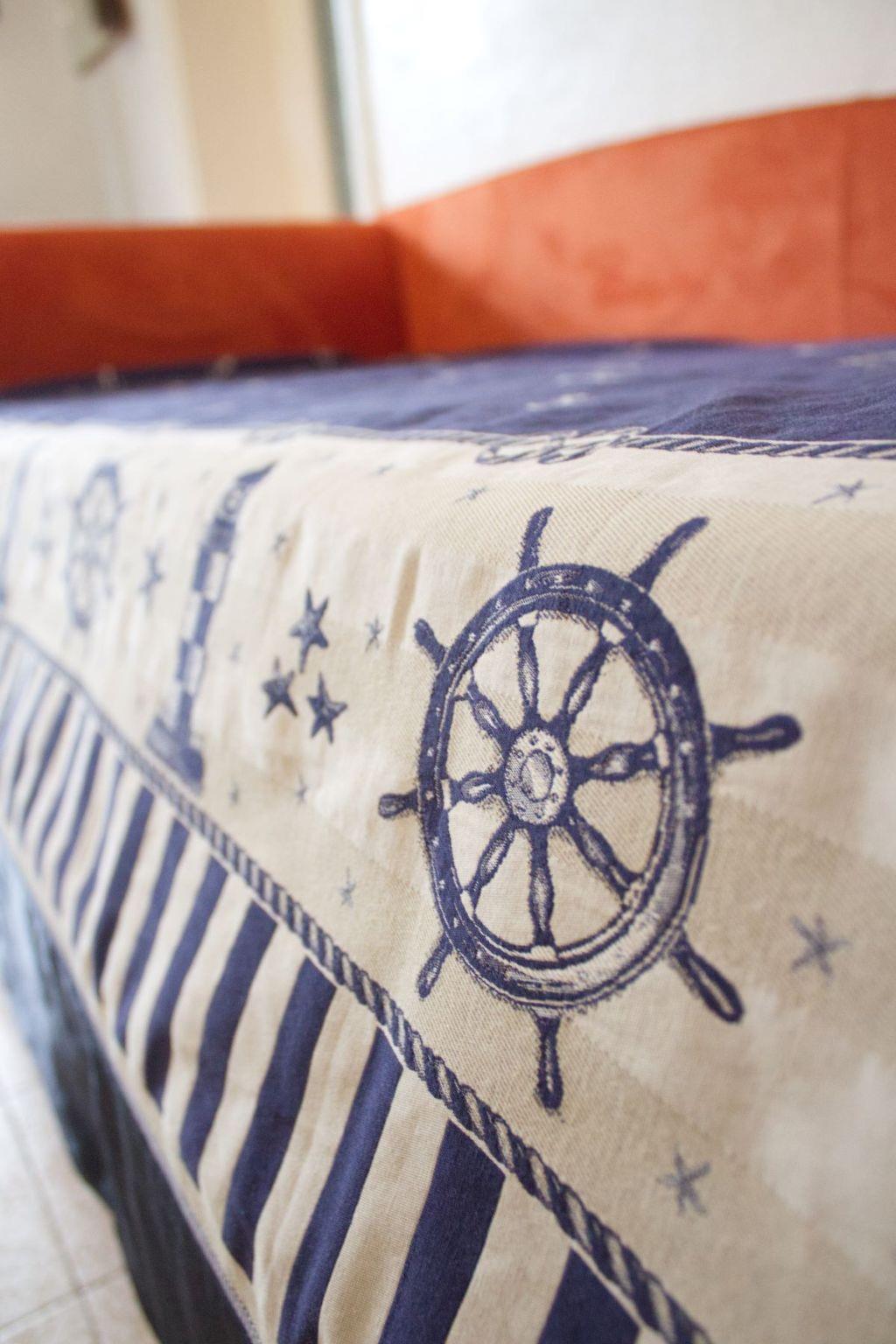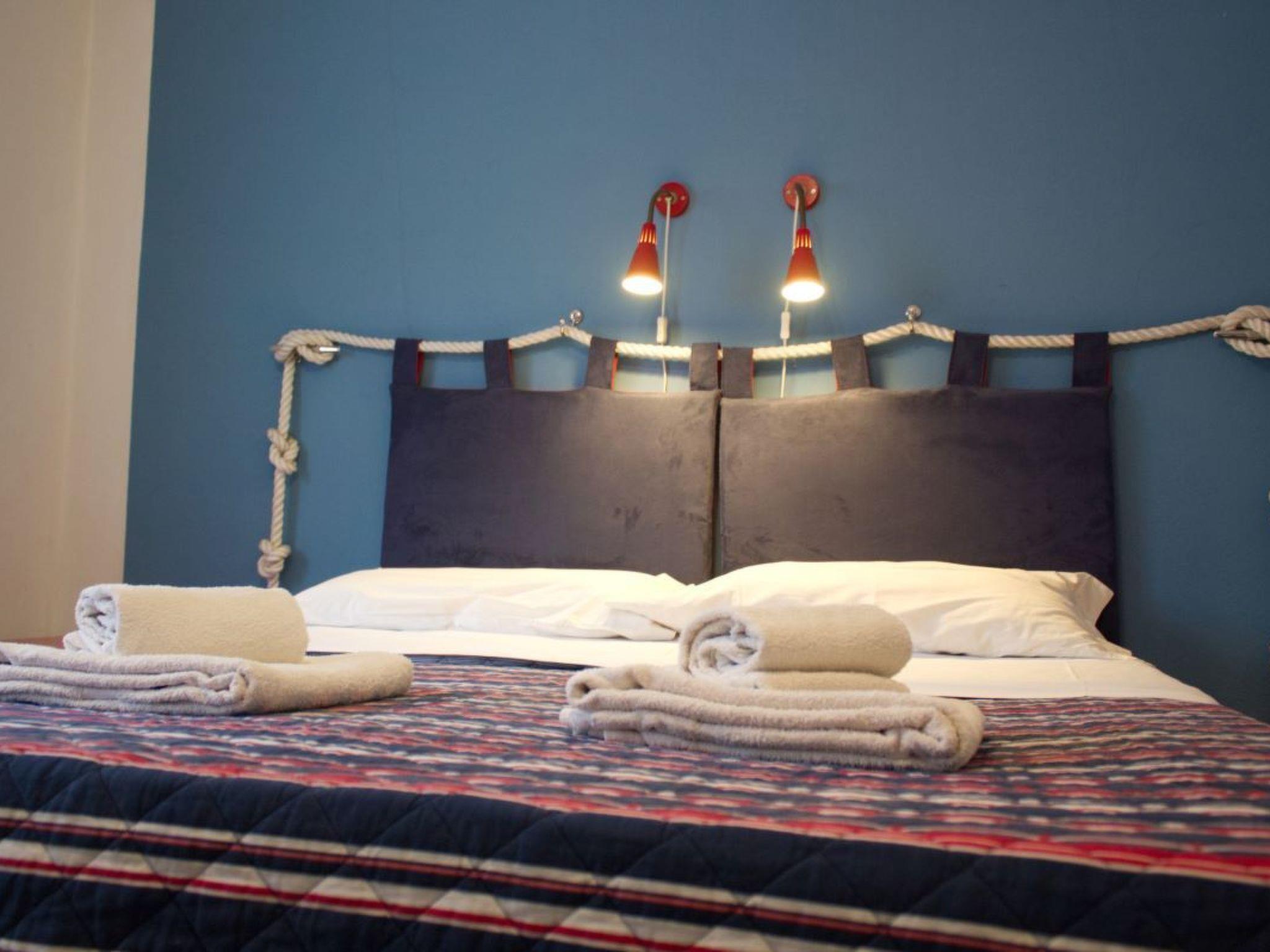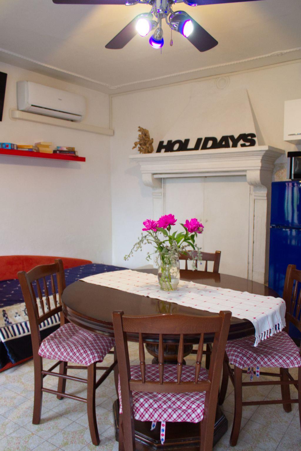- Two-room apartment (blue) on the ground floor, about 55 sq m, consisting of bedroom with double bed and bunk bed, ceiling fan and wardrobe; living room with table and chairs, sofa bed (190x120), ceiling fan, bathroom with shower, washbasin, bidet and toilet (accessible for the disabled), TV. Heating/air conditioning on request with electric meter. The following equipment and services are included in the price: Kitchenette equipped with gas cooker, sink, crockery, dishes, cutlery, microwave, fridge and freezer, tablecloth, tea towels. Tourist tax, gas, electricity, bath towel, weekly change of linen, final cleaning. Free Internet wi-fi (max.speed 128 Kbsp).