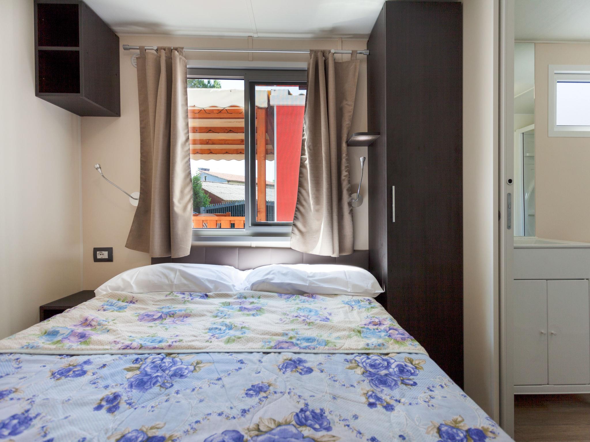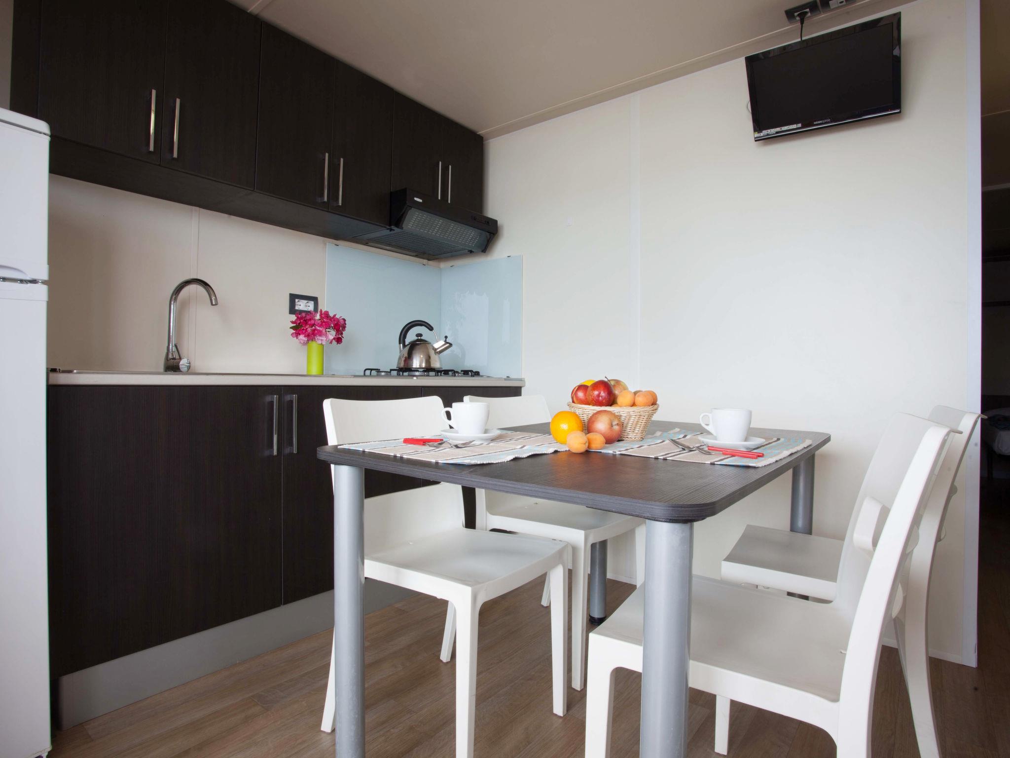 "Baia Relax New Plus", 3-room mobile home 25 m2. Modern furnishings: living/dining room with dining table and TV. 1 room with 1 french bed (140 cm). 1 room with 2 beds (70 cm), 1 x 1 bunk beds (65 cm, length 170 cm). Kitchenette (4 gas rings, freezer). Shower/WC. Air-conditioning, forced-air heating (extra). Terrace roofed. Terrace furniture. Facilities: baby cot for up to 2 year olds (extra). Parking (1 car). Please note: non-smokers only. Bed layout is flexible. There are more sleeping options available than the maximum number of people allowed which may, however, not be exceeded. IT023022B1P4KHX4L9
