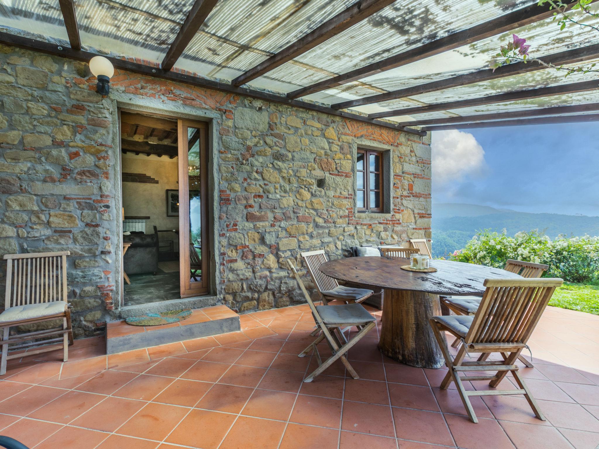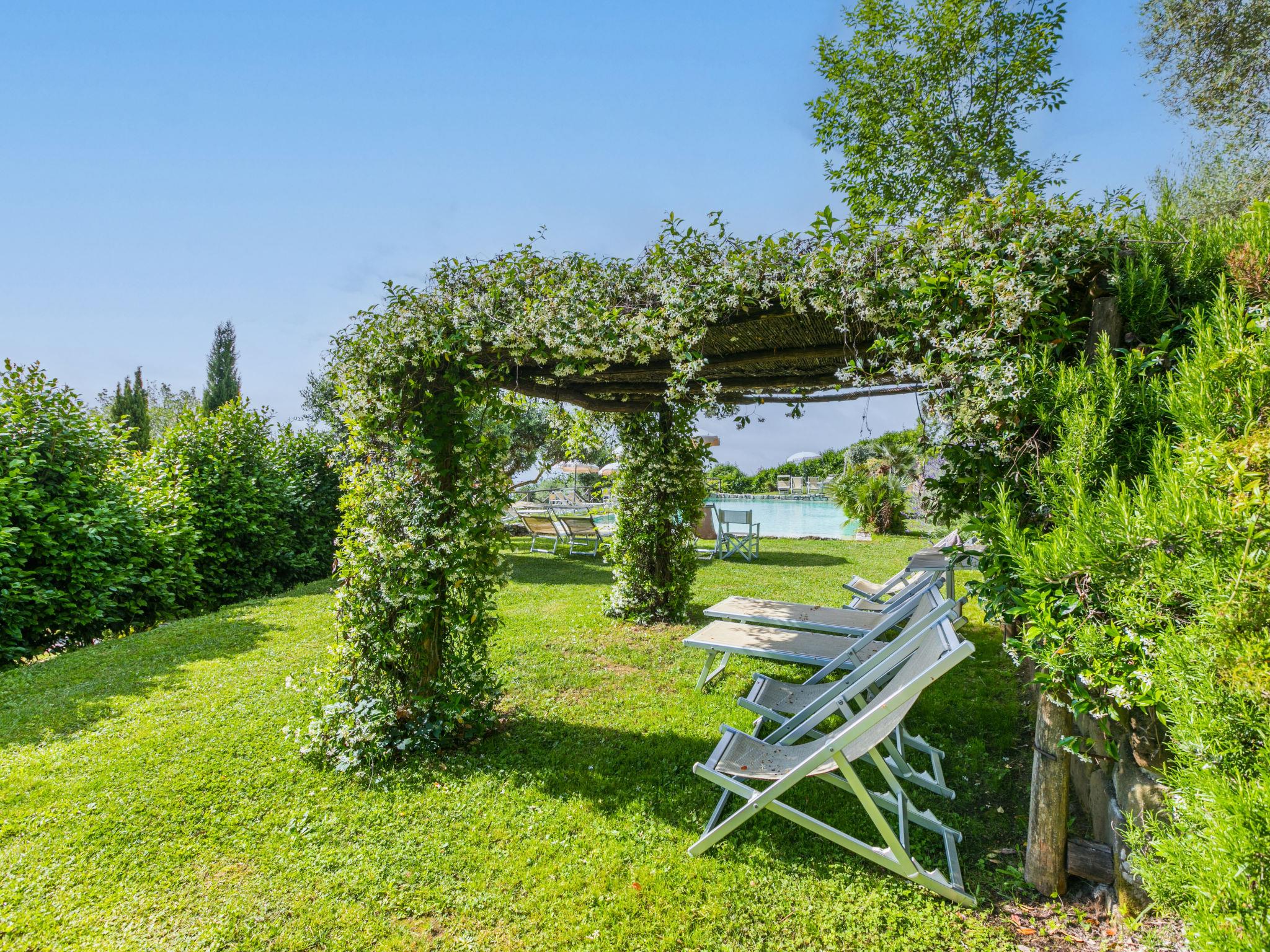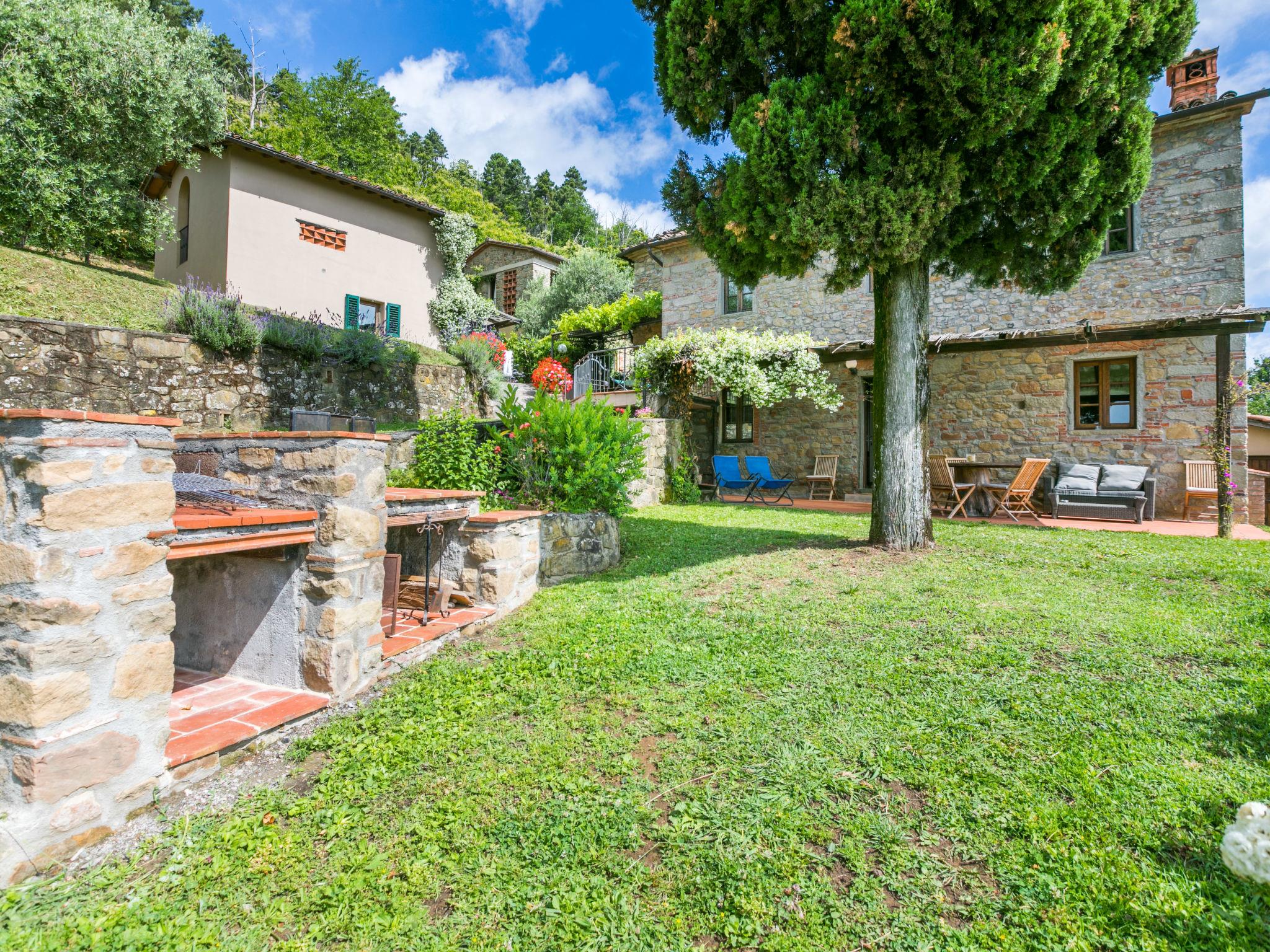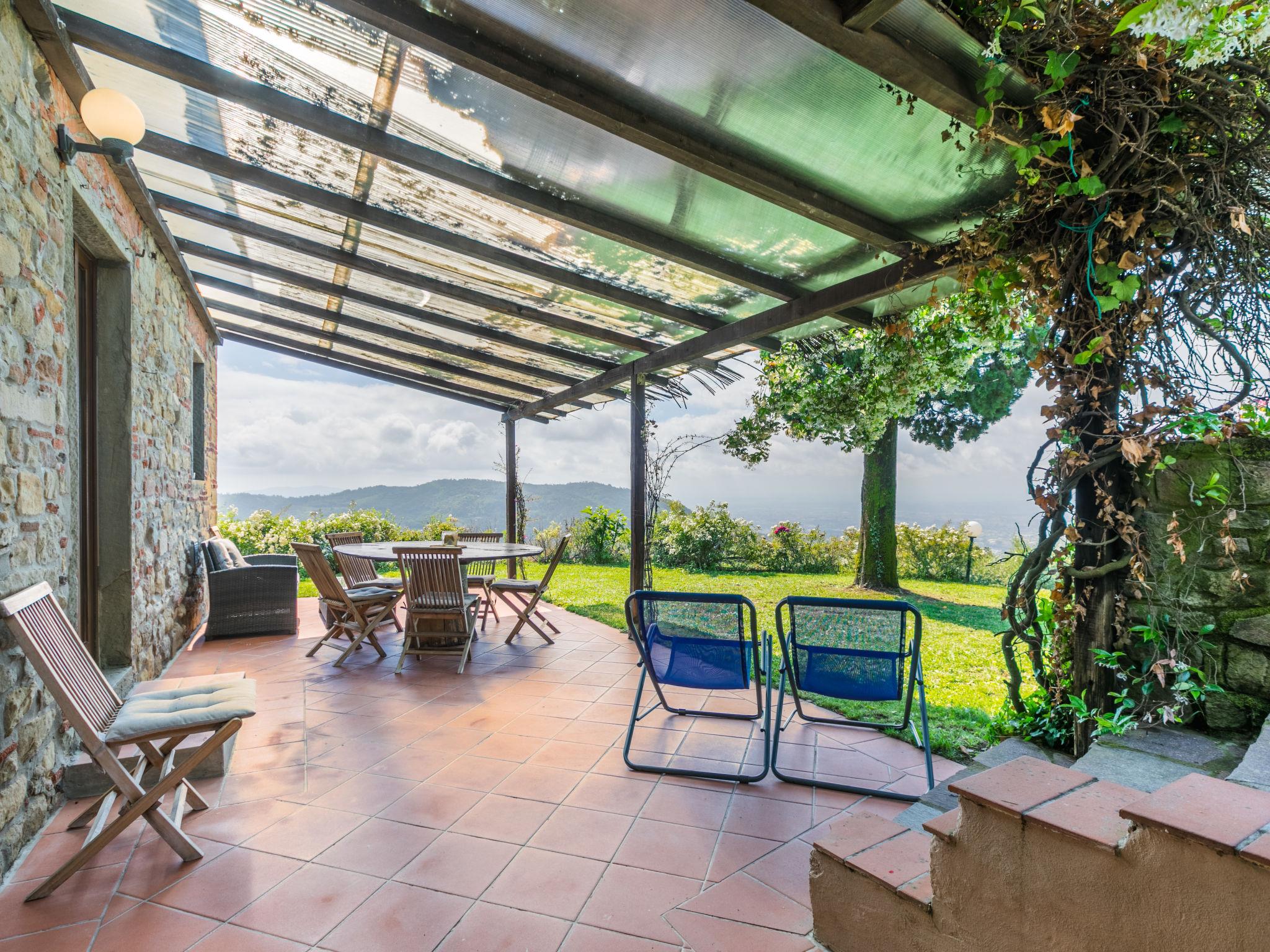 Agriturismo "La Cupola", 500 m a.s.l., surrounded by trees and vineyards. 3 houses in the residence. 4 apartments in the residence. 5.5 km from the centre of Pescia, 20 km from the centre of Lucca, 45 km from the centre of Pisa, in a secluded position on a slope, 57 km from the sea, in the countryside. For shared use: property 40'000 m2, terraced garden (not fenced) with plants, meadow, swimming pool (19 x 8 m, depth 120 - 160 cm, seasonal availability: 26.Apr. - 27.Sep.). Children's pool, pergola, garden furniture, barbecue. In the house: WiFi, central heating system, washing machine (for shared use), heating to be paid on the spot, heating available only from 01.Nov. - 30.Mar.. 600 m long steep motor access (via unmade road). Parking on the premises. E-charging station. Supermarket 5.5 km, bus stop 3 km, sandy beach "Viareggio" 57 km. Golf course (18 hole) 14 km. Nearby attractions: Collodi 9 km, Montecarlo 11 km, Montecatini Terme 13 km, Vinci, Pistoia 32 km, San Miniato 38 km. Residence with electric gates.