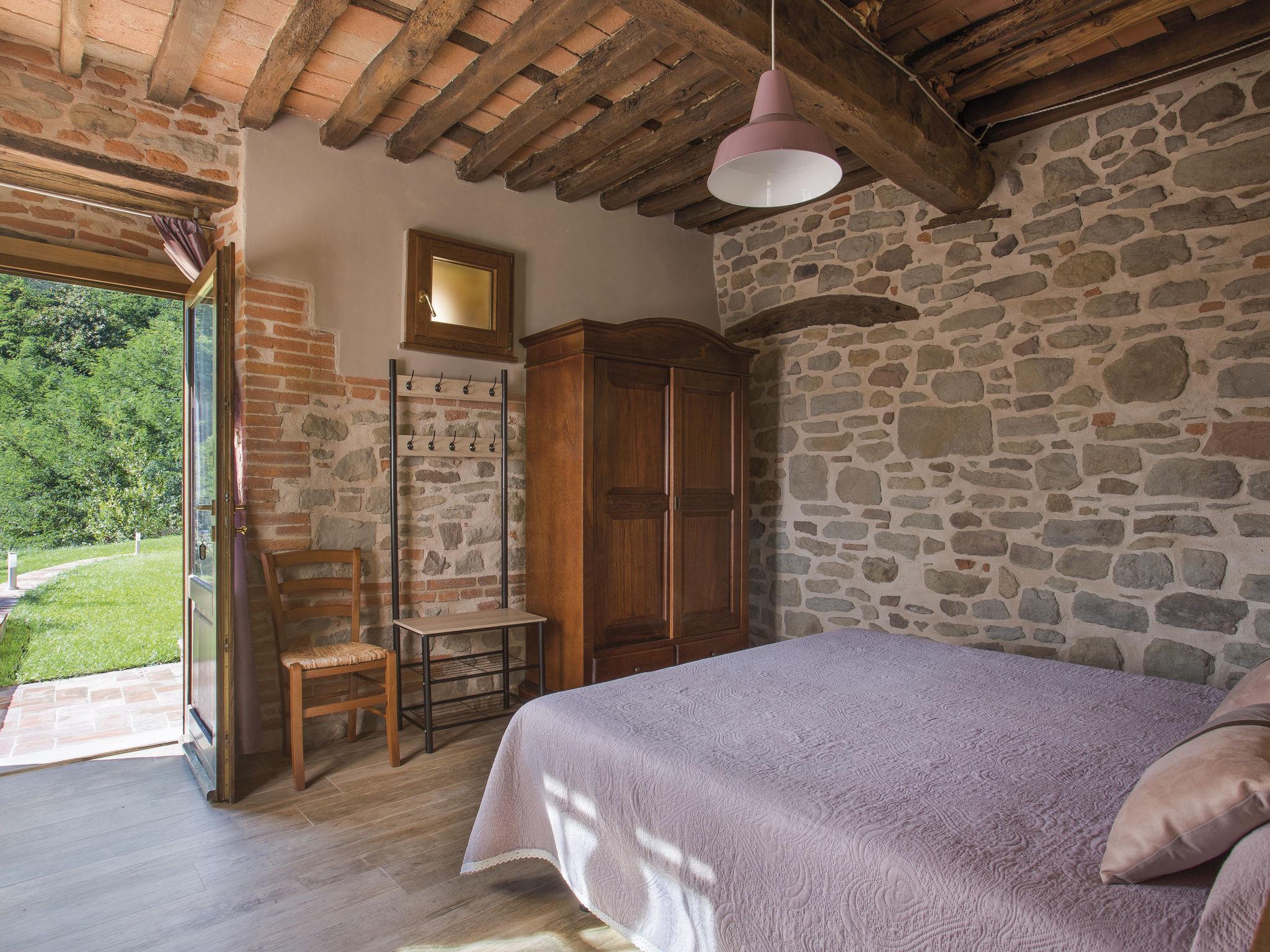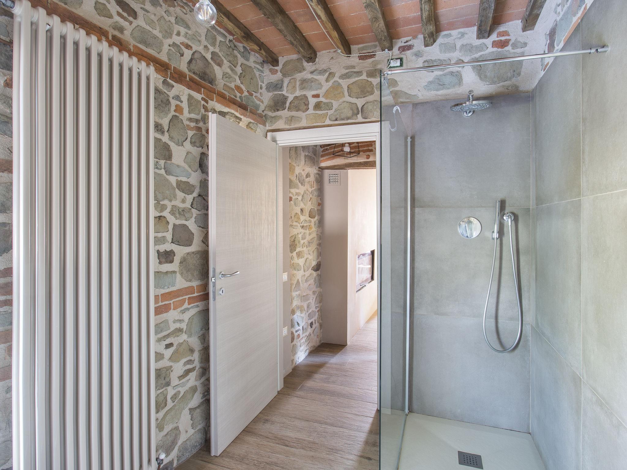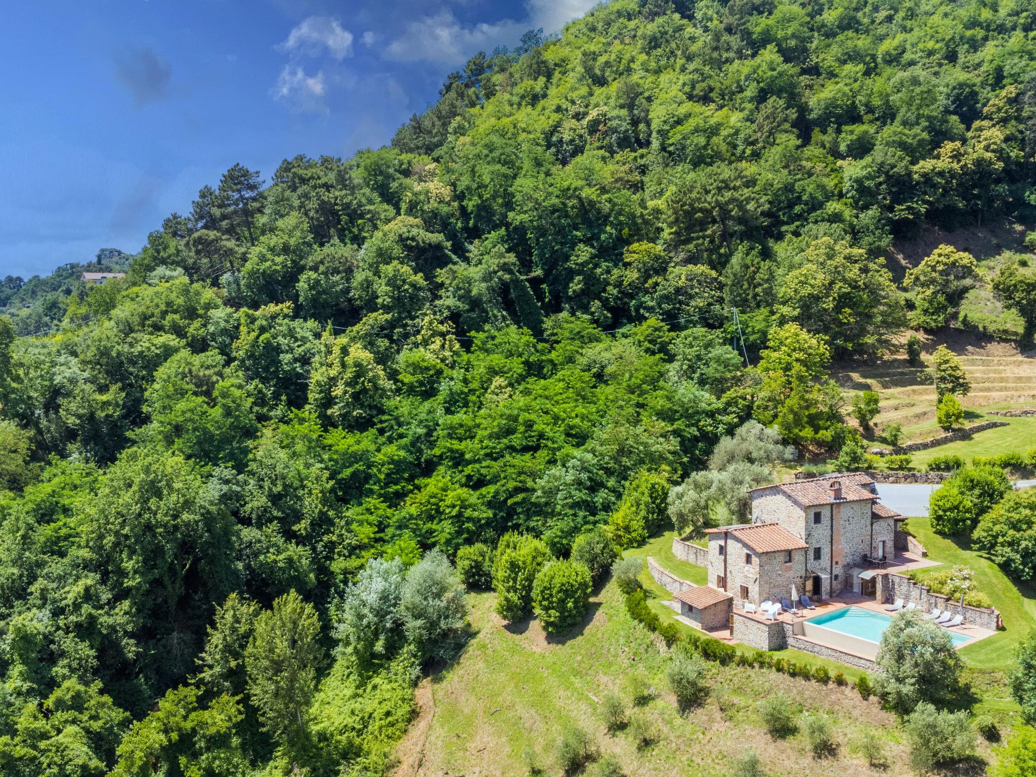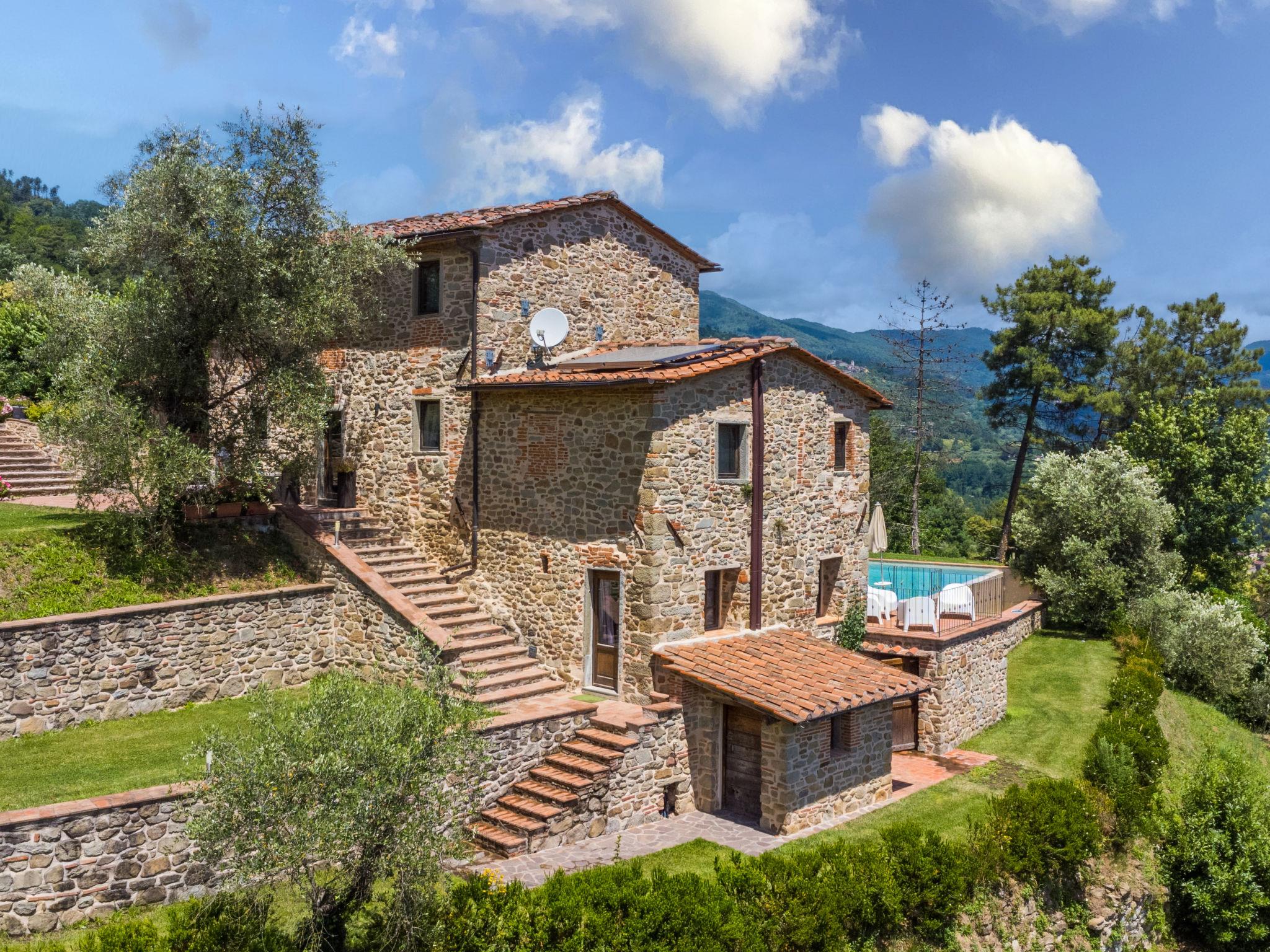 In the house wellness area with infrared sauna and heated L-shaped hydromassage with waterfall (11 m², salt electrolysis). Beautiful country house "Aurora", 200 m a.s.l., surrounded by trees. 3.2 km from the centre of Pescia, 21 km from the centre of Lucca, 49 km from the centre of Pisa, in a secluded, elevated position on a slope, 55 km from the sea, in the countryside. Private: property 500 m2, terraced garden (not fenced) with lawn and trees, swimming pool (10 x 7 m, depth 150 cm, seasonal availability: 05.Apr. - 25.Oct.) with salt-electrolysis pool-cleaning system. Patio, garden furniture, barbecue. In the house: hot tub (extra). Infrared sauna, central heating system, heating to be paid on the spot, heating available only from 01.Nov. - 30.Mar.. 1.1 km long narrow motor access to the house. Parking (for 5 cars) on the premises. E-charging station. Shop 3.2 km, supermarket 3.2 km, bus stop 2 km, sandy beach "Viareggio" 55 km, thermal baths "Montecatini Terme" 13 km. Golf course (18 hole) 25 km. Nearby attractions: Collodi 8.5 km, Villa Garzoni Butterfly 8.5 km, Montecarlo 10.5 km, Vinci 31 km, Pistoia 34 km, Firenze 70 km. Groups of teenagers on request only.