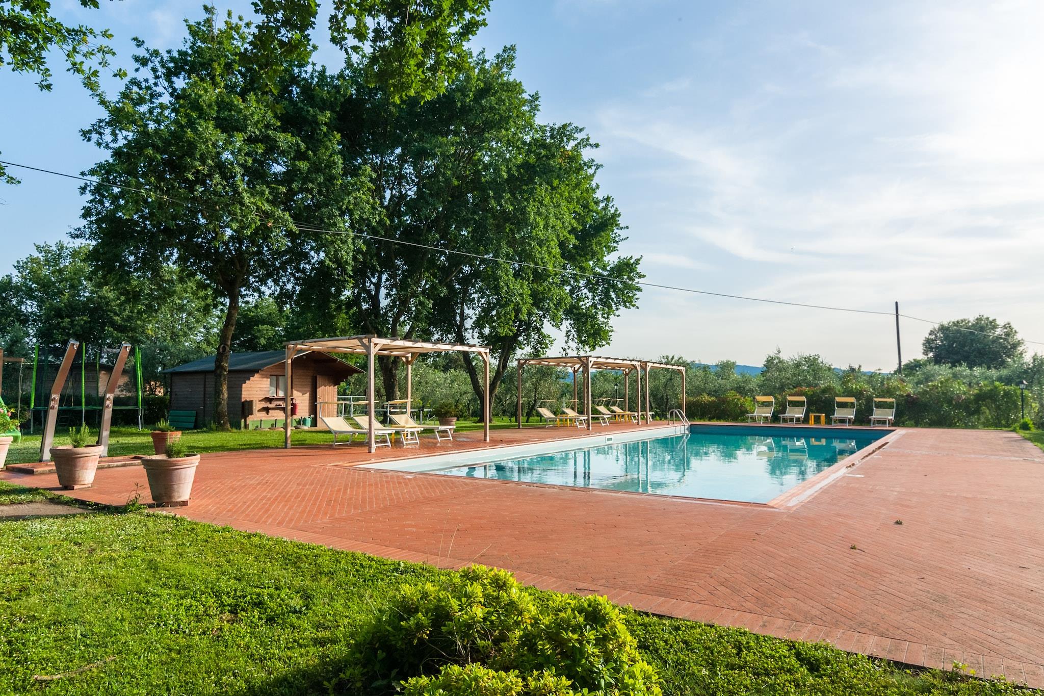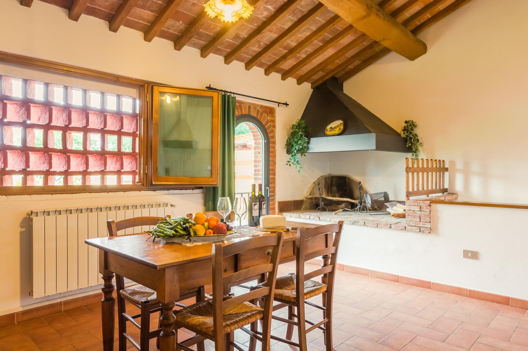 I det naturskønne toscanske landskab i Pian di Scò tilbyder dette charmerende palæ et fredeligt tilflugtssted med en fælles have, hvor gæsterne kan slappe af omgivet af frodige grønne områder. Ejendommen har en fælles swimmingpool, der er åben fra maj til september, perfekt til afkøling på varme toscanske dage, sammen med legeredskaber til børn og et bordtennisbord, hvilket gør det ideelt for familier eller grupper, der søger både afslapning og rekreation. Gæsterne kan nyde udendørs måltider med havemøbler og grill og omfavne den autentiske toscanske livsstil i rolige omgivelser. Palæet tilbyder også varme, parkering og WiFi for ekstra komfort og bekvemmelighed. Besøgende kan udforske hyggelige butikker og en række lokale restauranter, der serverer traditionel toscansk mad, herunder nærliggende trattoriaer, hvor du kan nyde frisk pasta, vildt og fine regionale vine. Det omkringliggende område er rigt på kulturarv med bemærkelsesværdige nærliggende attraktioner såsom Torre Arnolfo di Cambio i Castelfranco di Sopra - et historisk tårn, der står som en rest af et gammelt slot. Kunstelskere vil sætte pris på Masaccio Reggello-museet, der huser fantastiske malerier fra det 15. til det 19. århundrede, mens naturentusiaster kan opdage de slående gule okkerklipper i naturreservatet Le Balze eller vandre gennem den vidtstrakte Reggelloskov. Længere væk er de pulserende byer Arezzo, Firenze og Siena let tilgængelige og perfekte til dagsture fyldt med kunst, historie og udsøgte spiseoplevelser. Uanset om du ønsker at udforske renæssancemesterværker, nyde toscanske vine eller blot slappe af ved poolen i rolige landlige omgivelser, er dette palæ den perfekte base for at opleve det bedste af Toscanas kultur, natur og køkken.