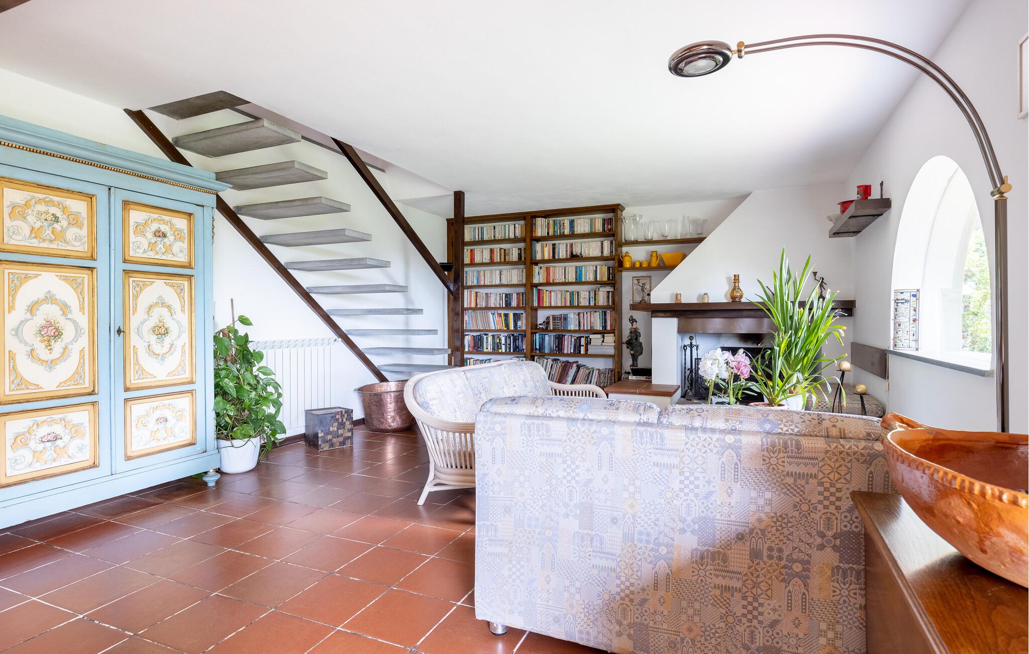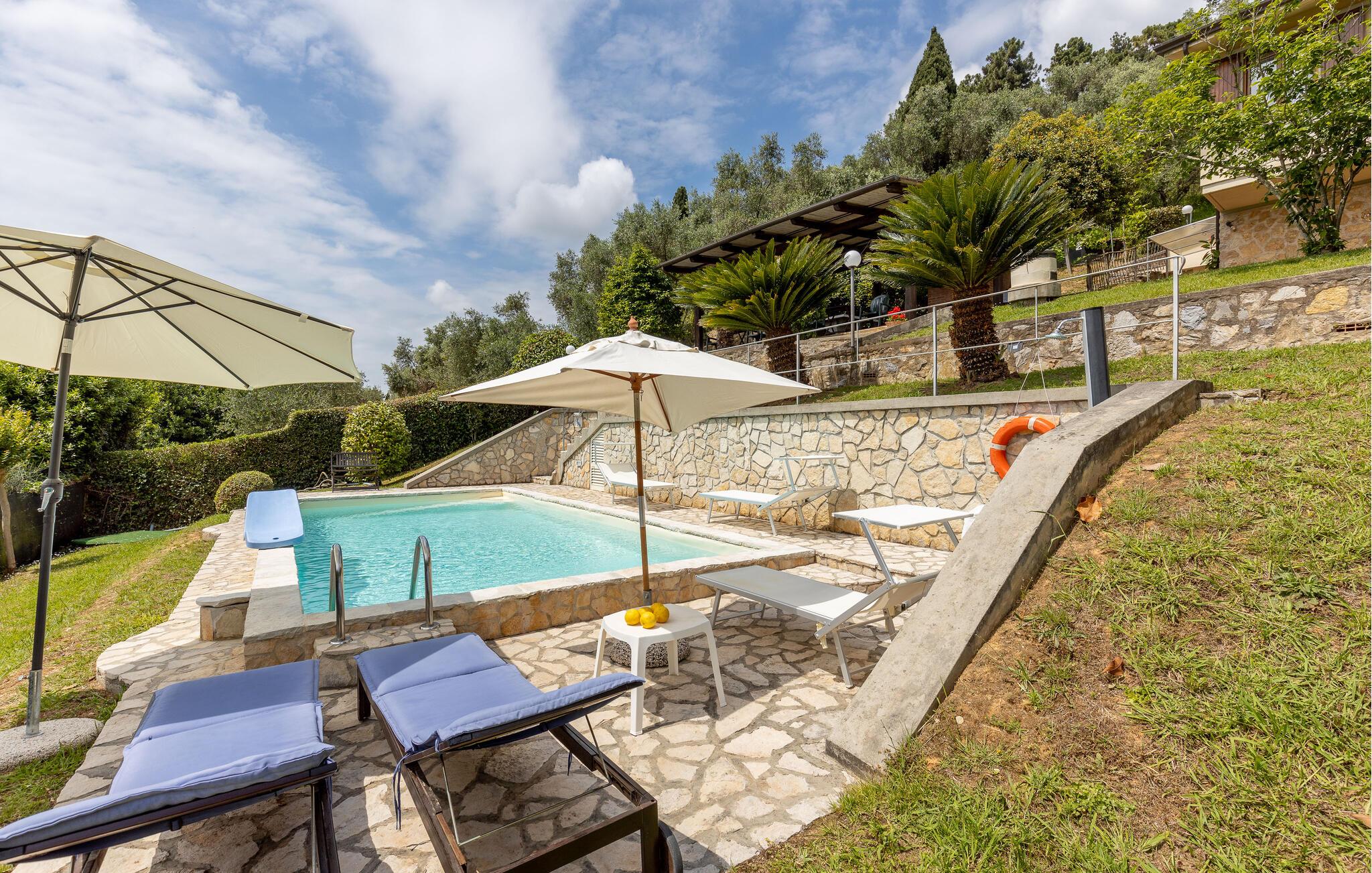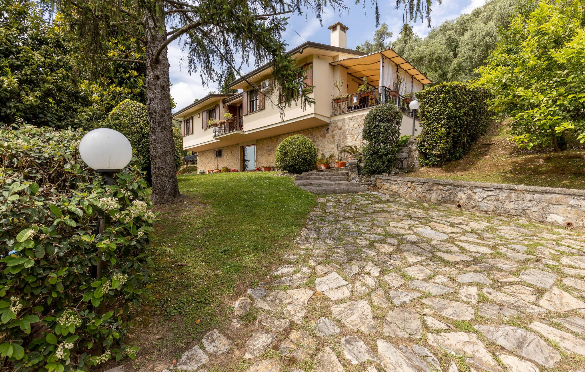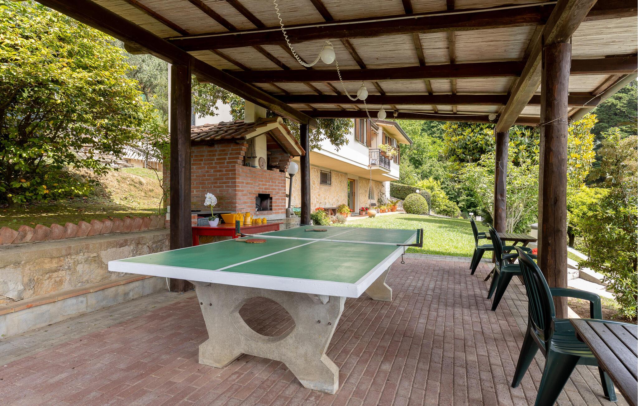 Fritliggende hus med pool, der ligger i Versilias skønne bakker i Piano di Mommio. Det ligger på en terrasseformet anlagt grund i en smuk have. Her kan I lege sammen i det fri, lave mad udendørs, hoppe en tur i husets private pool lige når I har lyst, slappe af på den store veranda og holde formen på den overdækkede terrasse med fitnessapparater. Der er kun syv km til Lido di Camaiore med mulighed for at bade og sin markante pier, der strækker sig hele 285 m ud i havet. Pietrasanta (7 km) er byen der er kendt for sin forarbejdelse af marmor og bronze og for sit historiske centrum med kunstgallerier, Viareggio ( 9 km) med sine færgeforbindelser til det betagende smukke Cinque Terre. Der er adgang til villaen direkte fra parkeringspladsen ad en trappe med 20 trin.