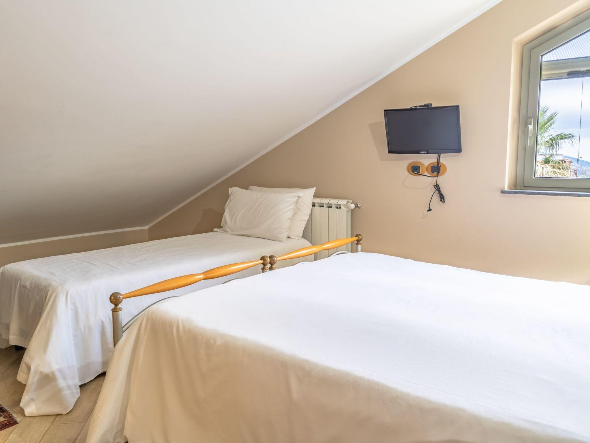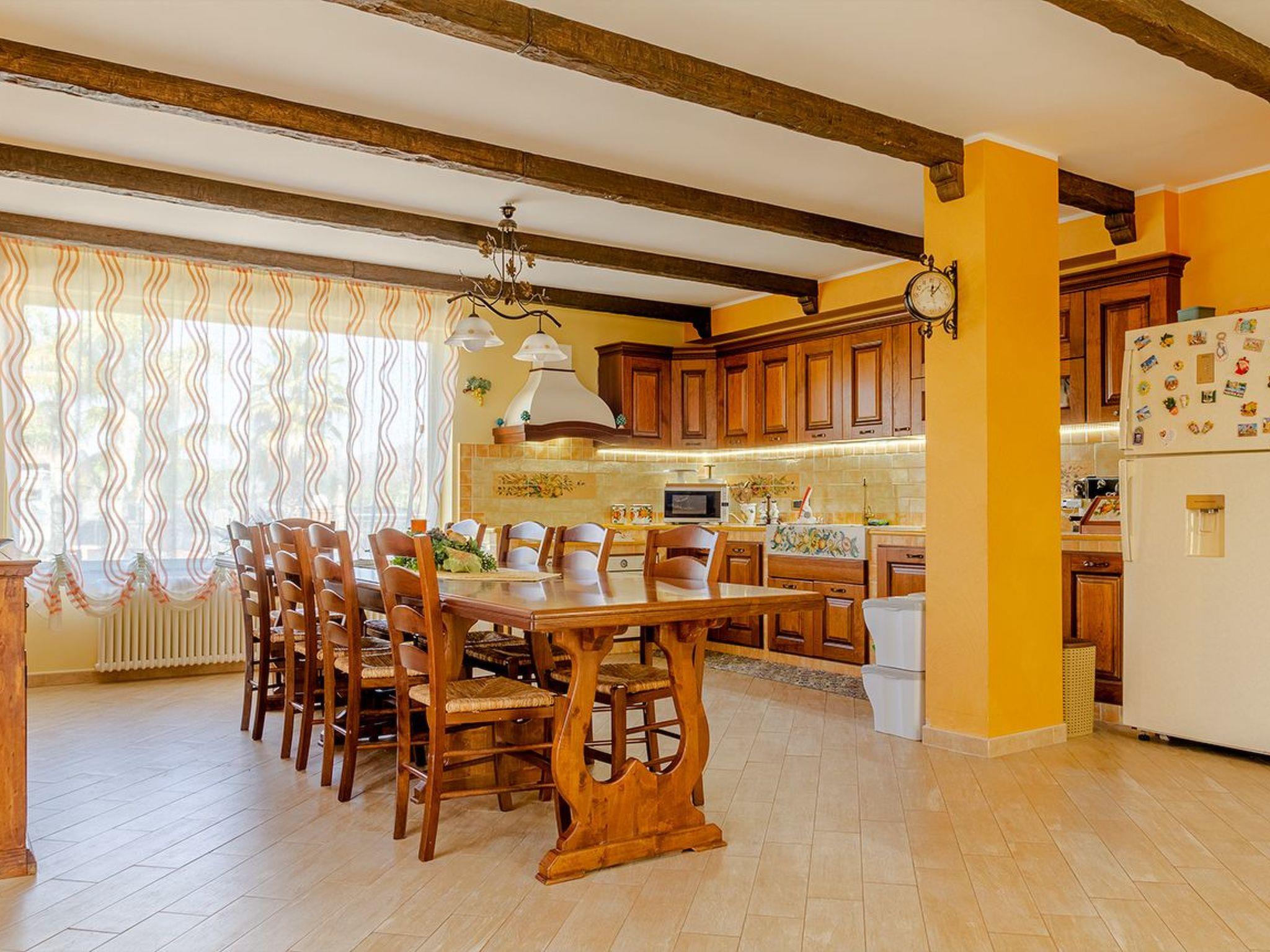 The property, equipped with every comfort and accessory, is spread over three levels: the ground floor houses a large living room with billiard table, a bathroom and a large kitchen with dining area. The first floor, which is attic, houses two communicating bedrooms with access to a large panoramic terrace; this floor also has a complete bathroom. On the basement floor there are two more bedrooms, one with a double bed, a small bedroom with a double bed, a large en-suite bedroom with a double bed and a single bed and a bedroom with two single beds.