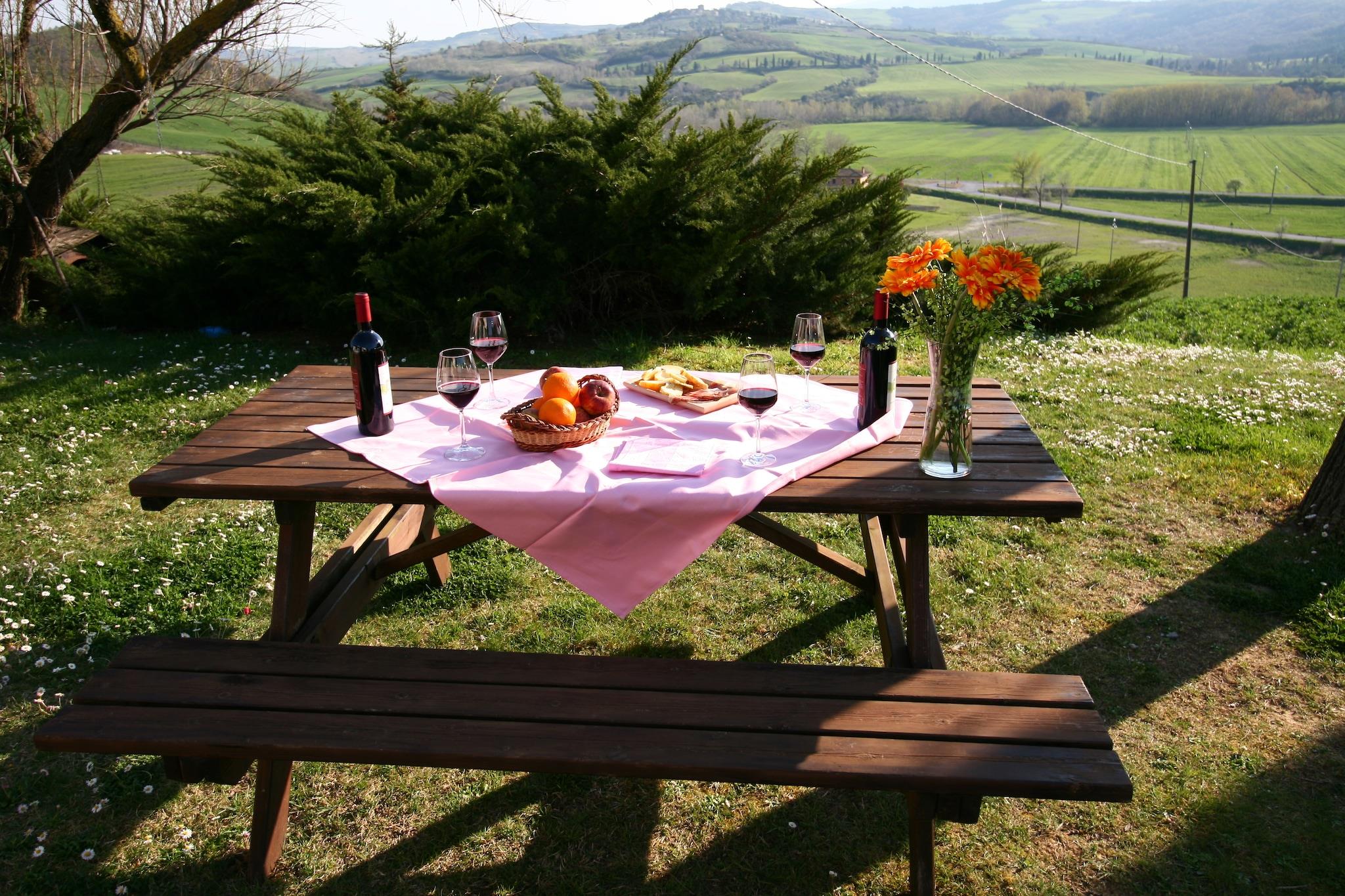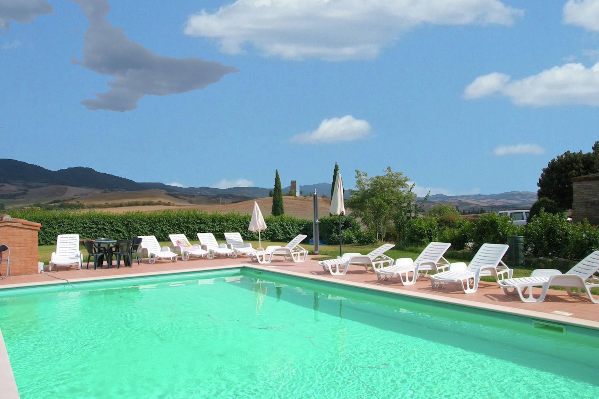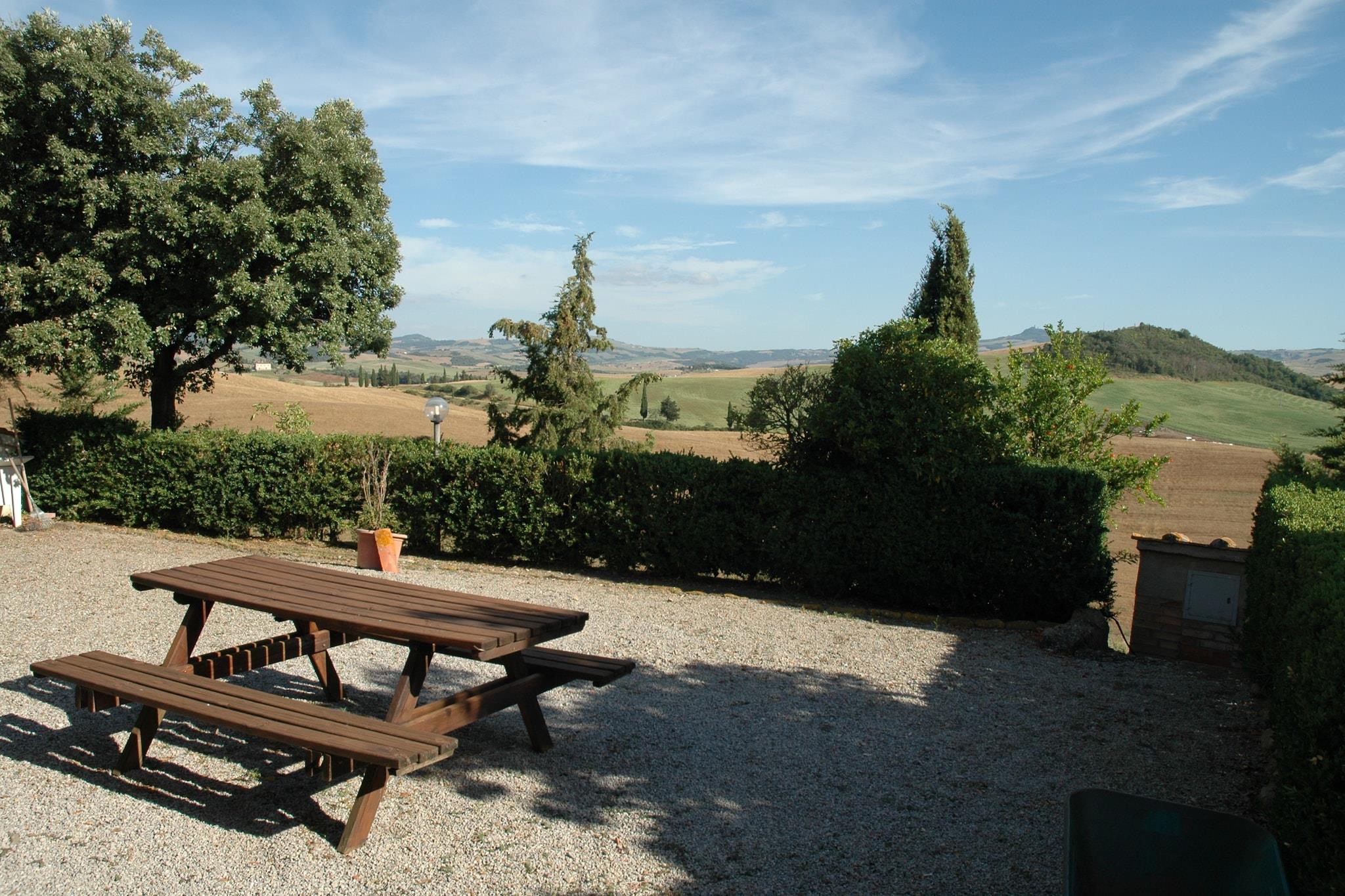 Beliggende i Pienzas fredfyldte bakker tilbyder denne kæledyrsvenlige lejlighed et fredeligt tilflugtssted for op til 6 gæster. Det ligger på første sal og har et rummeligt køkken med pejs og tv, to hyggelige soveværelser, det ene med dobbeltseng og enkelt sovesofa, det andet med dobbeltseng og enkeltseng samt to moderne badeværelser med bruser og bidet. WiFi og centralvarme sikrer et behageligt ophold året rundt. Træd udenfor for at nyde en privat terrasse og en fælles have med udendørsmøbler, ideel til at slappe af i den toscanske sol. En 12 × 6 m swimmingpool, åben fra juni til september, inviterer til forfriskende dukkert i de varmere måneder. Privat parkering tilføjer til bekvemmeligheden, hvilket gør det nemt at udforske regionen. Lejligheden ligger kun 10 km fra renæssancebyen Pienza, kendt for sin fantastiske arkitektur og pecorino-ost. Nærliggende attraktioner omfatter Val d'Orcia-bakkerne, Montepulciano (berømt for vin) og de fortryllende Bagno Vignoni termiske bade. For at spise kan du besøge La Porta eller Trattoria Latte di Luna i nærliggende byer for at nyde autentisk toscansk køkken. Med skovstier, en sø og kulturelle vartegn inden for rækkevidde, er dette ophold perfekt til familier eller venner, der søger natur, historie og komfort i én smukke omgivelser.
