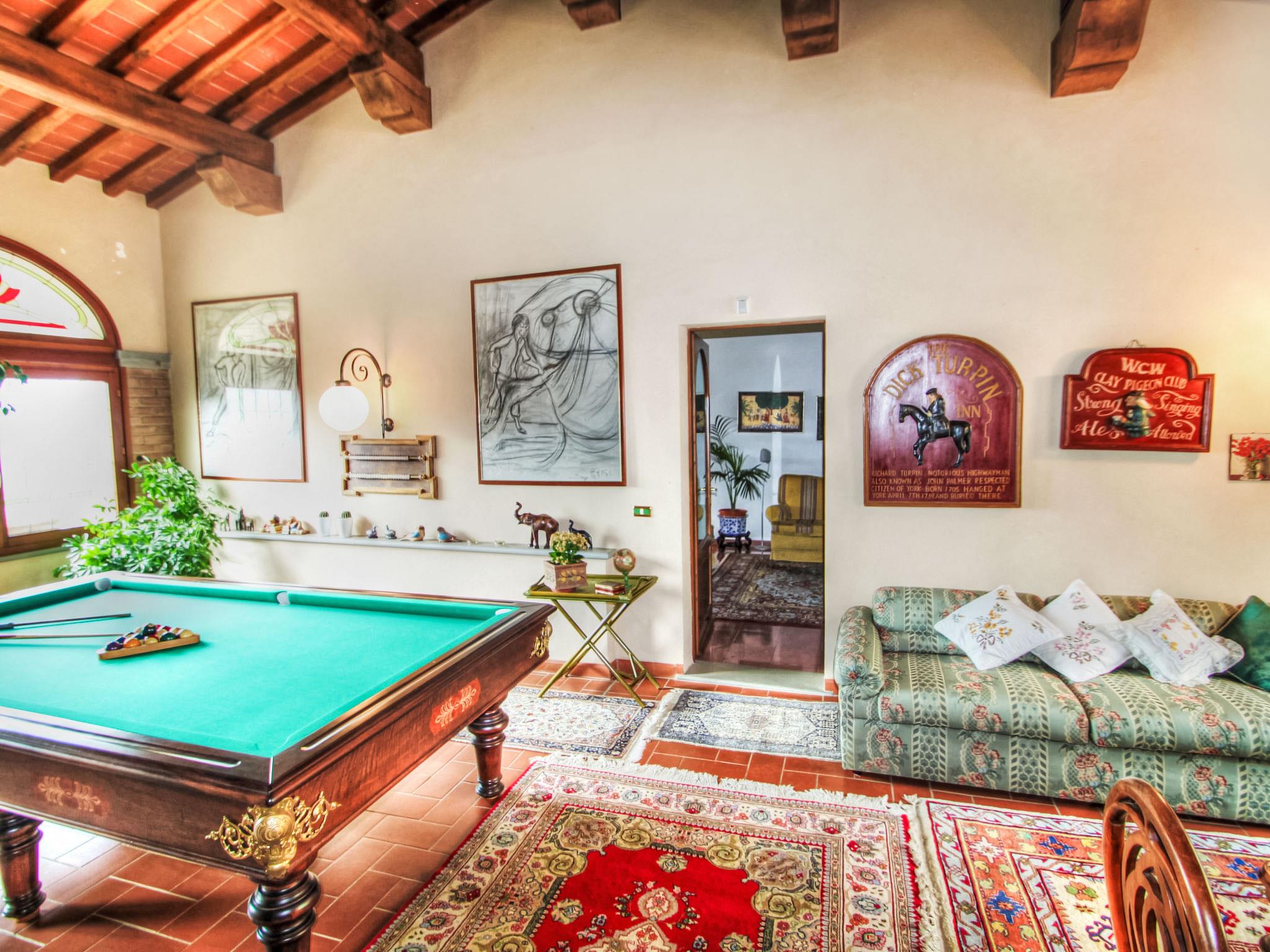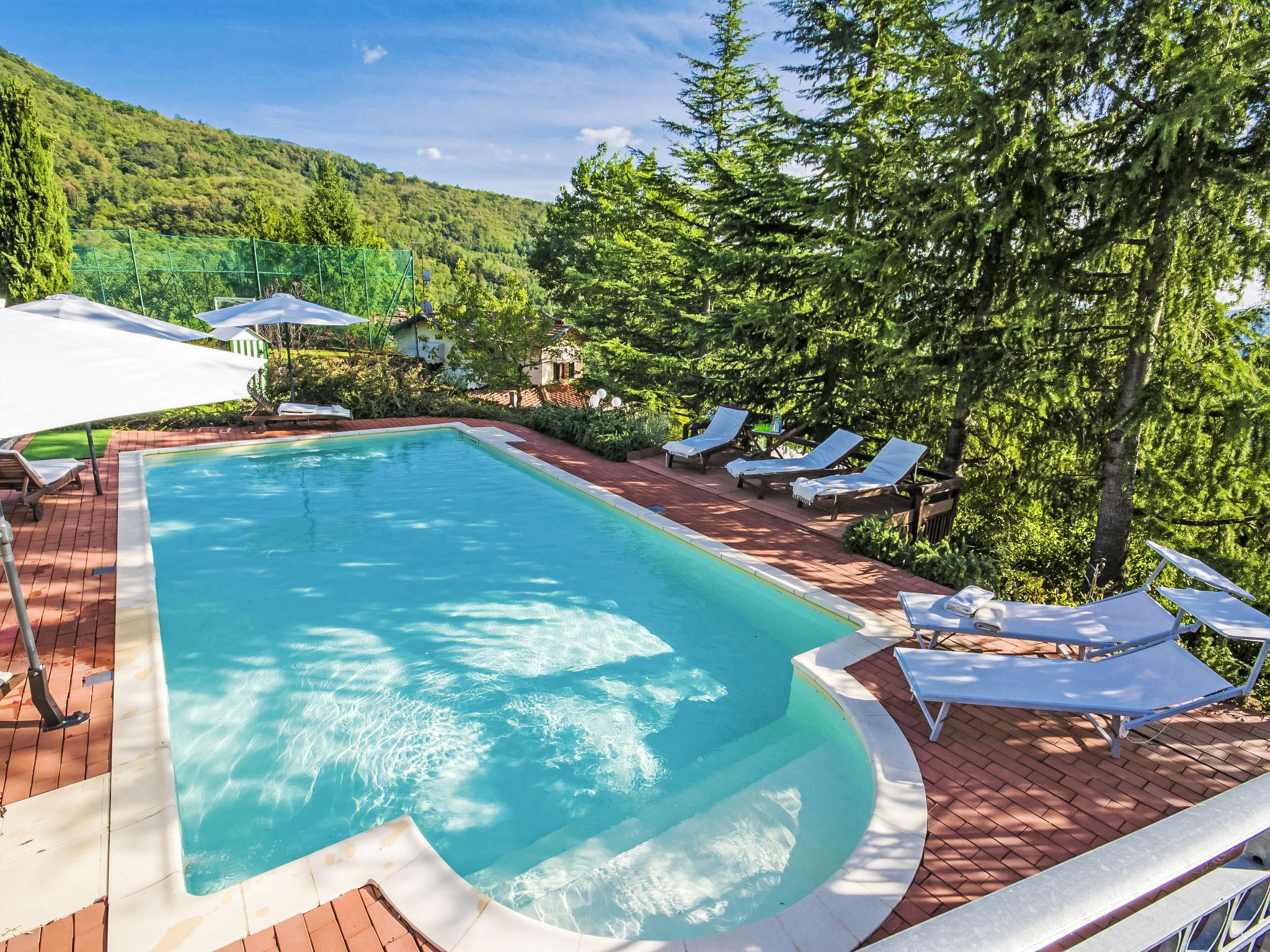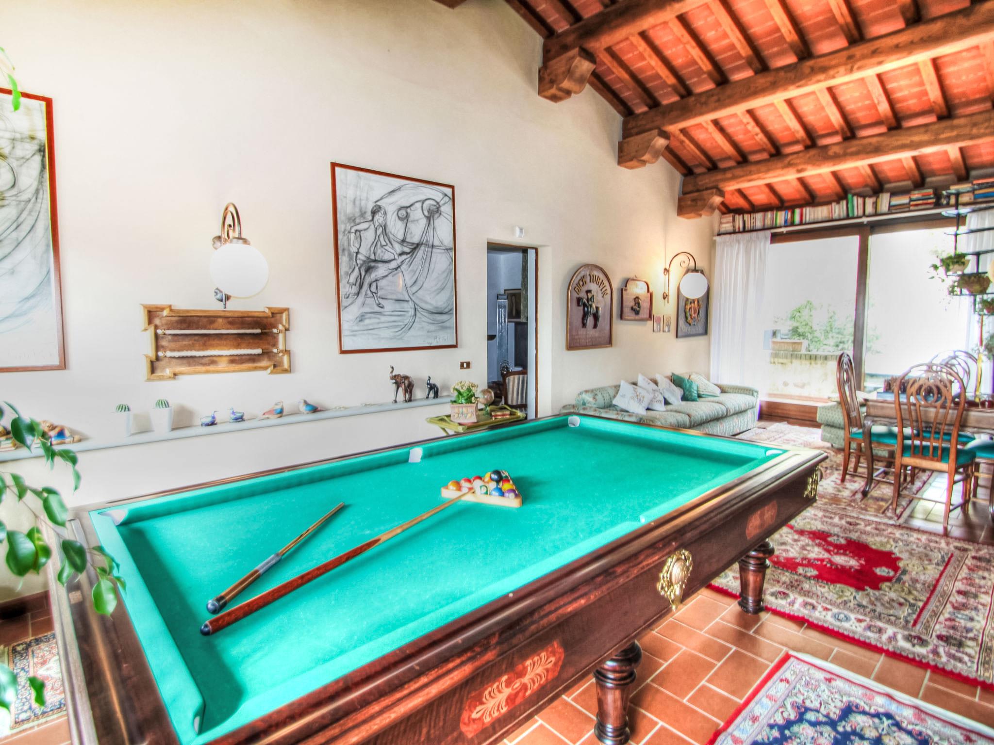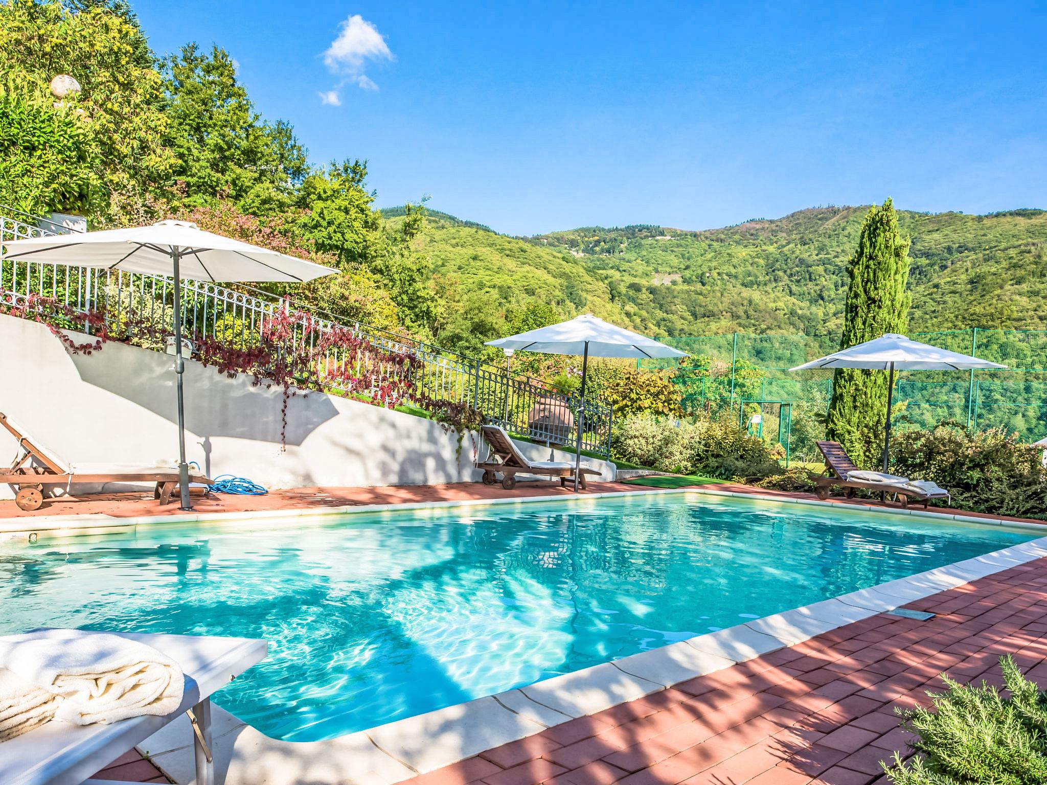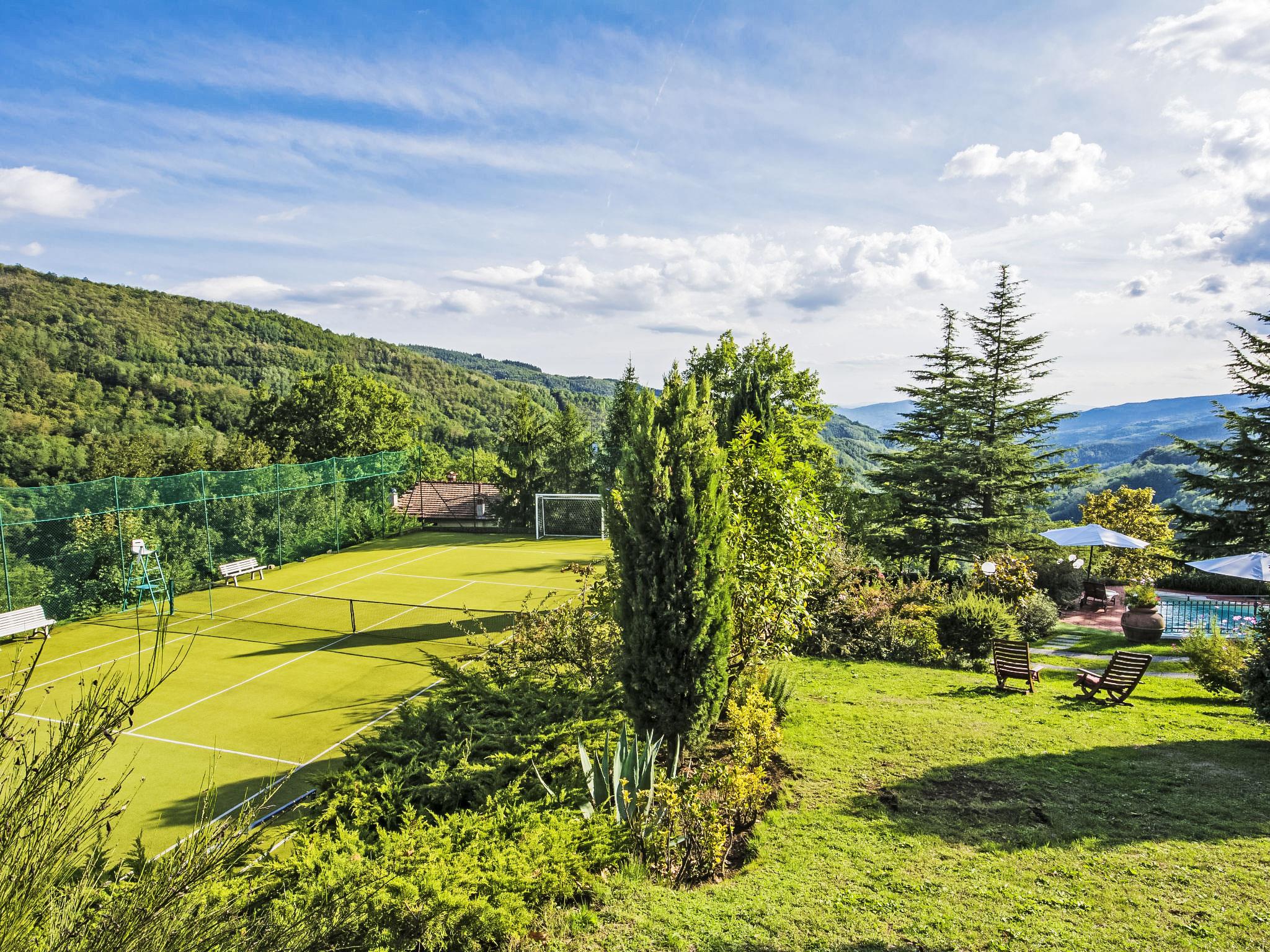 Villa Campo del Mulino is situated on the hills of Pistoia at 400 m above sea level. Ideal for a restful and regenerating holiday in the cool of the green hills. It is a good starting point for daily excursions to the sea and the beaches of Versilia (65 km) as well as the cities of art and historical towns of Tuscany: Lucca 50 km, Pisa 75 km and Siena 110 km villa "Villa Campo del Mulino", detached. 10 km from the centre of Pistoia, 45 km from the centre of Firenze, 70 km from the centre of Forte dei Marmi, in a secluded, sunny, elevated position on top of a hill, 70 km from the sea, in the countryside. Private: property 15'000 m2 (fenced), swimming pool (12 x 6 m, depth 120 cm, seasonal availability: 12.Apr. - 27.Sep.). Tennis (1 x hard court), garden furniture, barbecue. In the house: billiard table, heating to be paid on the spot, heating available only from 01.Nov. - 07.Apr.. Room cleaning weekly (included). Airport transfer (extra). Parking at the house. E-charging station. Grocery 3 km, bus stop 1.5 km, sandy beach "Viareggio - Forte dei Marmi" 70 km, thermal baths "Montecatini Terme" 25 km. Golf course (18 hole) 25 km. Guests have access to a tennis court (artificial grass), which can also be used as a football pitch. Fitness equipment. Sun terrace.