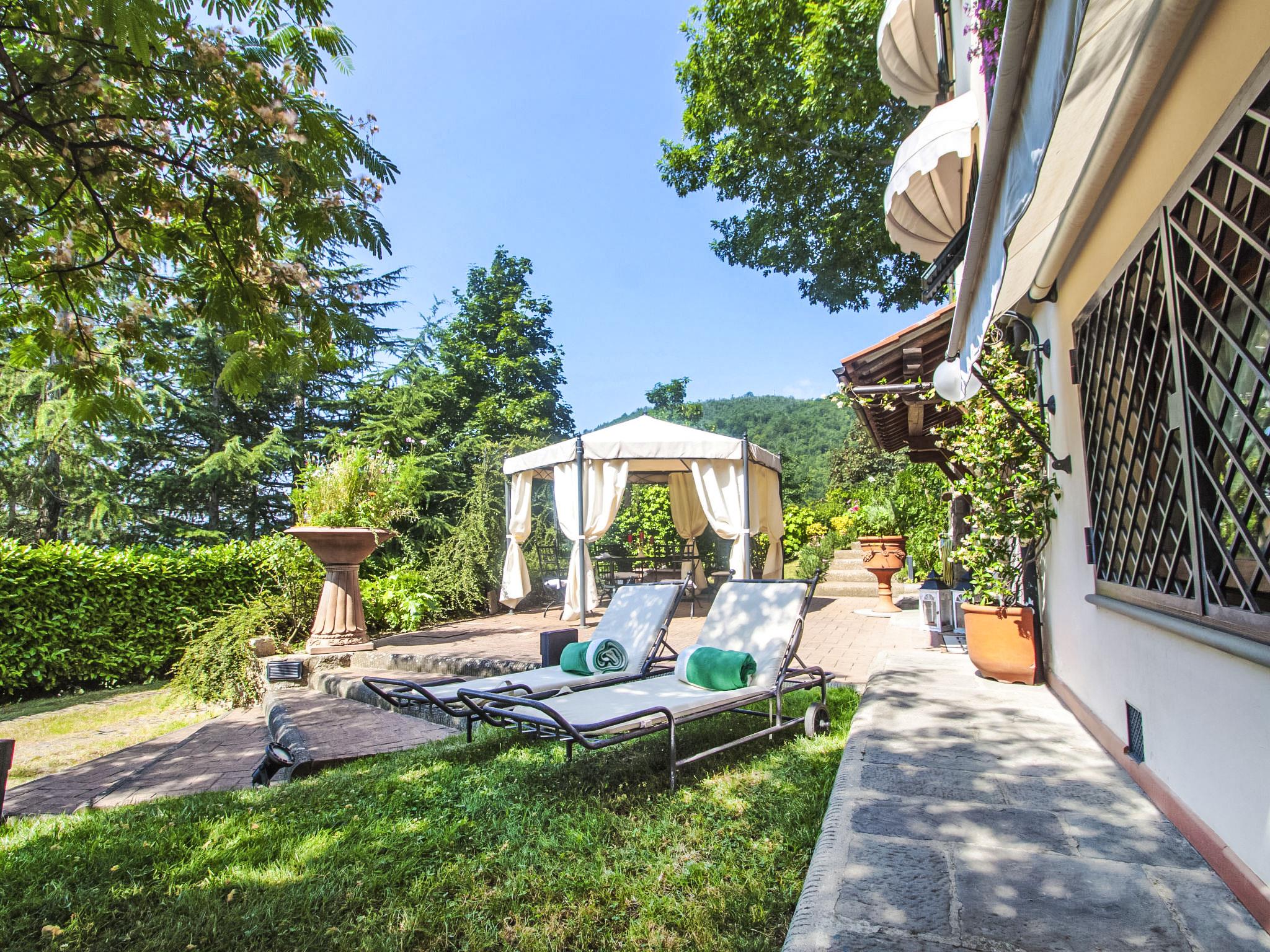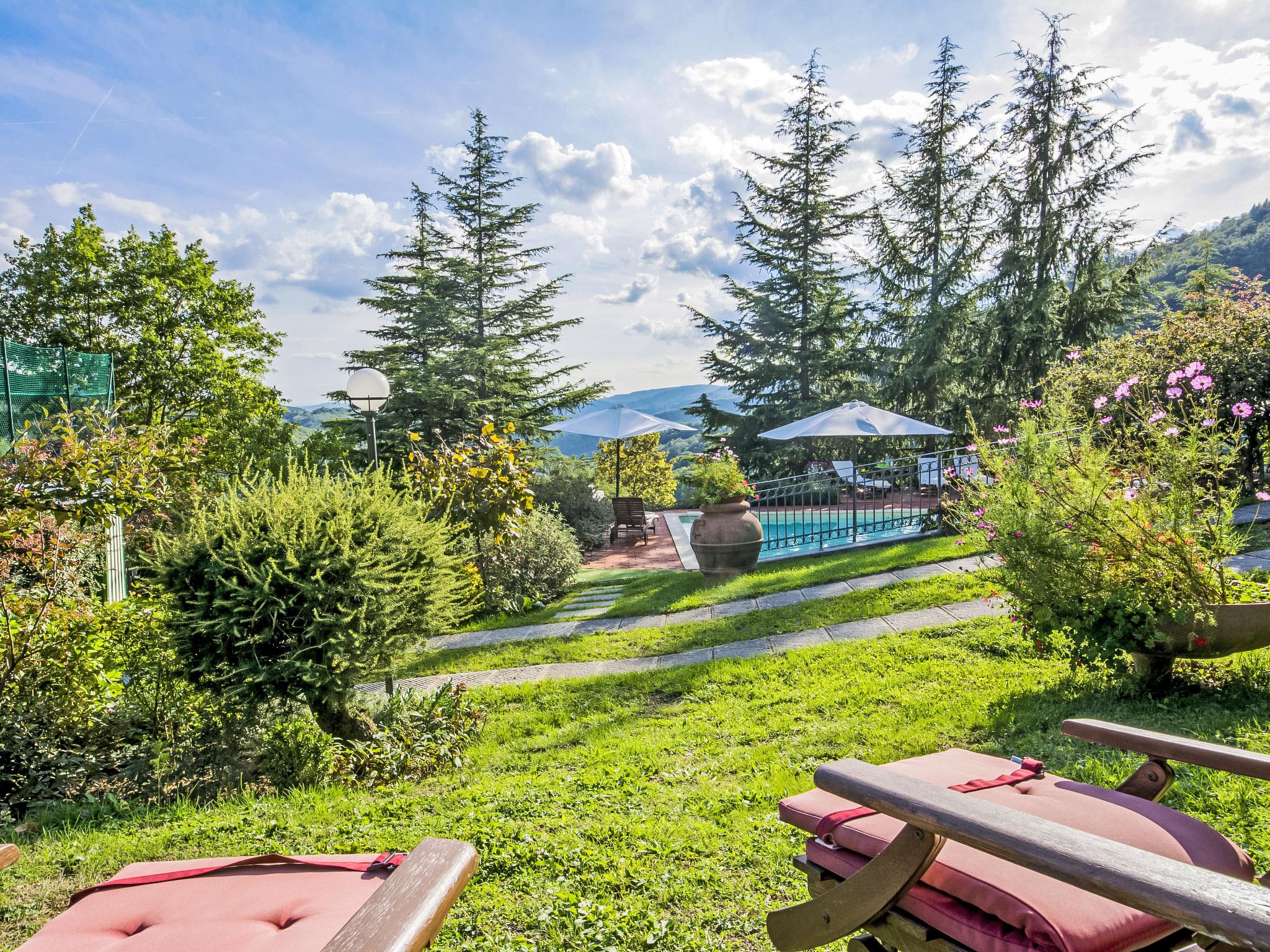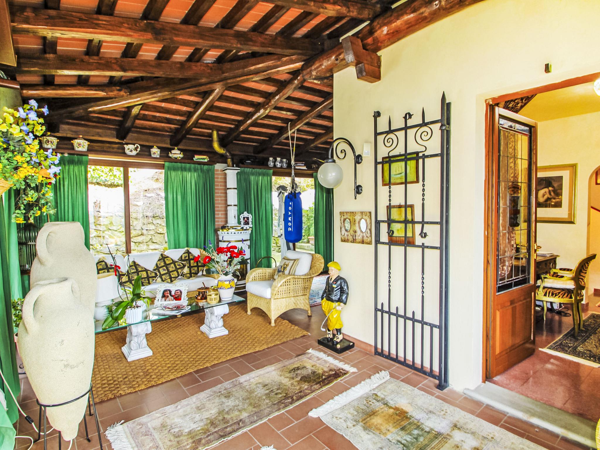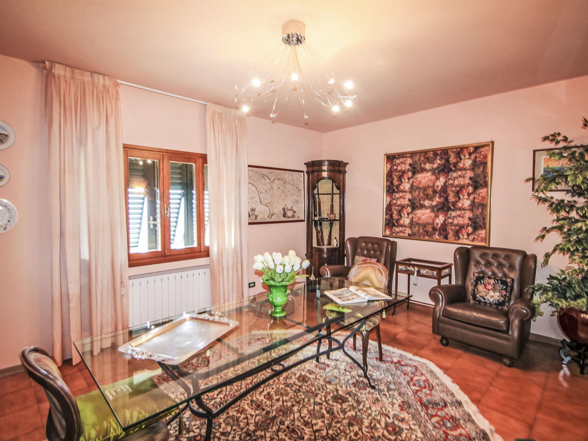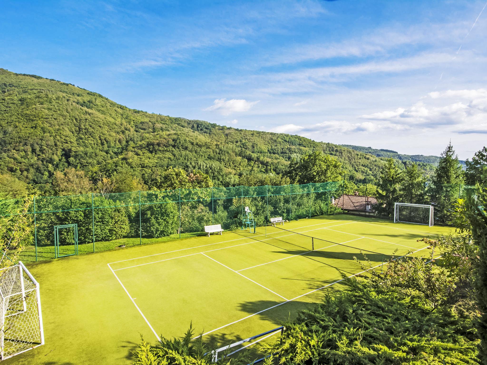 Villa Campo del Mulino is situated on the hills of Pistoia at 400 m above sea level. Ideal for a restful and regenerating holiday in the cool of the green hills. It is a good starting point for daily excursions to the sea and the beaches of Versilia (65 km) as well as the cities of art and historical towns of Tuscany: Lucca 50 km, Pisa 75 km and Siena 110 km villa "Villa Campo del Mulino", detached. 10 km from the centre of Pistoia, 45 km from the centre of Firenze, 70 km from the centre of Forte dei Marmi, in a secluded, sunny, elevated position on top of a hill, 70 km from the sea, in the countryside. Private: property 15'000 m2 (fenced), swimming pool (12 x 6 m, depth 120 cm, seasonal availability: 12.Apr. - 27.Sep.). Tennis (1 x hard court), garden furniture, barbecue. In the house: billiard table, heating to be paid on the spot, heating available only from 01.Nov. - 07.Apr.. Room cleaning weekly (included). Airport transfer (extra). Parking at the house. E-charging station. Grocery 3 km, bus stop 1.5 km, sandy beach "Viareggio - Forte dei Marmi" 70 km, thermal baths "Montecatini Terme" 25 km. Golf course (18 hole) 25 km. Guests have access to a tennis court (artificial grass), which can also be used as a football pitch. Fitness equipment. Sun terrace.