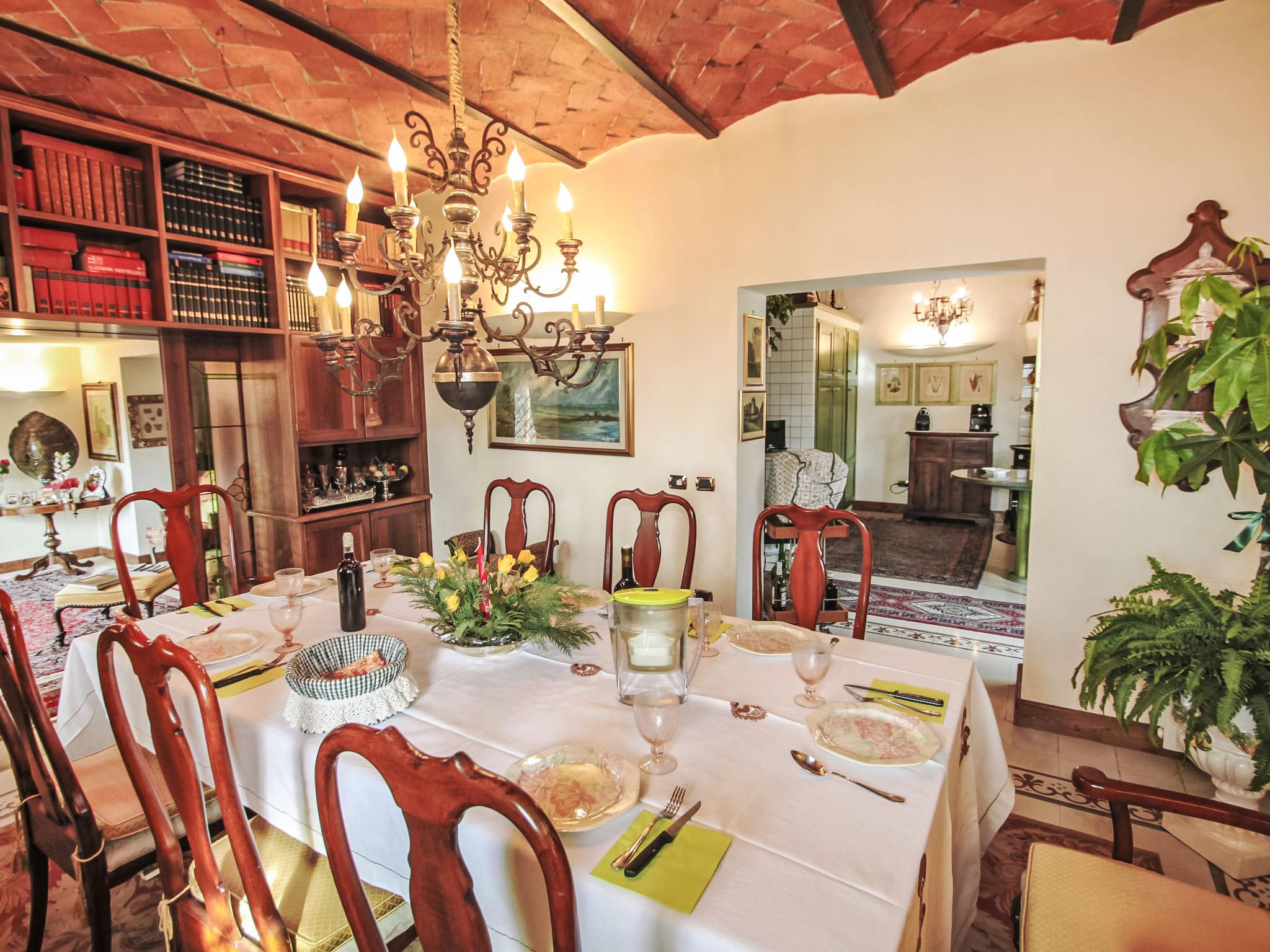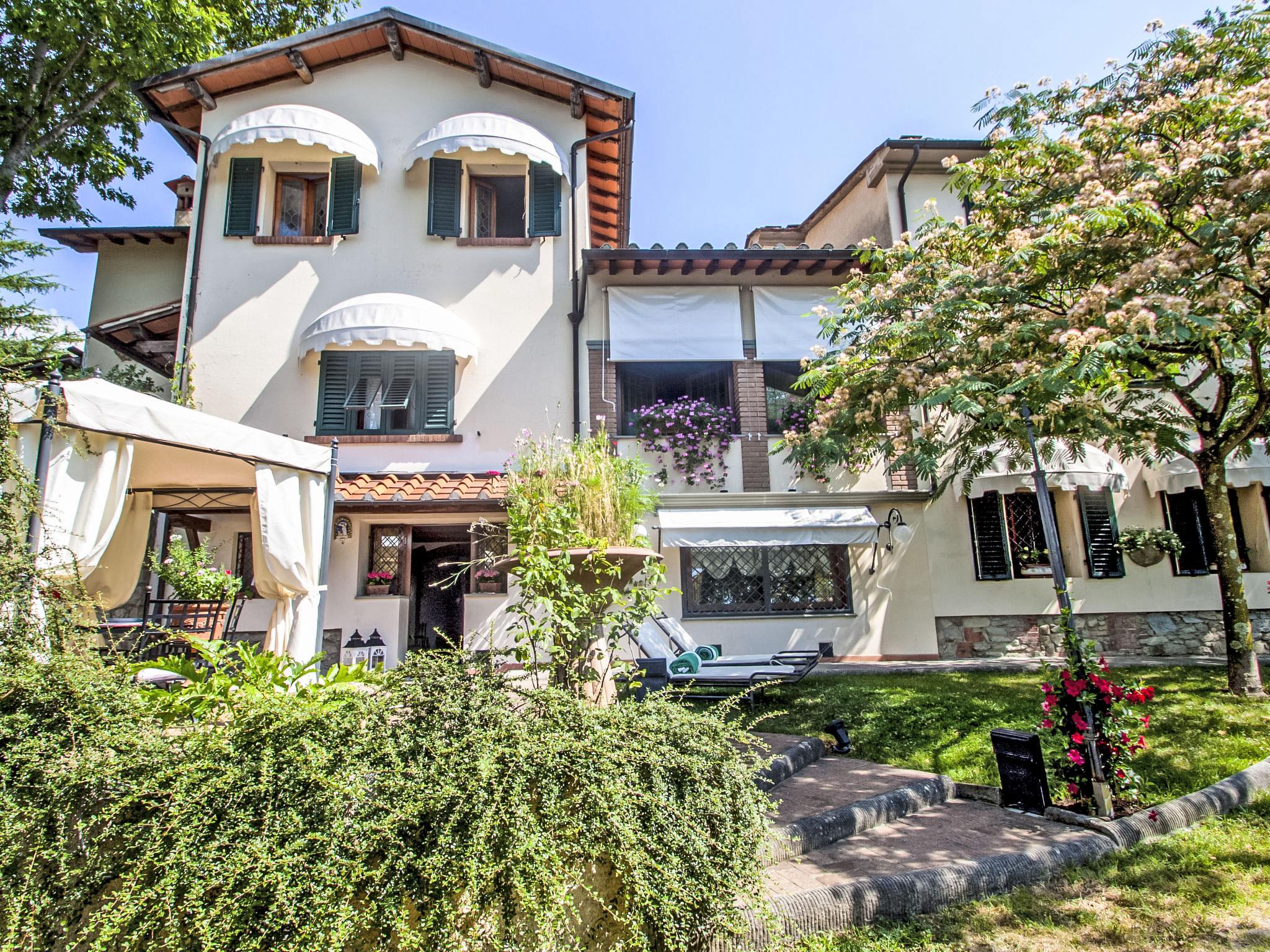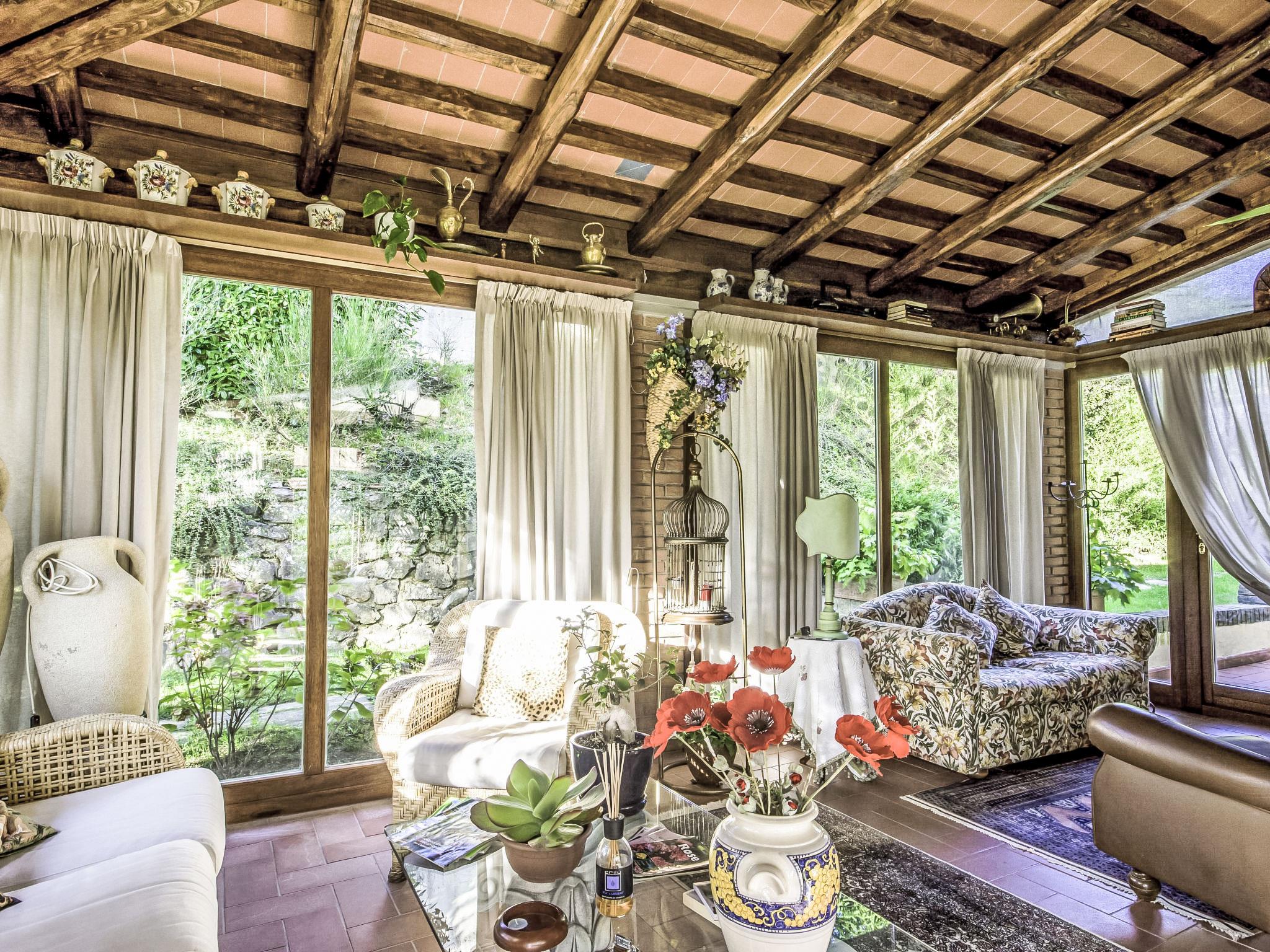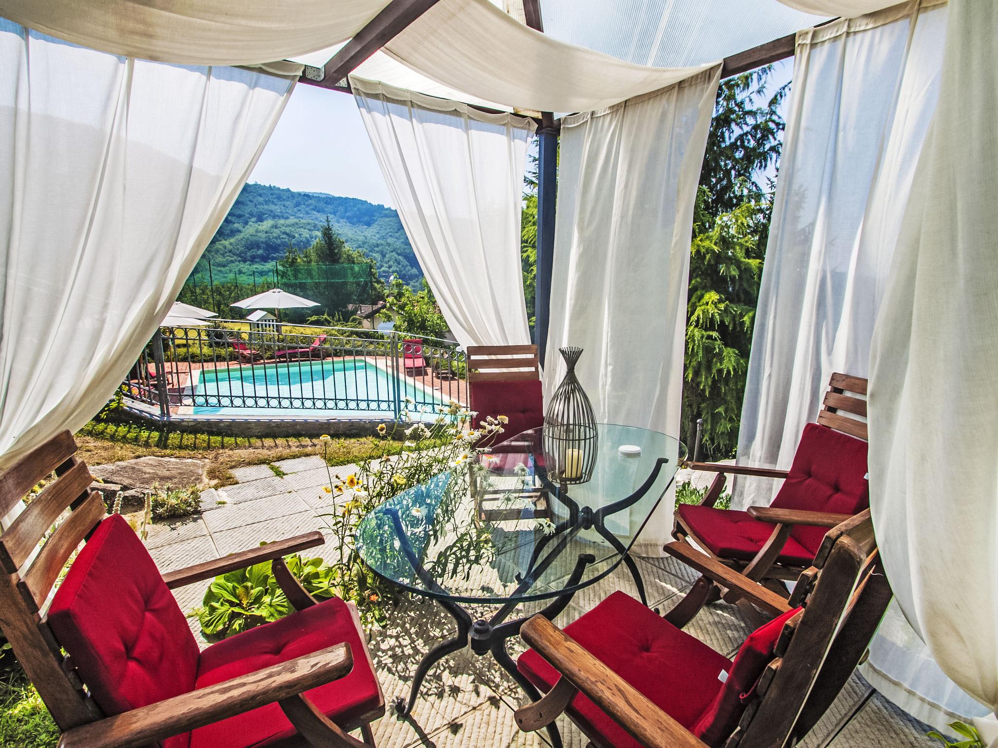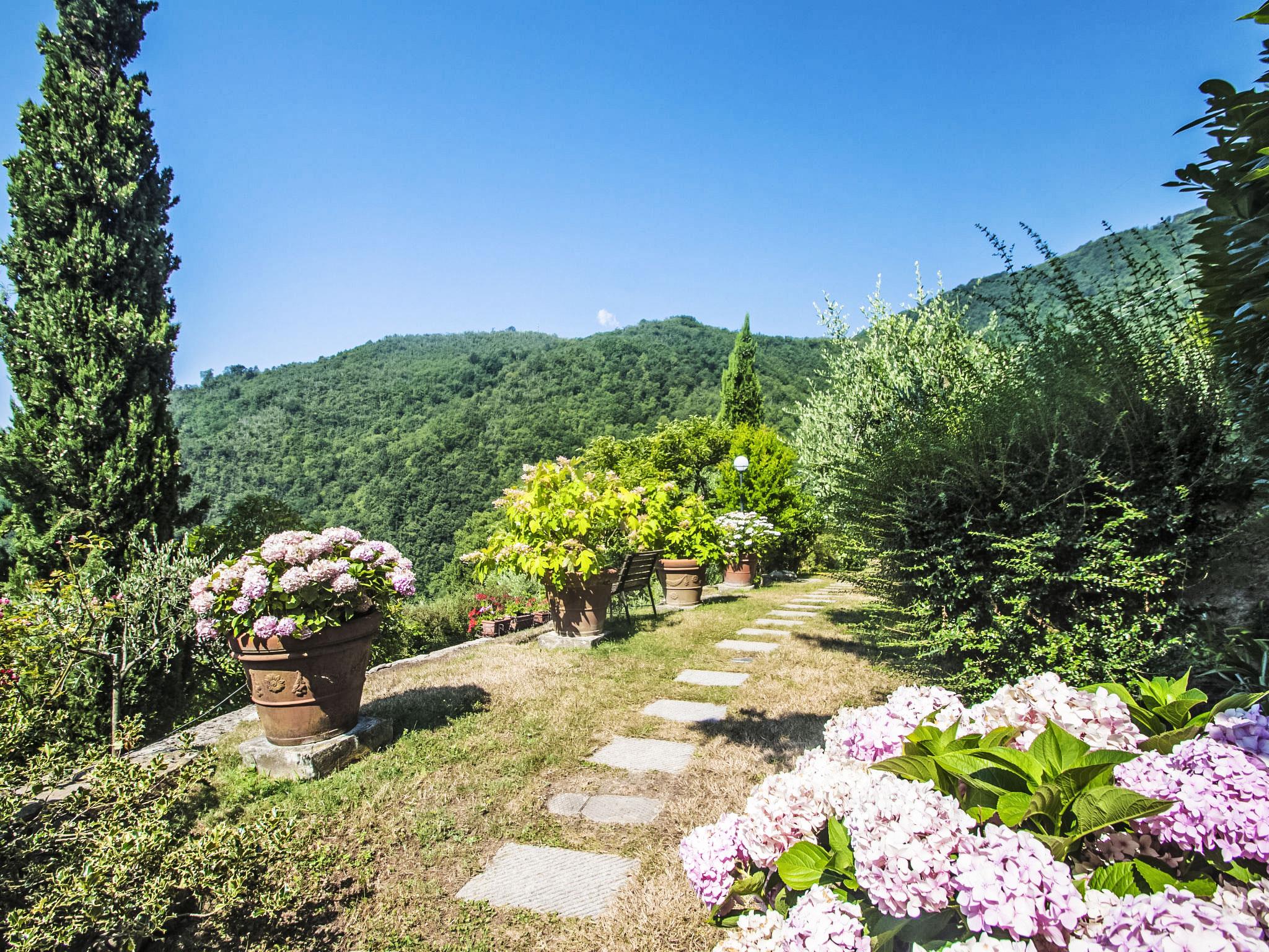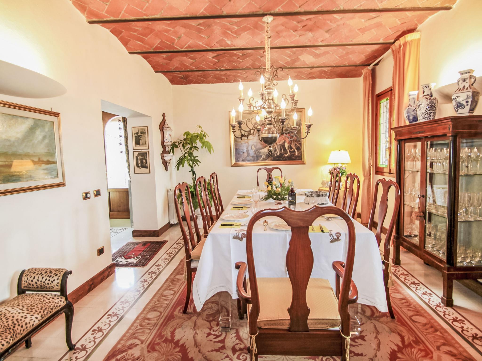 Villa Campo del Mulino is situated on the hills of Pistoia at 400 m above sea level. Ideal for a restful and regenerating holiday in the cool of the green hills. It is a good starting point for daily excursions to the sea and the beaches of Versilia (65 km) as well as the cities of art and historical towns of Tuscany: Lucca 50 km, Pisa 75 km and Siena 110 km villa "Villa Campo del Mulino", detached. 10 km from the centre of Pistoia, 45 km from the centre of Firenze, 70 km from the centre of Forte dei Marmi, in a secluded, sunny, elevated position on top of a hill, 70 km from the sea, in the countryside. Private: property 15'000 m2 (fenced), swimming pool (12 x 6 m, depth 120 cm, seasonal availability: 12.Apr. - 27.Sep.). Tennis (1 x hard court), garden furniture, barbecue. In the house: billiard table, heating to be paid on the spot, heating available only from 01.Nov. - 07.Apr.. Room cleaning weekly (included). Airport transfer (extra). Parking at the house. E-charging station. Grocery 3 km, bus stop 1.5 km, sandy beach "Viareggio - Forte dei Marmi" 70 km, thermal baths "Montecatini Terme" 25 km. Golf course (18 hole) 25 km. Guests have access to a tennis court (artificial grass), which can also be used as a football pitch. Fitness equipment. Sun terrace.
