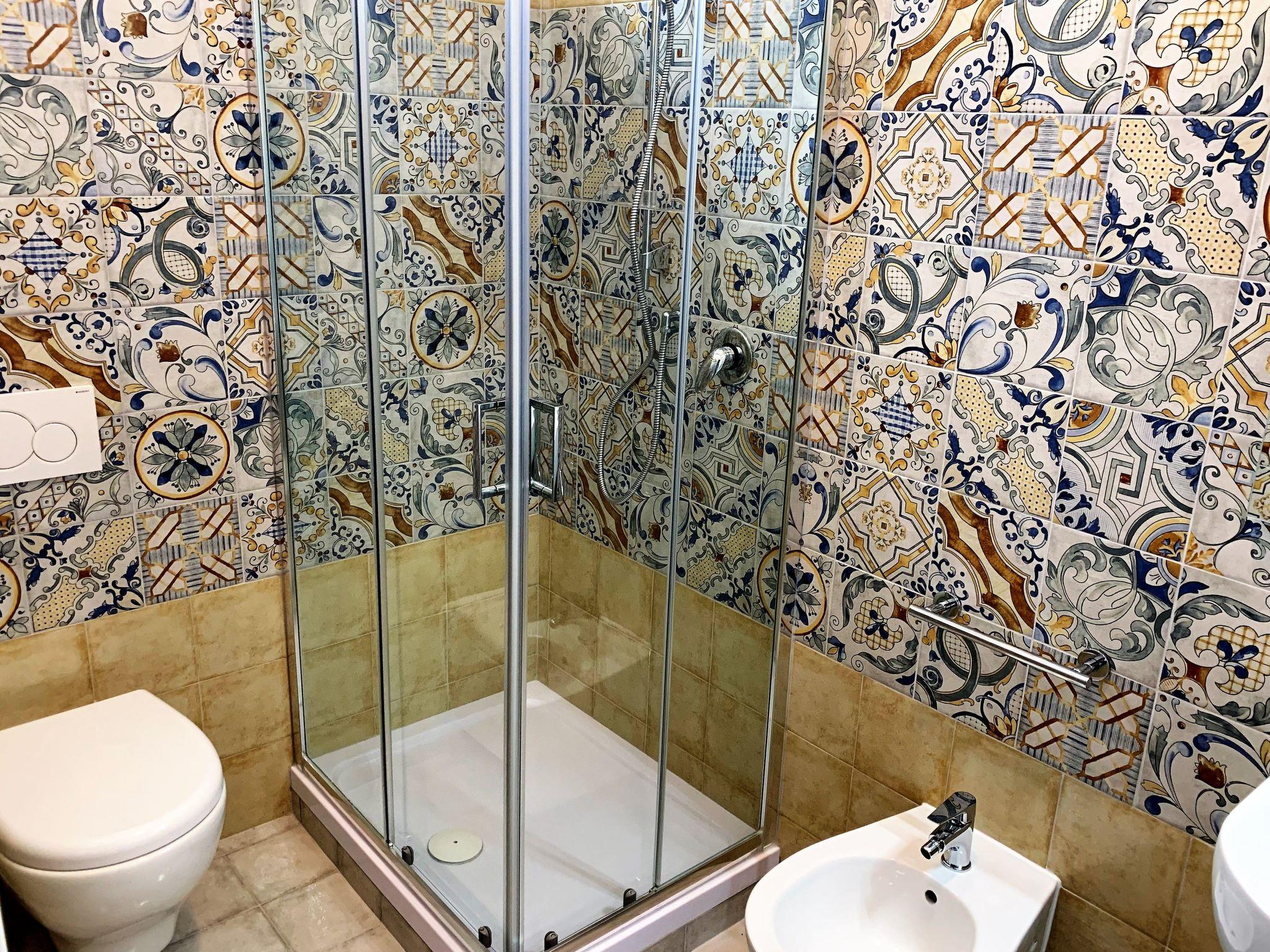 The flat is approximately 100 square metres and consists of the following rooms: a living/dining room (sea view) with flat screen TV, sofas and armchairs, dining table, fully equipped kitchen area with cooker, oven, microwave oven, coffee machine, dishwasher, fridge with freezer; one bedroom (sea view) with double bed and wardrobe; second bedroom with double bed or two single beds and wardrobe; third bedroom with two beds and wardrobe. Each bedroom has its own private bathroom with shower and bidet. A washing machine is housed in a small utility room. The large terrace accessible from the living room and the kitchen directly overlooks the sea and is equipped with awnings, table and chairs, sun loungers and sofas.