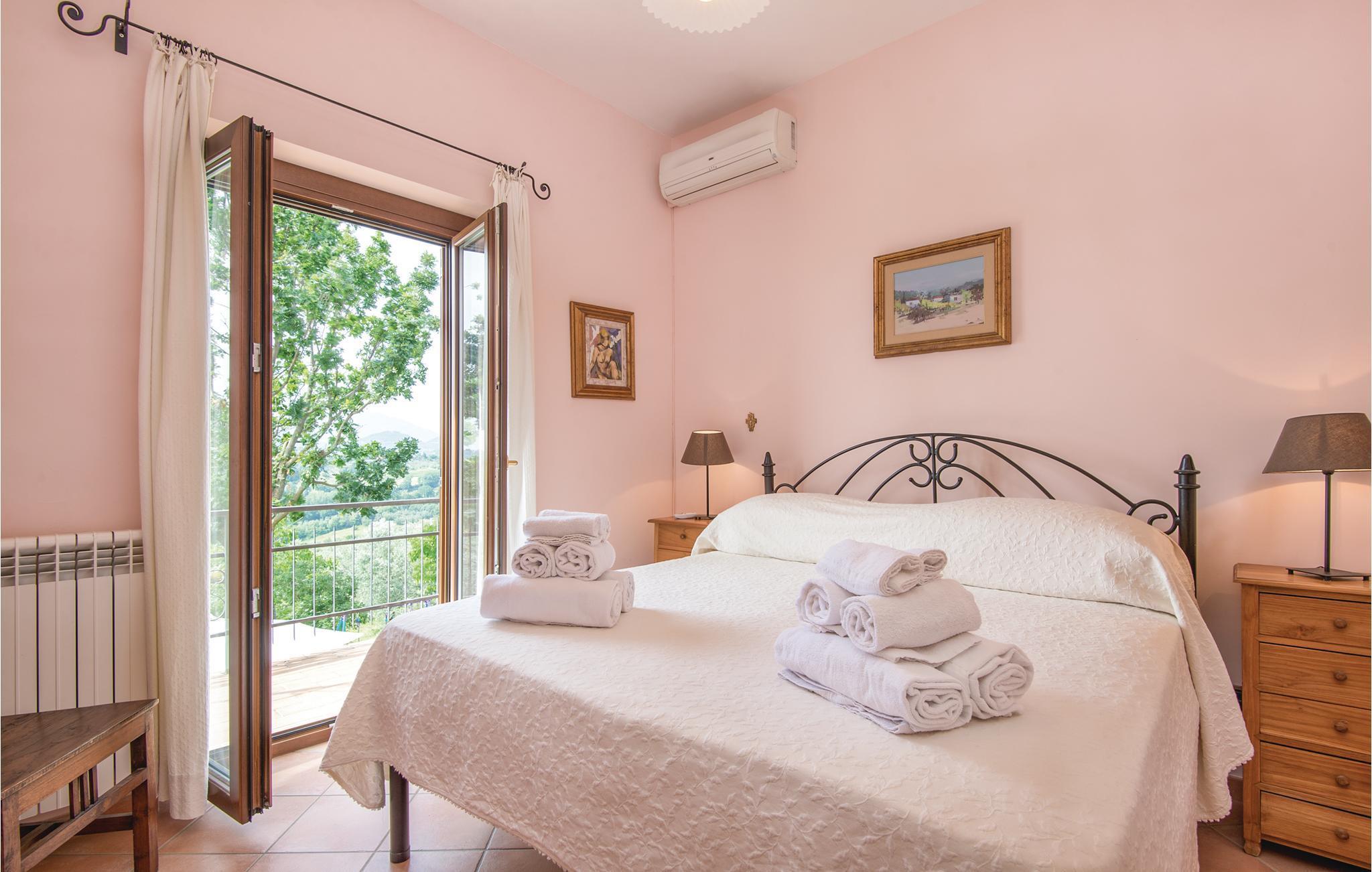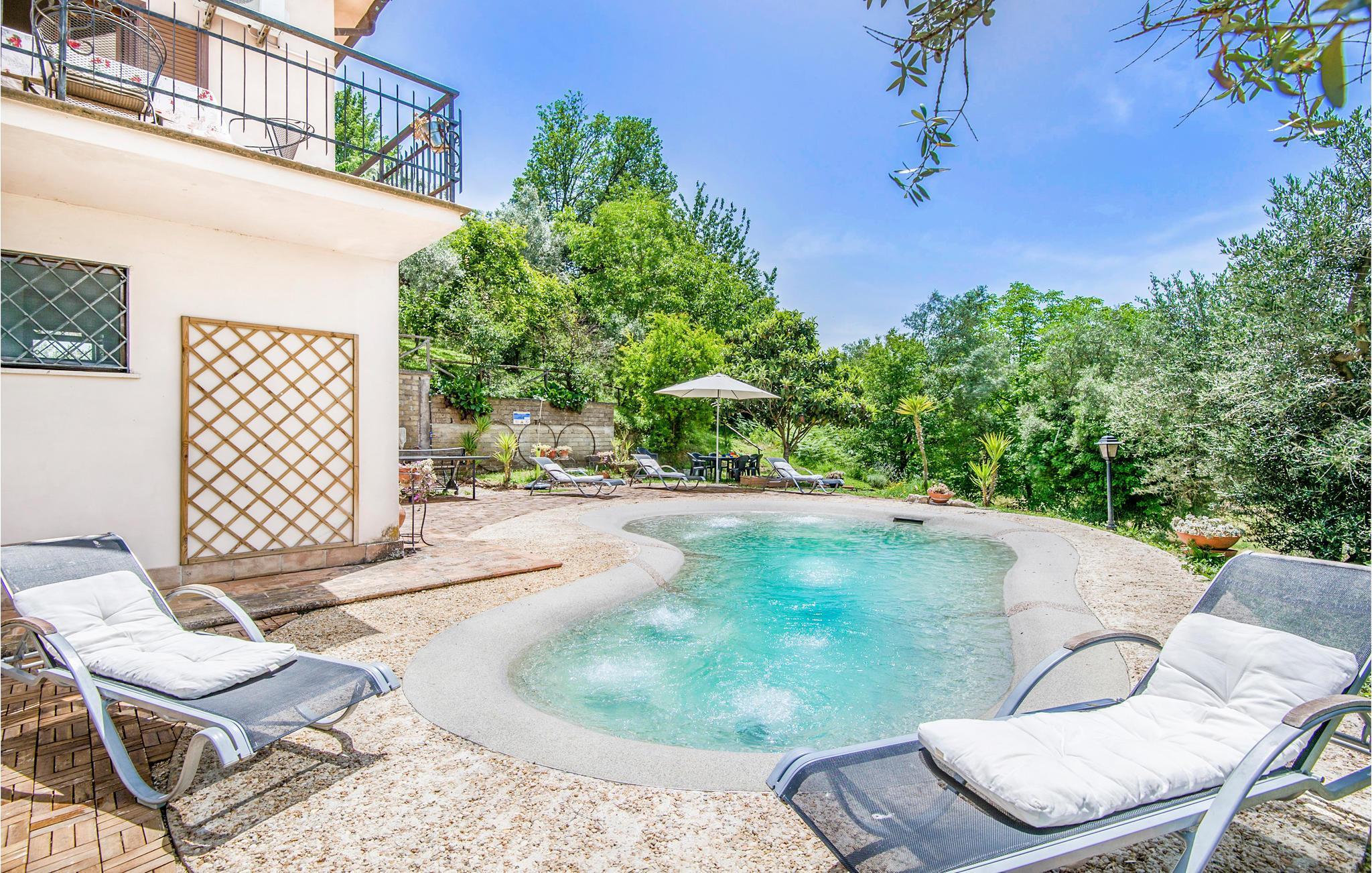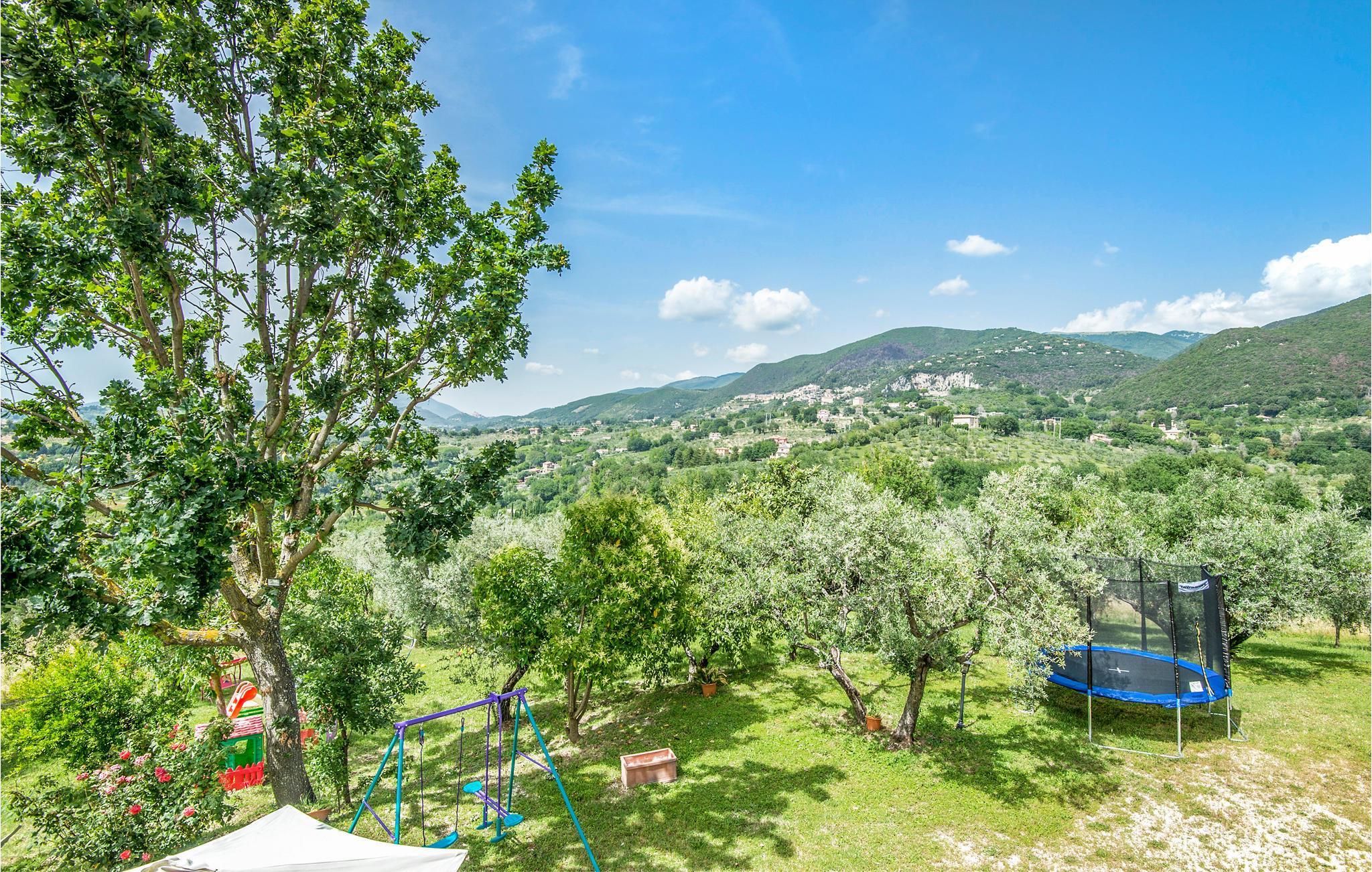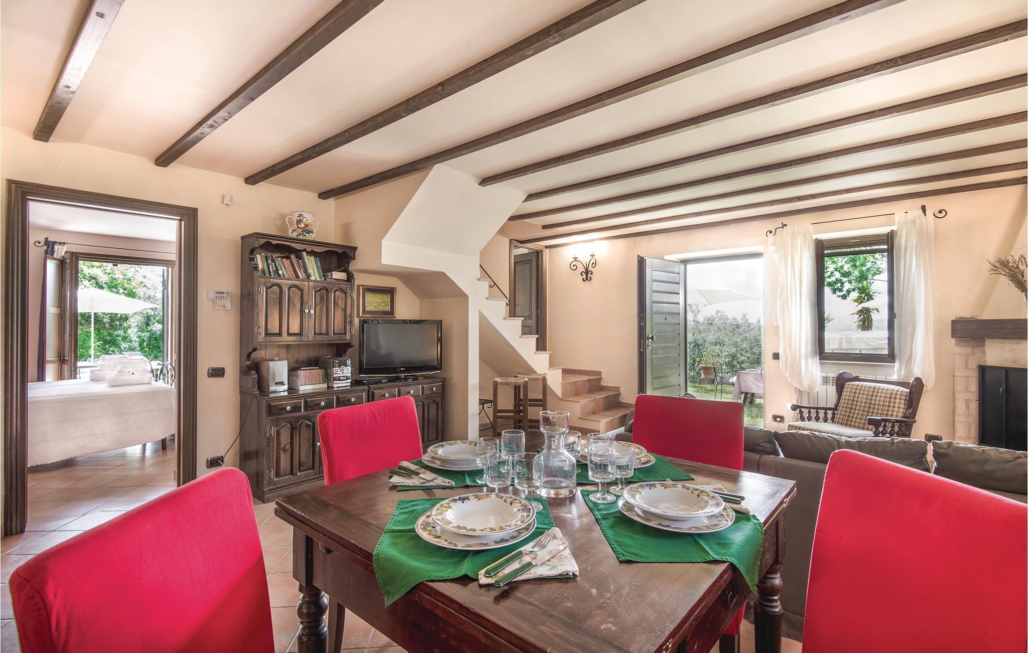 Dette pæne feriehus i det dejlige landskab omkring Rieti, 1,3 km fra Poggio Mirteto og 2,5 km fra Poggio Catino, ligger panoramisk på grunden af et landbrug. Ud over frugttræer, palmetræer og hasselnødder dyrker ejerne også en uforlignelig olivenolie, olio extra vergine d’oliva. I når Rom på kun en times kørsel eller nemt med toget, da en lille station ligger kun ti minutters kørsel herfra. Her er I på rette sted til at nå det nordlige Lazio, den antikke region Tuscia med Viterbo (71 km) eller det nære Umbrien (Orvieto 87 km, Narni 50 km). Huset ligger på godsets grund, men med egen indkørsel og privat indgang, der lover absolut privatsfære. En have med oliven- og frugttræer omgiver huset. Til rådighed for jer står også en pool, hvis vand er lyserødt af himalayasalt, og som har boblefunktion over det hele. Dertil råder I over en grill og havemøbler på en patio med udsigt over bakkerne og poolen.