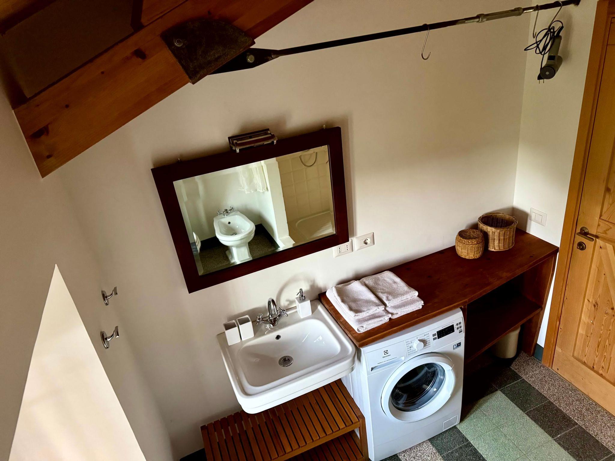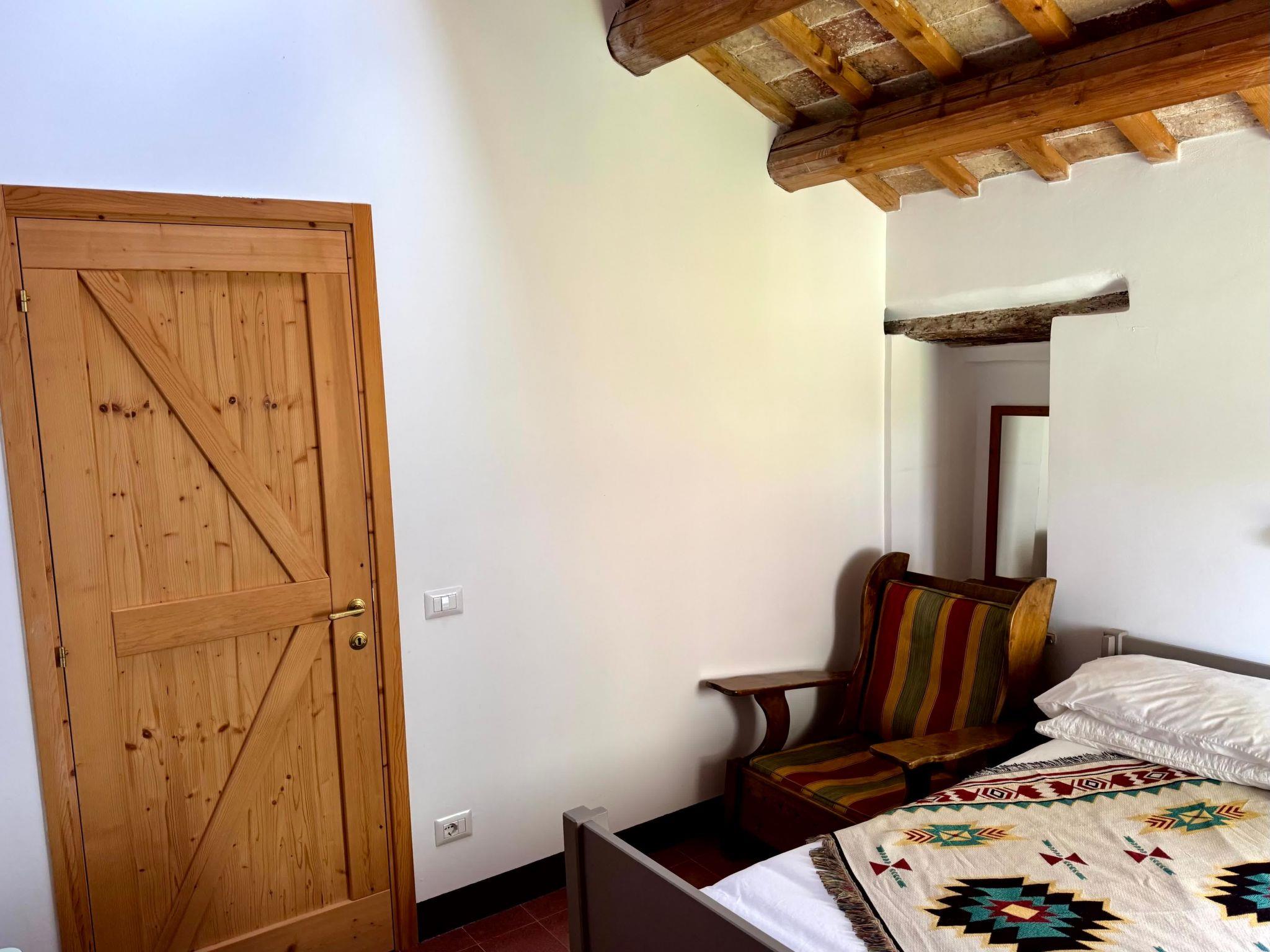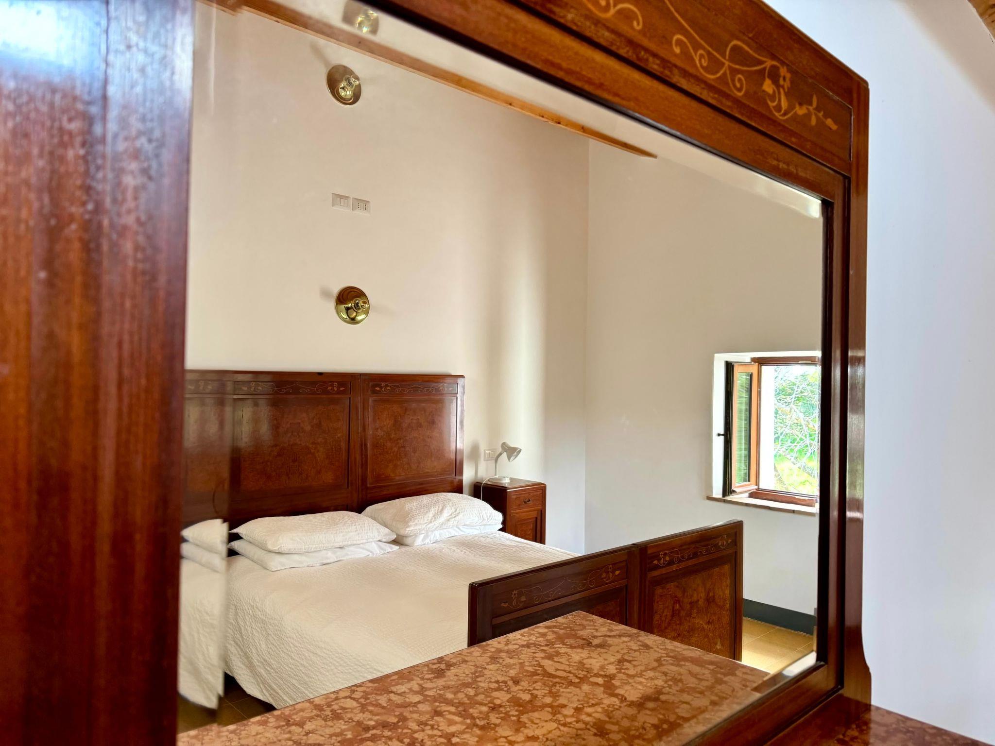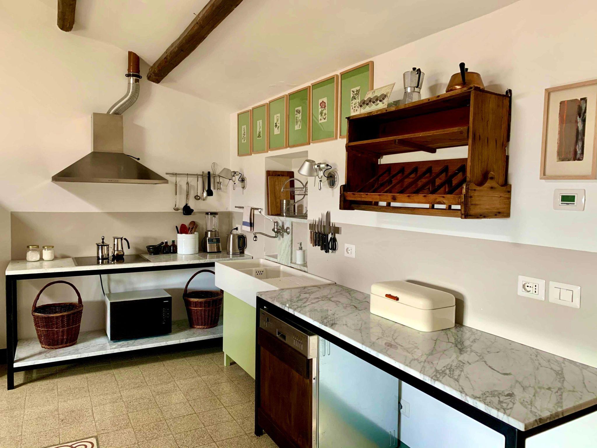 The central parlour with its eat-in kitchen is the heart of the house, where guests sit at an old cherry wood table from the 18th century, on whose marble top pasta used to be rolled out. The terrazzo tile floors are handmade and come from a traditional regional company. An open fireplace and air conditioning ensure a cosy atmosphere. The kitchen is well equipped, including an induction hob, extractor bonnet, toaster, kettle, high-quality cookware and white porcelain.
