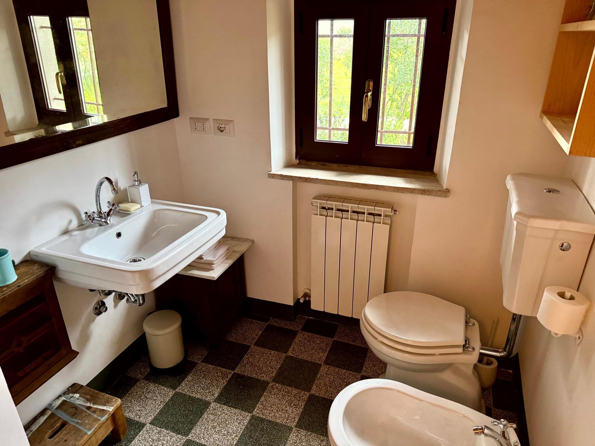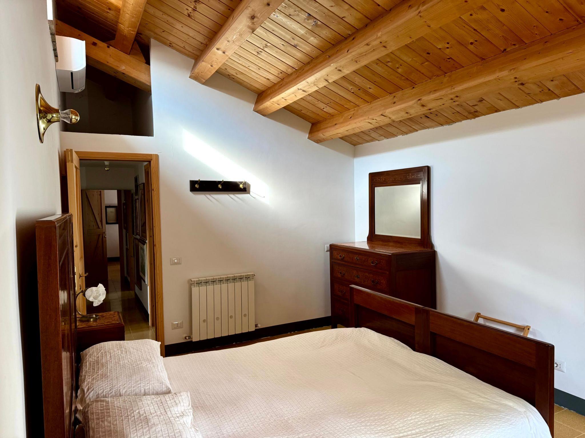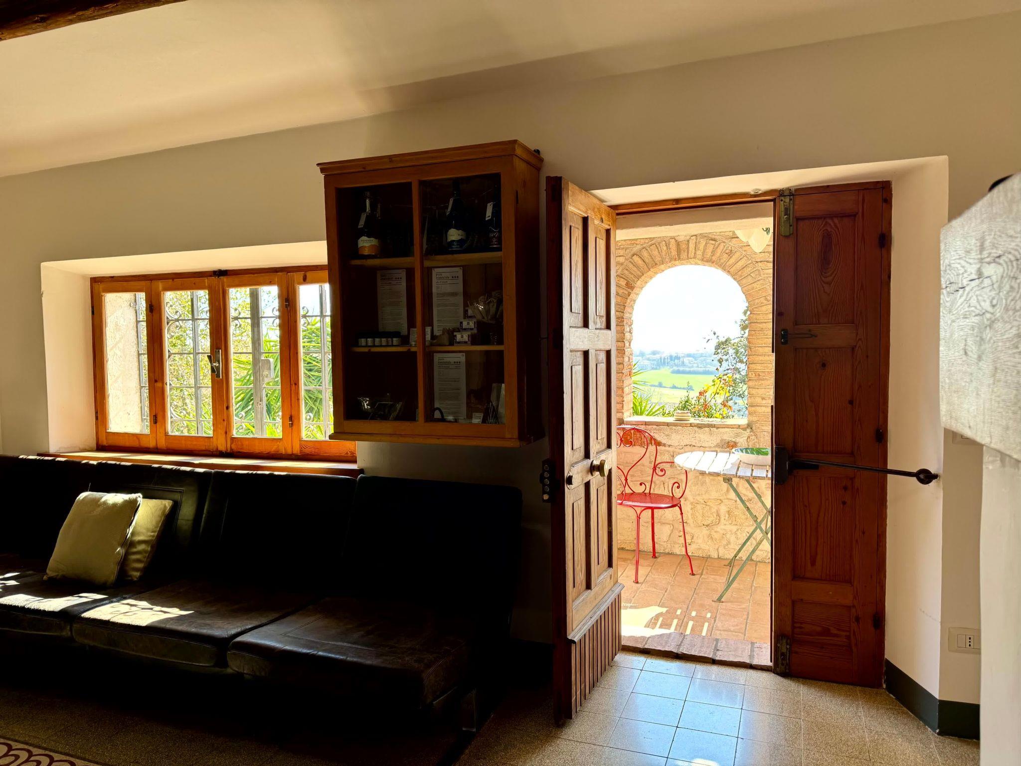 The central parlour with its eat-in kitchen is the heart of the house, where guests sit at an old cherry wood table from the 18th century, on whose marble top pasta used to be rolled out. The terrazzo tile floors are handmade and come from a traditional regional company. An open fireplace and air conditioning ensure a cosy atmosphere. The kitchen is well equipped, including an induction hob, extractor bonnet, toaster, kettle, high-quality cookware and white porcelain.