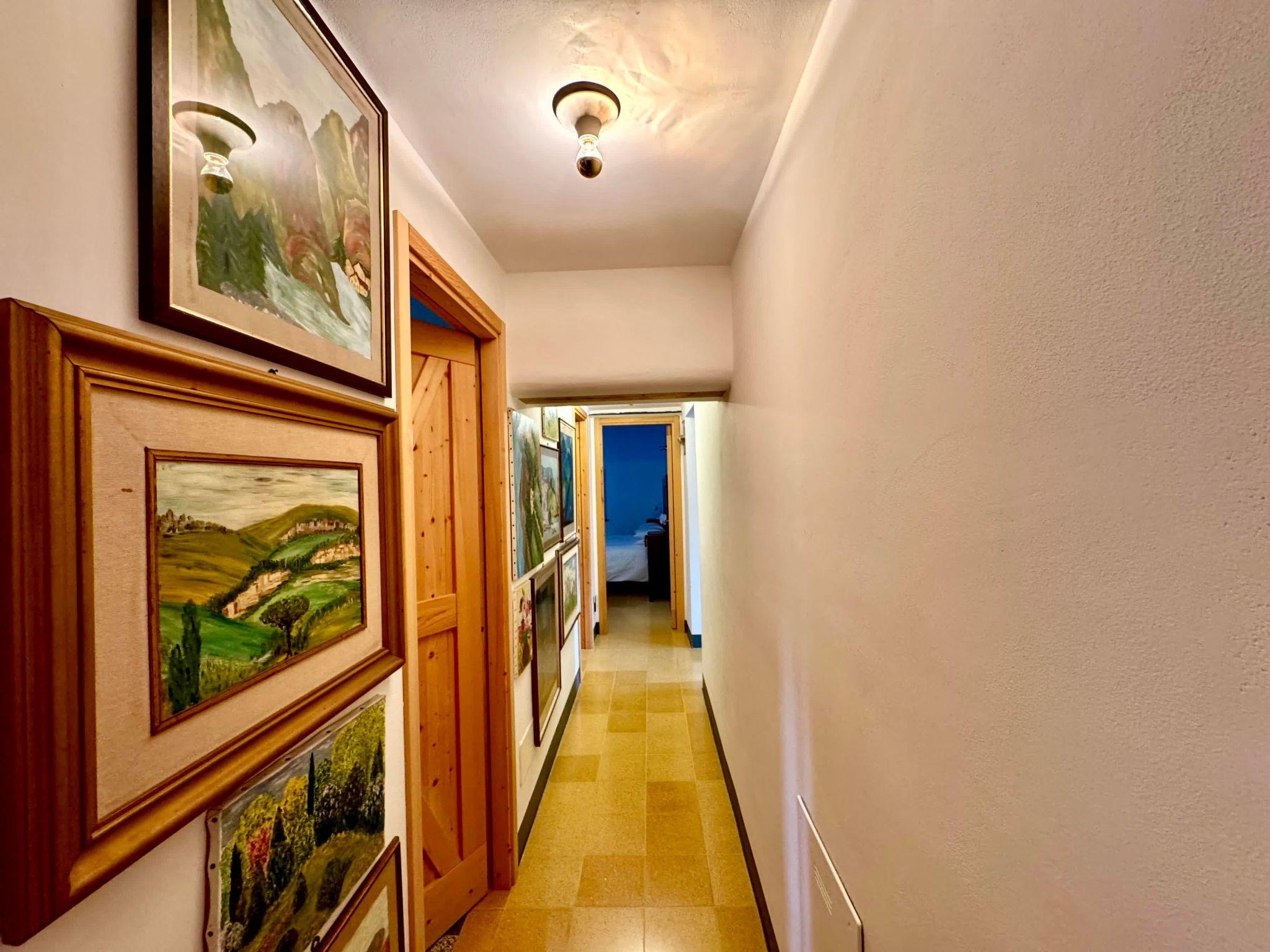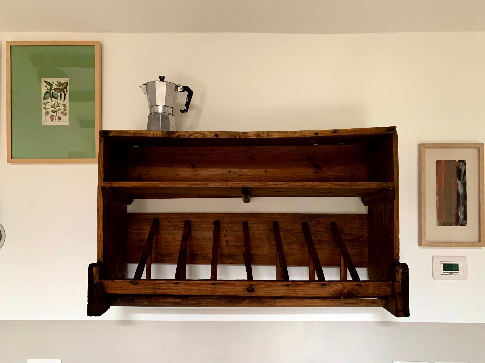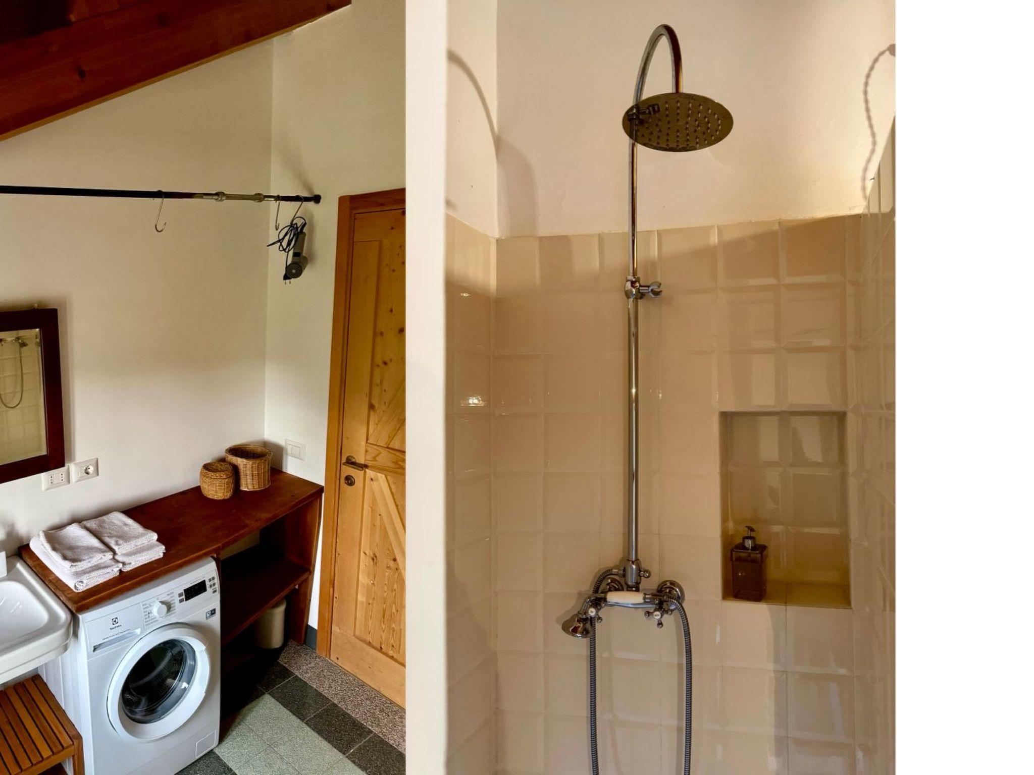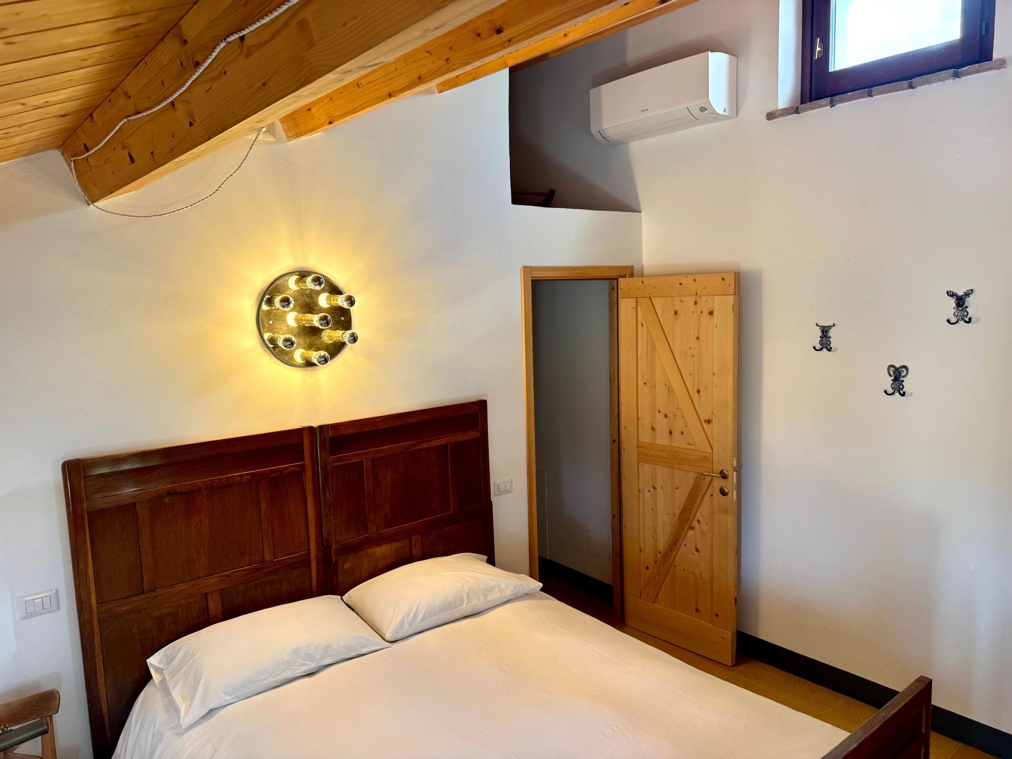 The central parlour with its eat-in kitchen is the heart of the house, where guests sit at an old cherry wood table from the 18th century, on whose marble top pasta used to be rolled out. The terrazzo tile floors are handmade and come from a traditional regional company. An open fireplace and air conditioning ensure a cosy atmosphere. The kitchen is well equipped, including an induction hob, extractor bonnet, toaster, kettle, high-quality cookware and white porcelain.