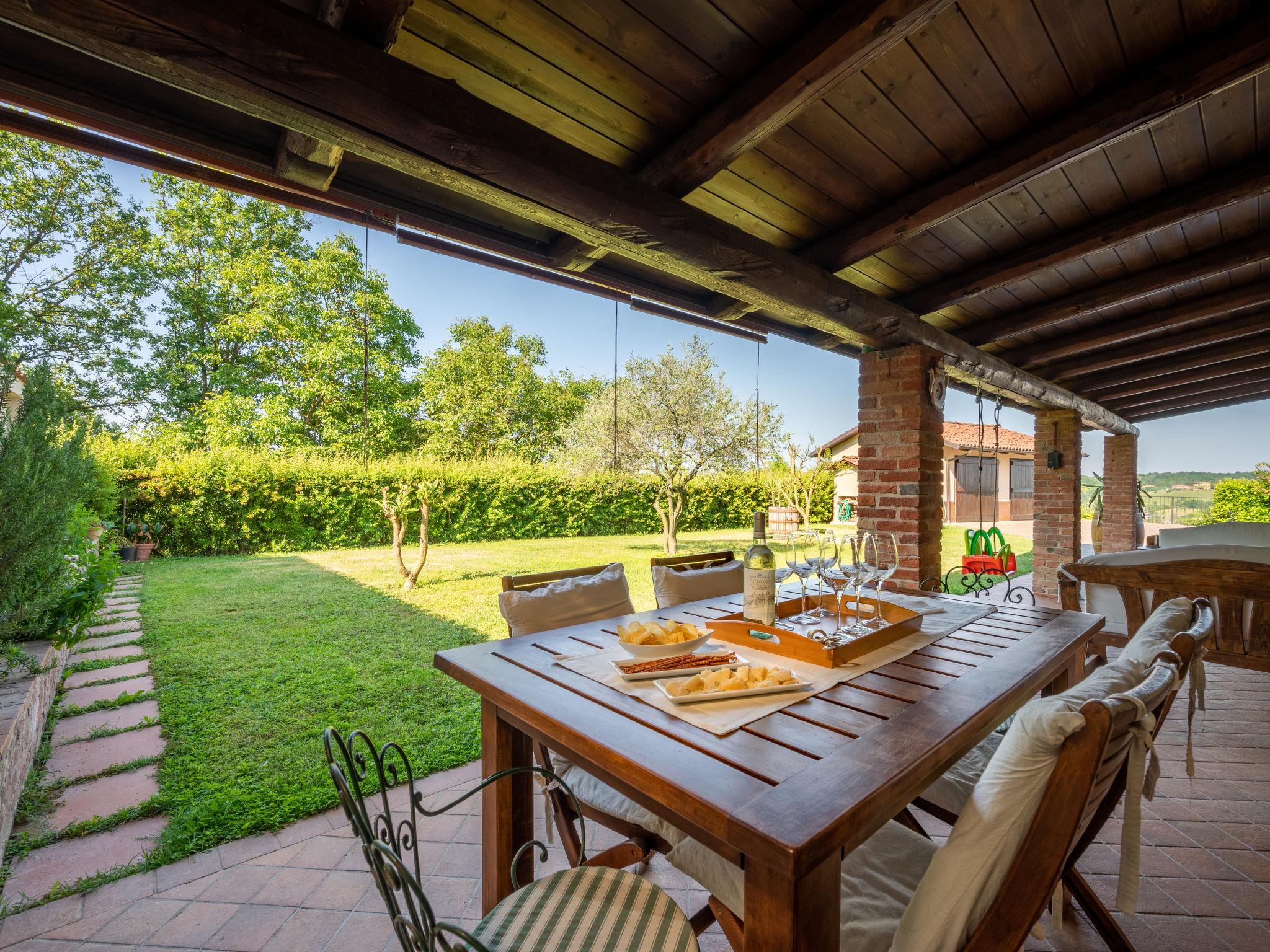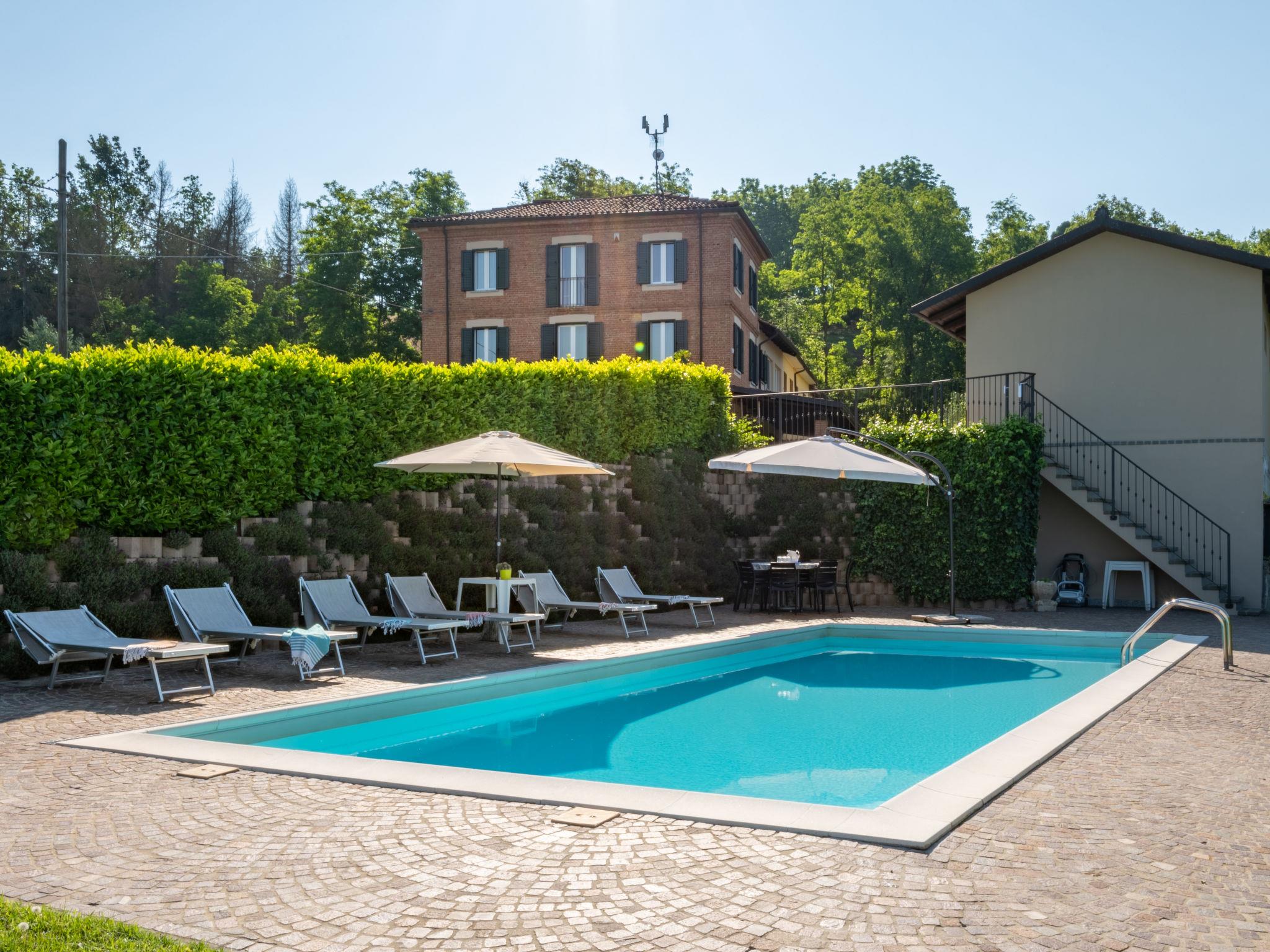 Very comfortable cottage "Marmorito", semi-detached, surrounded by meadows and fields. 3 km from the centre of Portacomaro, 9 km from the centre of Asti, 40 km from the centre of Alba, residential area (villas). Private: property 3'000 m2 (fenced), well-kept garden with lawn and wildlife garden, swimming pool (12 x 5 m, depth 100 - 200 cm, seasonal availability: 05.Apr. - 30.Oct.). Shower/WC in the pool area, outdoor shower, pool maintenance by the owner/gardener. In the house: fitness room, table football. Parking at the house on the premises. Shop 3 km, supermarket 6 km, bus stop 1.7 km, railway station "Asti" 9 km. Golf course (18 hole) 18 km. Please note: car recommended. Part of the house is closed and unoccupied.