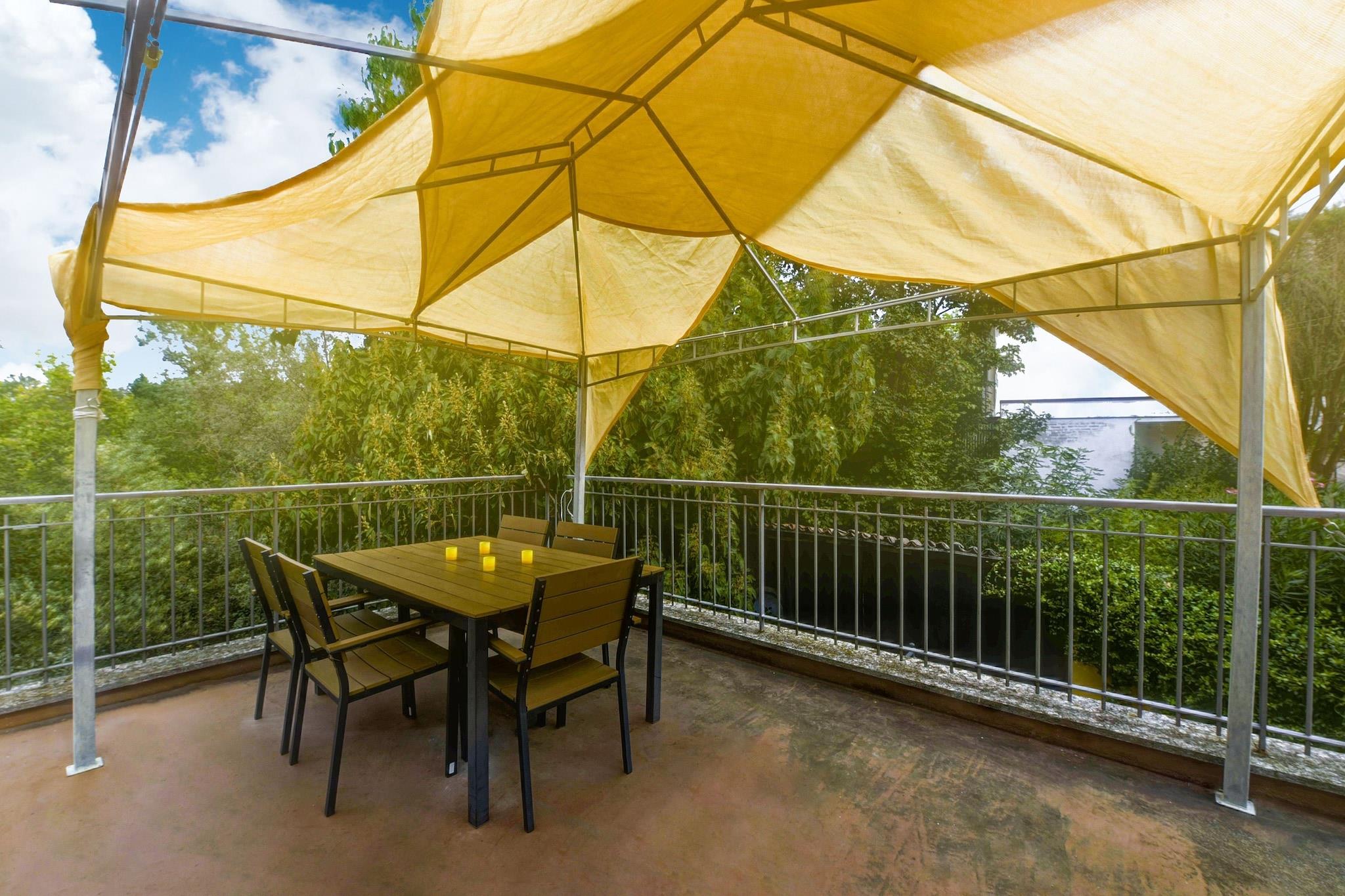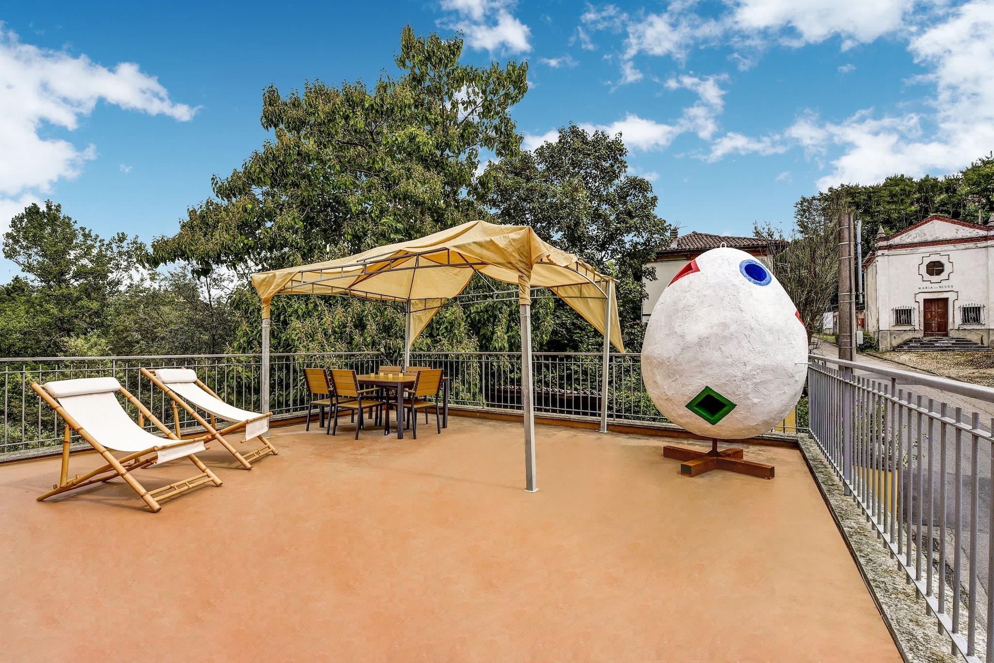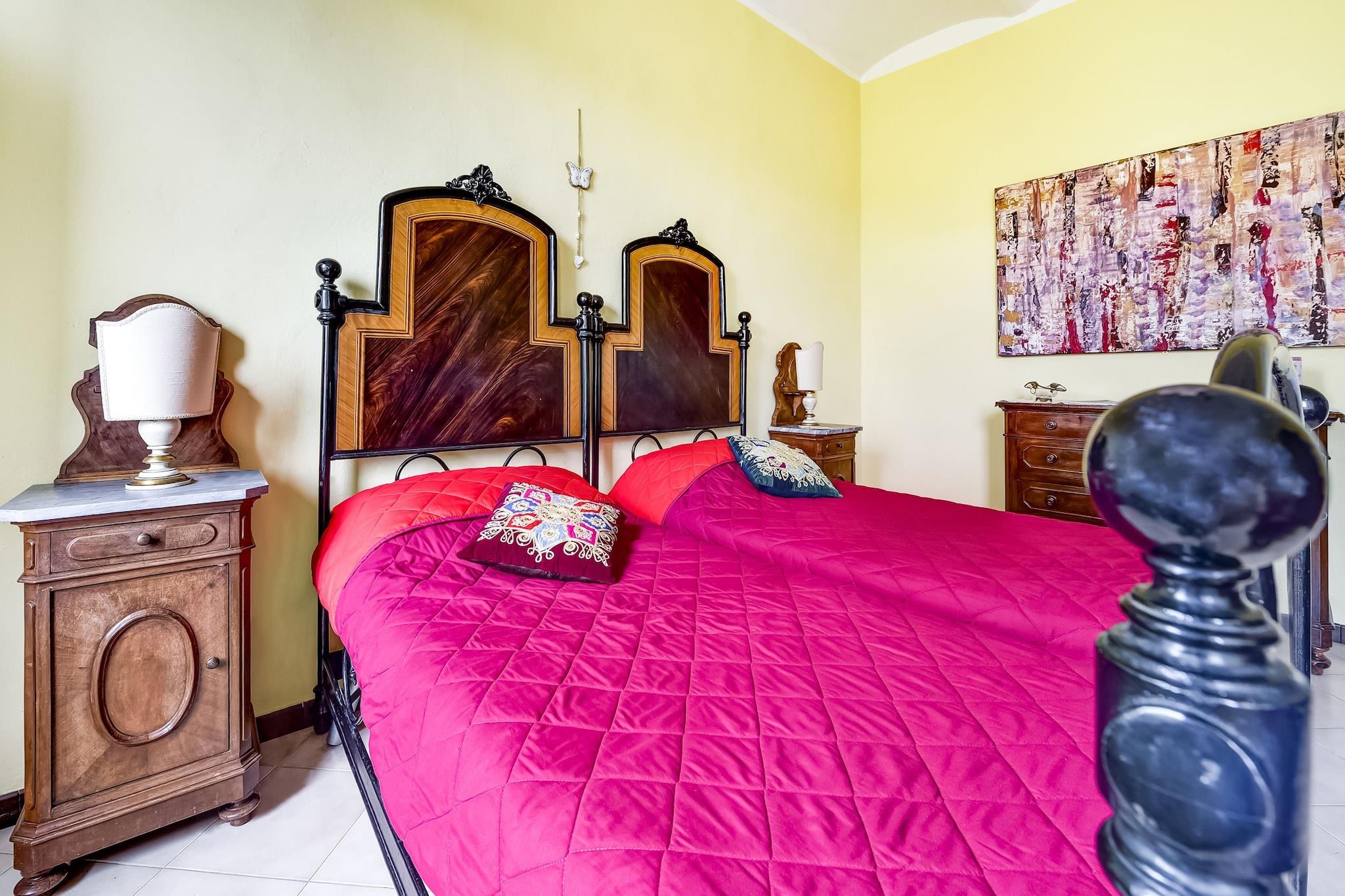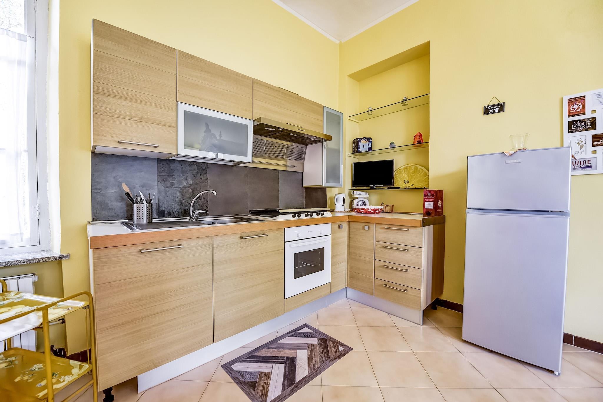 På 1. etage: (gang, Stue(dobbeltsovesofa, spisebord, sofahjørne), åbent køkken(Fjernsyn, kogeplade, elkedel, emhætte, ovn, køle-fryseskab, håndvask), soveværelse(dobbeltseng eller 2 enkeltsenge Senge, Fjernsyn), badeværelse(bruser, håndvask, toilet, bidet), terrasse(privat, indhegnet, 30 m2), havemøbler) vaskerum (vaskemaskine(deles med andre gæster)), sal(deles med andre gæster)(spisebord, pejs, kakkelovn, håndvask), opholdsrum(deles med andre gæster), have(deles med andre gæster), havemøbler, grill(deles med andre gæster), parkering