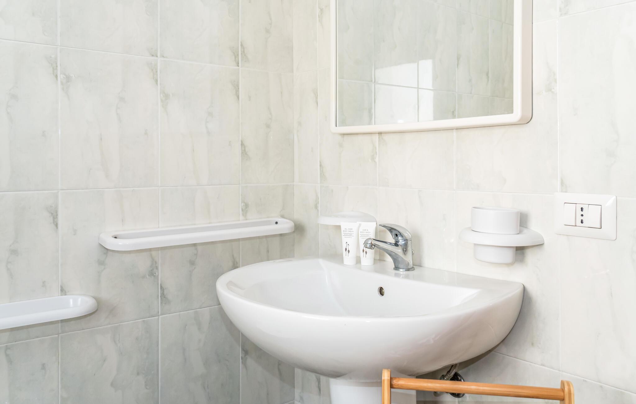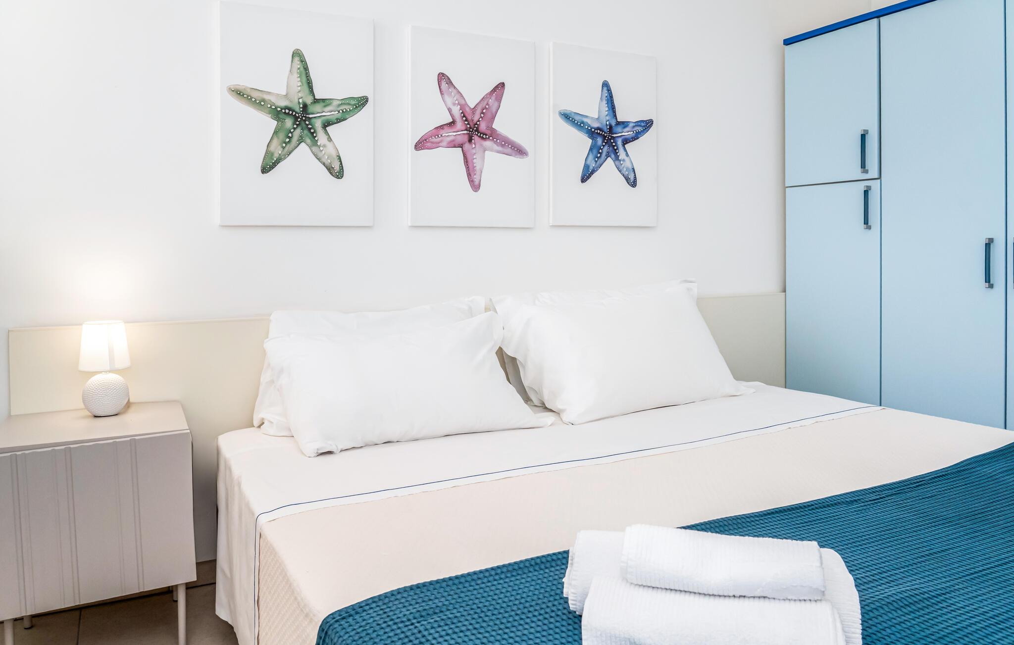 Træd ind i jeres lyse, funktionelt designede ferielejlighed. Tilbered enkle måltider eller snacks til jeres udflugter i det kompakte tekøkken. Sæt jer ved det lille spisebord og Begynd dagene i en afslappet atmosfære. De enkelt møblerede værelser sikrer et ukompliceret ophold.