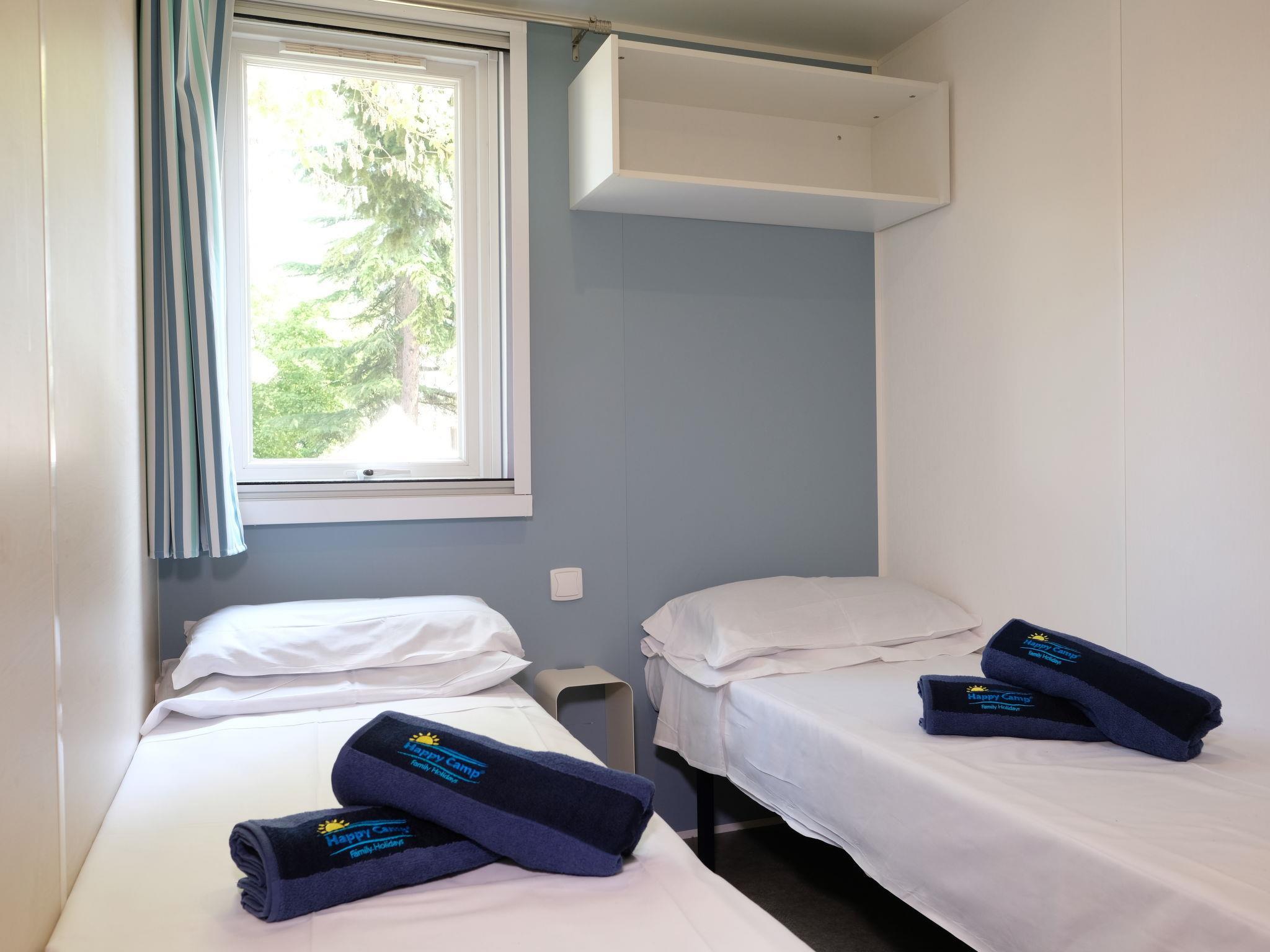 "Happy Premium", 4-room mobile home 30 m2. Comfortable furnishings: living/dining room with electric heating and air conditioning. 1 room with 1 french bed (140 cm, length 190 cm). 2 rooms, each room with 2 beds (70 cm, length 190 cm). Open kitchen (4 hot plates, microwave, freezer, electric coffee machine). Shower/WC. Air-conditioning. Terrace partly roofed. Terrace furniture, electric barbecue (portable), deck chairs (2). Facilities: mosquito net. Parking (1 car) at the house. Please note: non-smokers only. IT075097B100029223