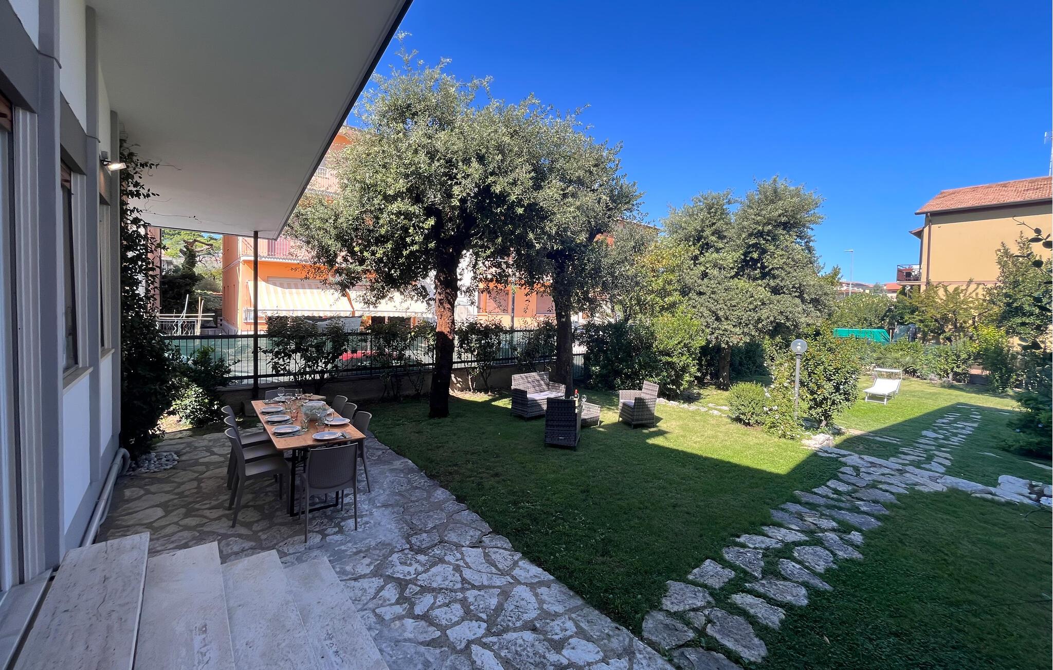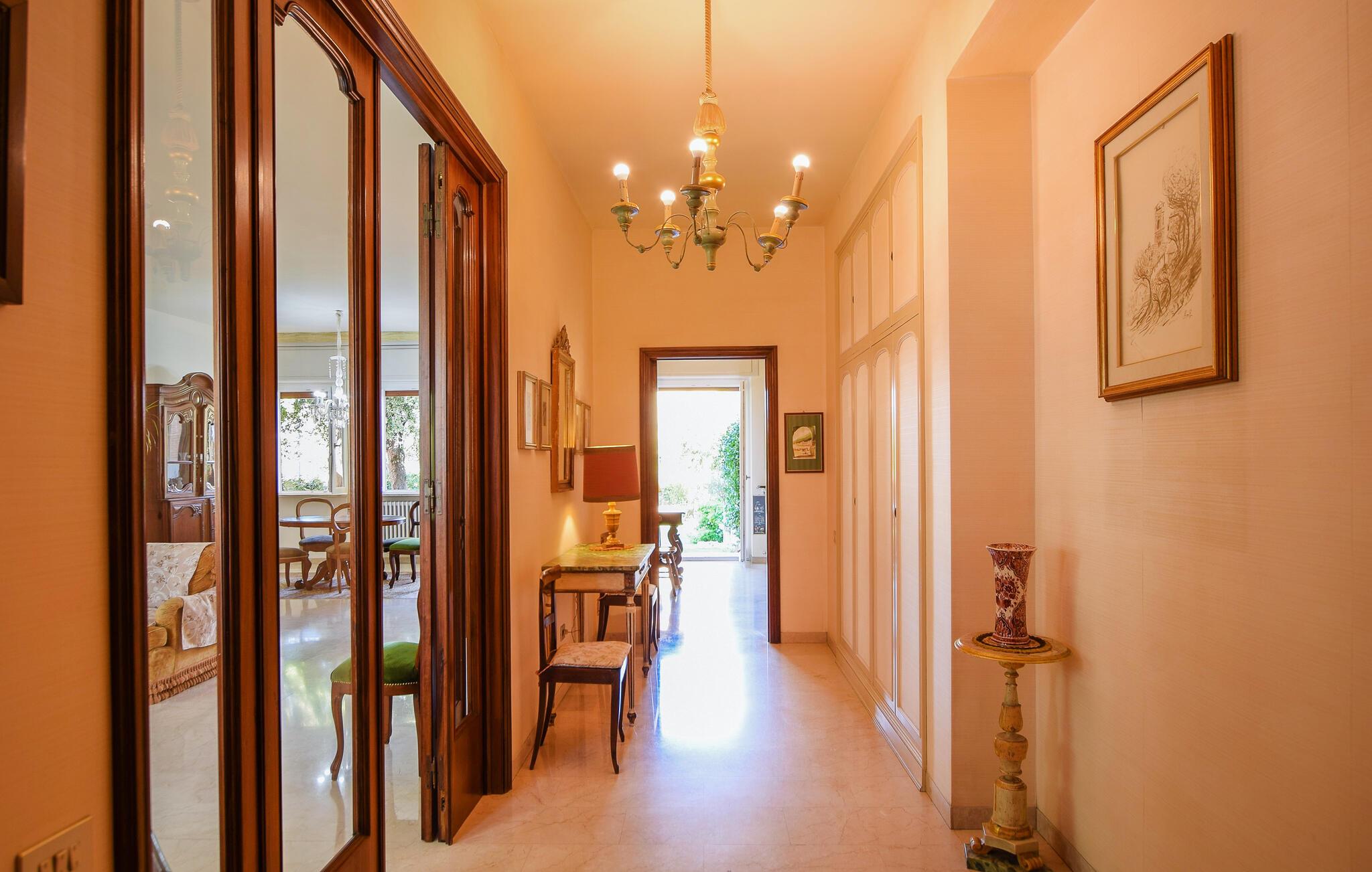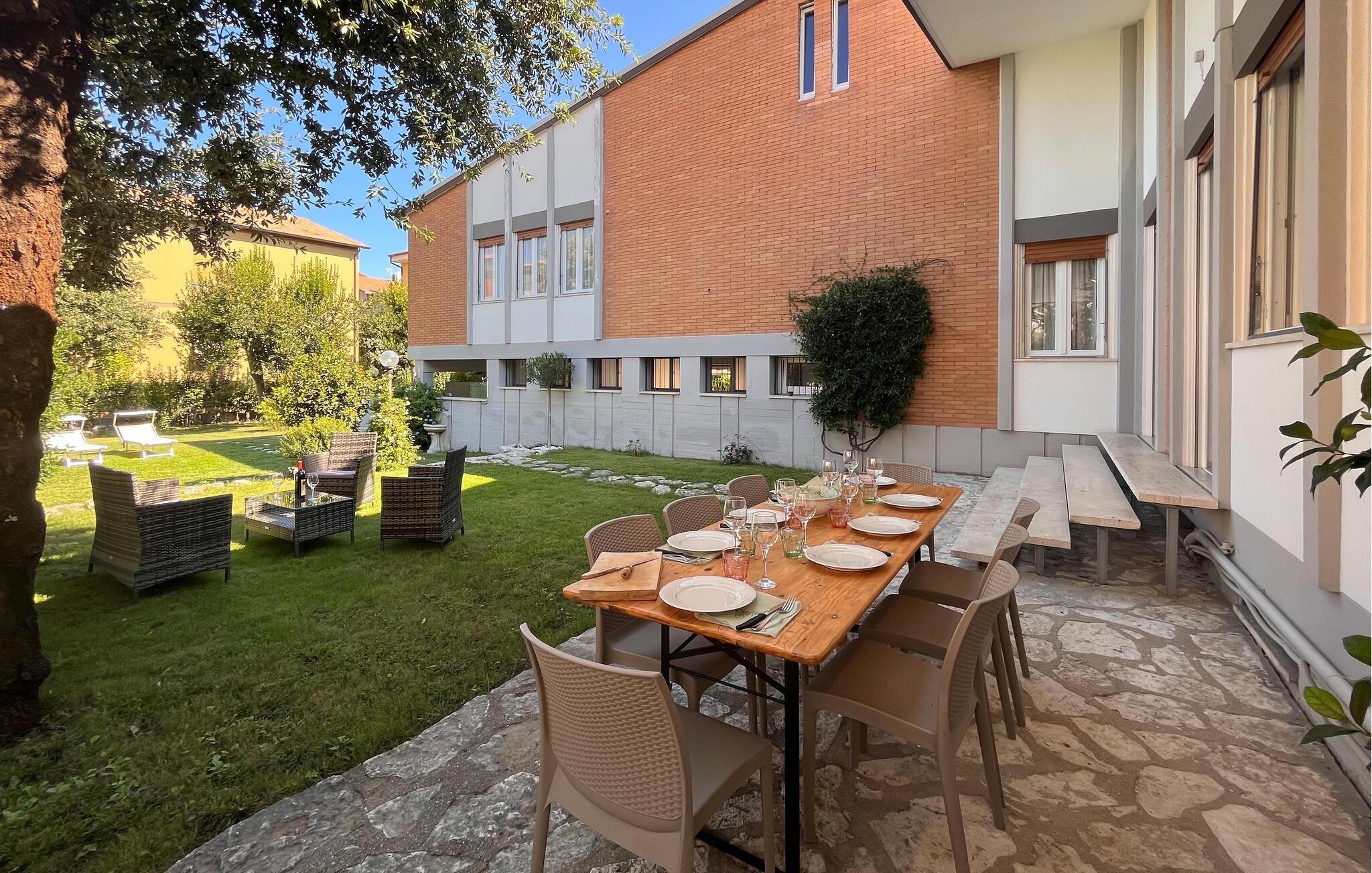 Udenfor er der en stor terrasse med udsigt til den velholdte have - perfekt til hyggelige måltider eller afslappende timer under den italienske sol. Her kan I nyde en pause i stilfulde omgivelser.
