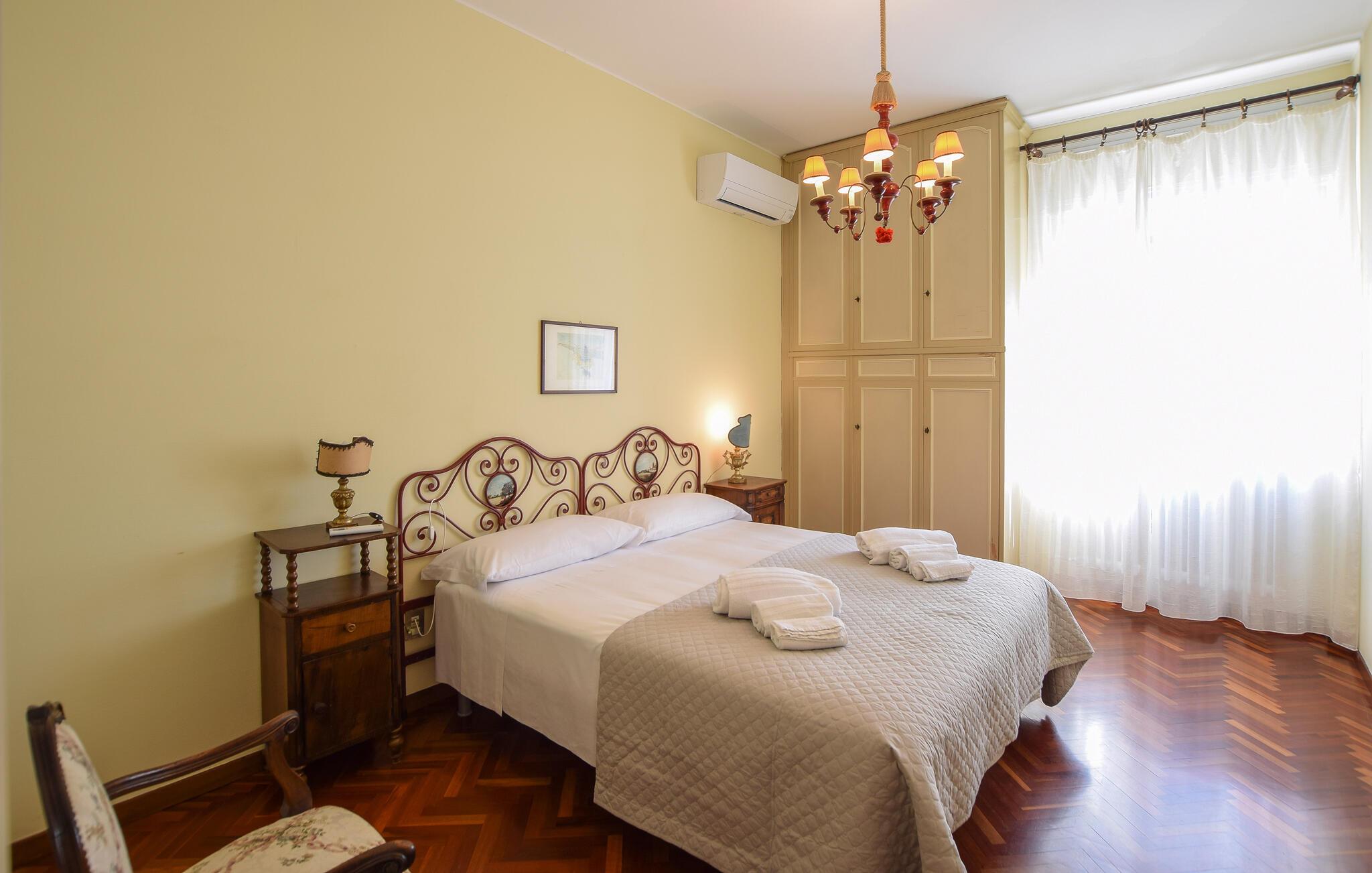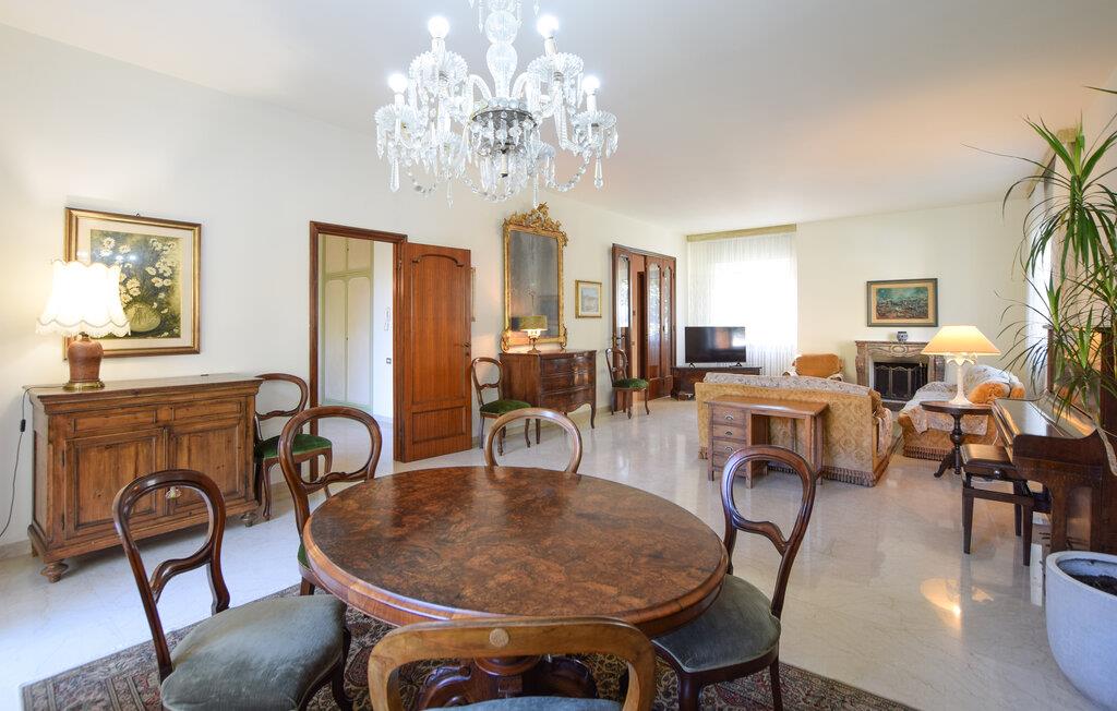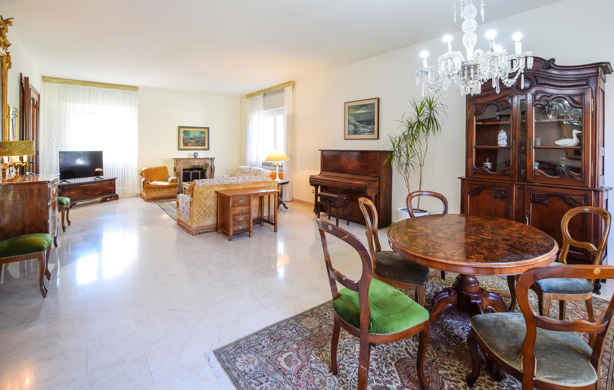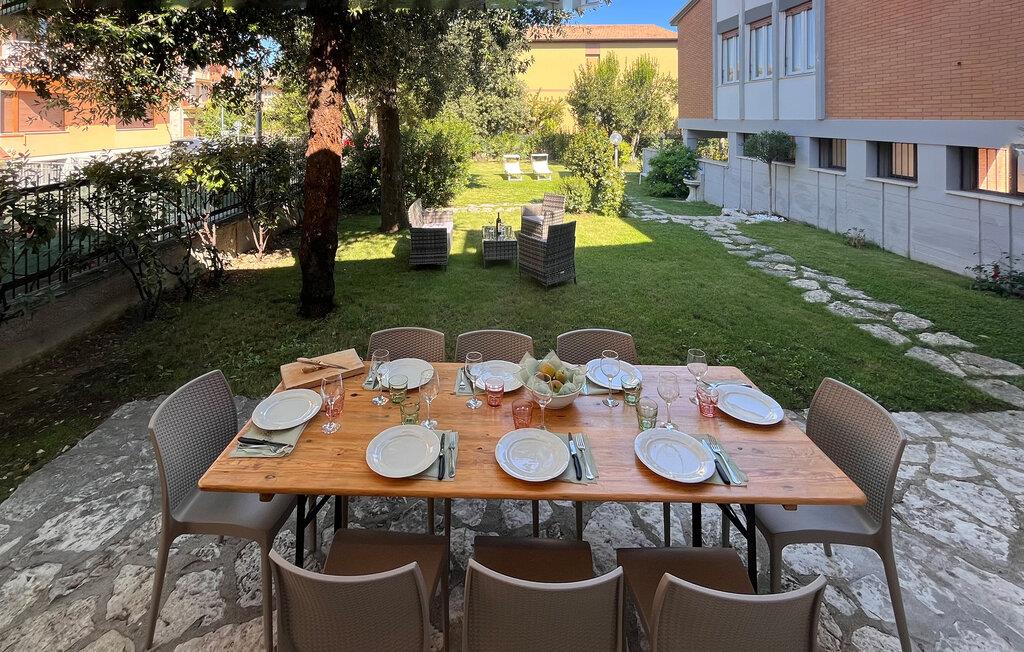 Udenfor er der en stor terrasse med udsigt til den velholdte have - perfekt til hyggelige måltider eller afslappende timer under den italienske sol. Her kan I nyde en pause i stilfulde omgivelser.